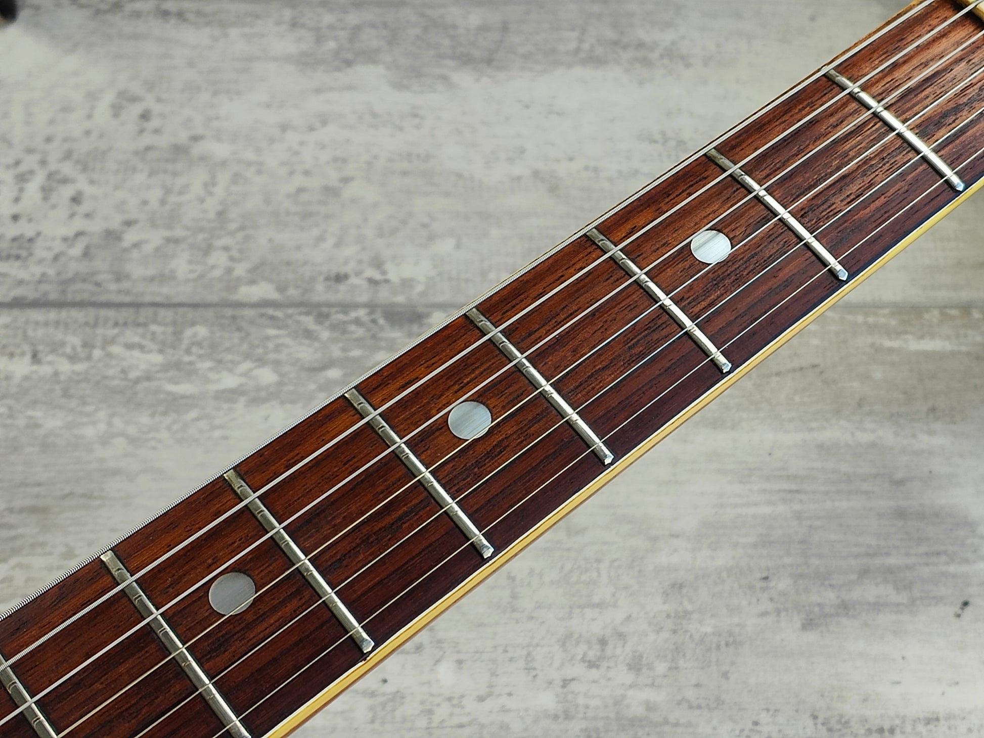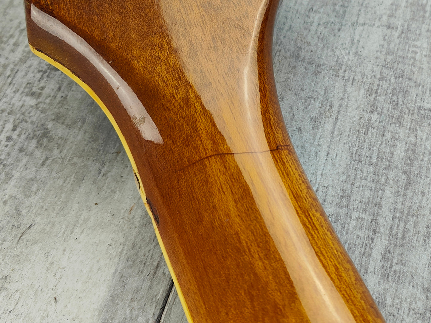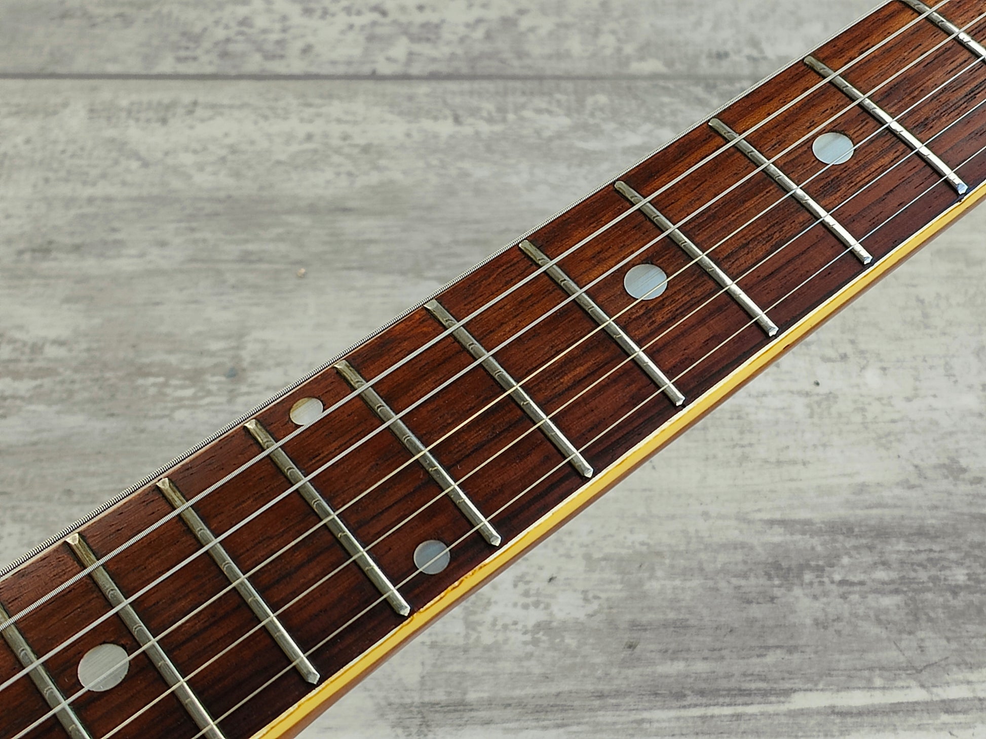 This one received a full deep clean and service prior to listing including a fretboard oil, fret polish, truss adjustment and electronics flush so it's playing nicely and sounding great. The frets are vintage but play smooth and the neck is straight with plenty of life left in the truss rod. The action is a little high and could use a neck shim to correct the angle, however the screws on the neck are slightly stiff and we don't want to risk cracking them as it still plays as it sits. The cosmetic cracks on the neck is purely in the clear coat and has no structural impact on the wood.