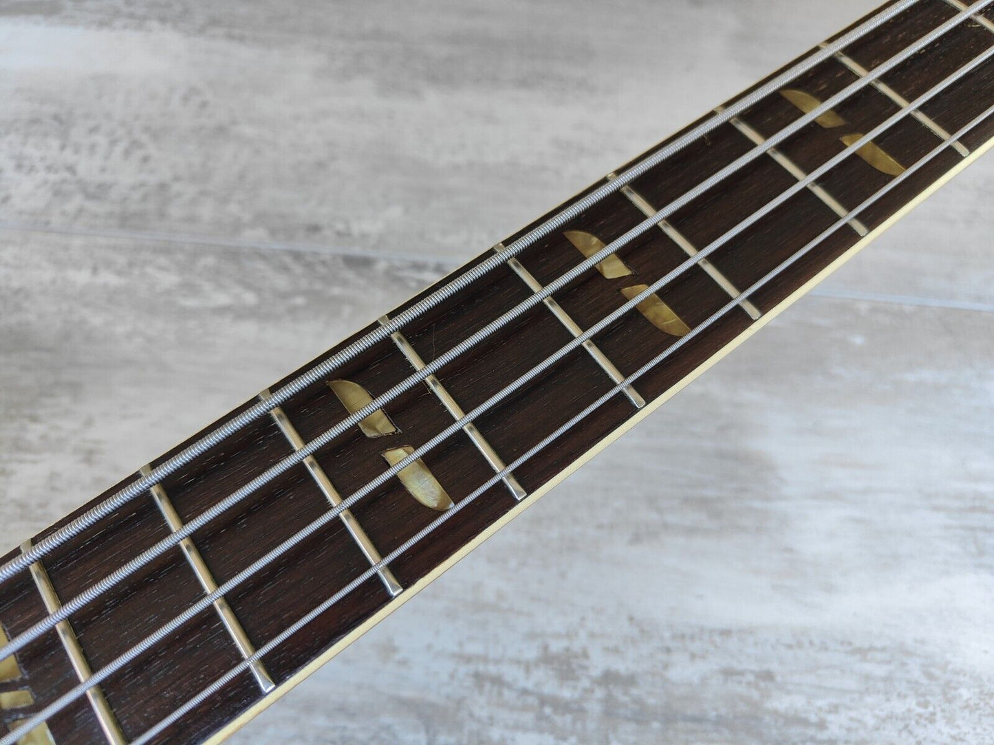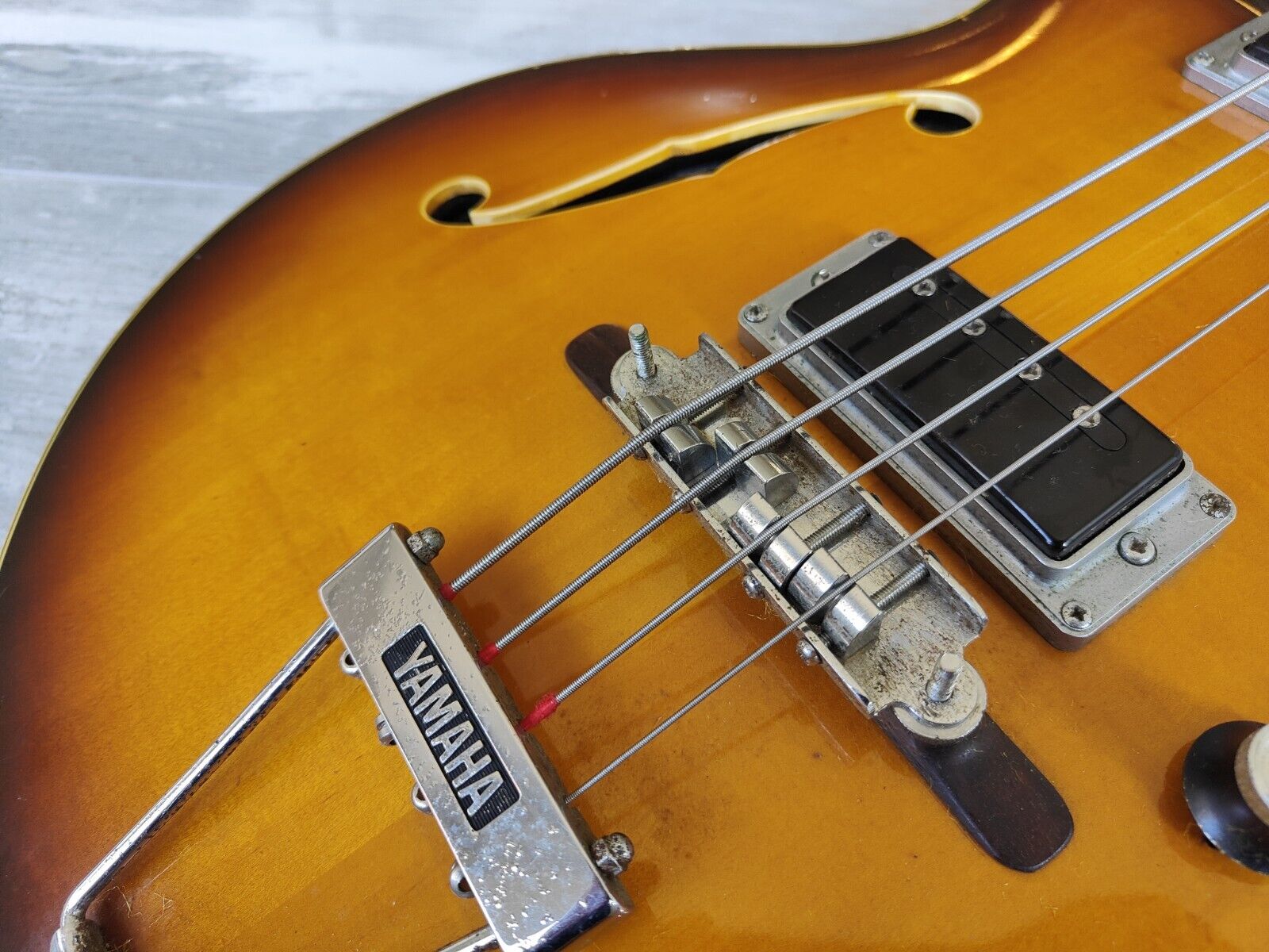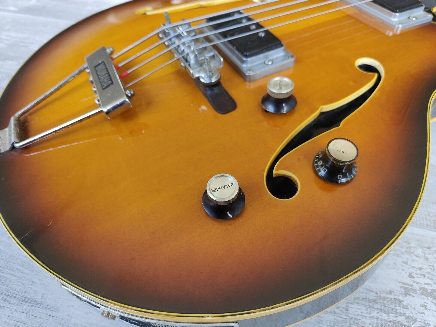 The early model SA-70 hollowbody bass made in Japan by Yamaha in around 1968. Hollowbody (maple) construction with some film in the f-holes to reduce unwanted feedback, maple neck with a short scale (30") rosewood fingerboard, it weighs a reasonable 3.6kg's. The original bass humbuckers sound great with plenty of output, intonate-able bridge adjusts well (missing the cover), volume/tone/balancer knobs work as they should (one knob replaced).