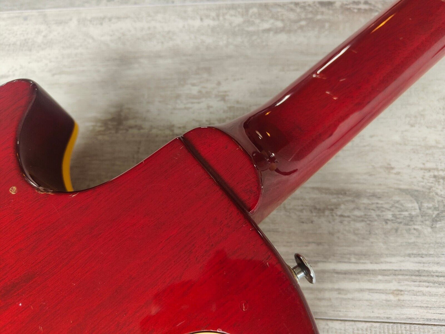 A late 70's model LS-400 from Aria Pro II built by the famous Matsumoku factory. Maple top, mahogany body, slim mahogany neck and a 22 fret rosewood fingerboard, it weighs a comfortable 4kg's. Looks to be all original with the exception of a new switch and output jack along with possibly the strap buttons.