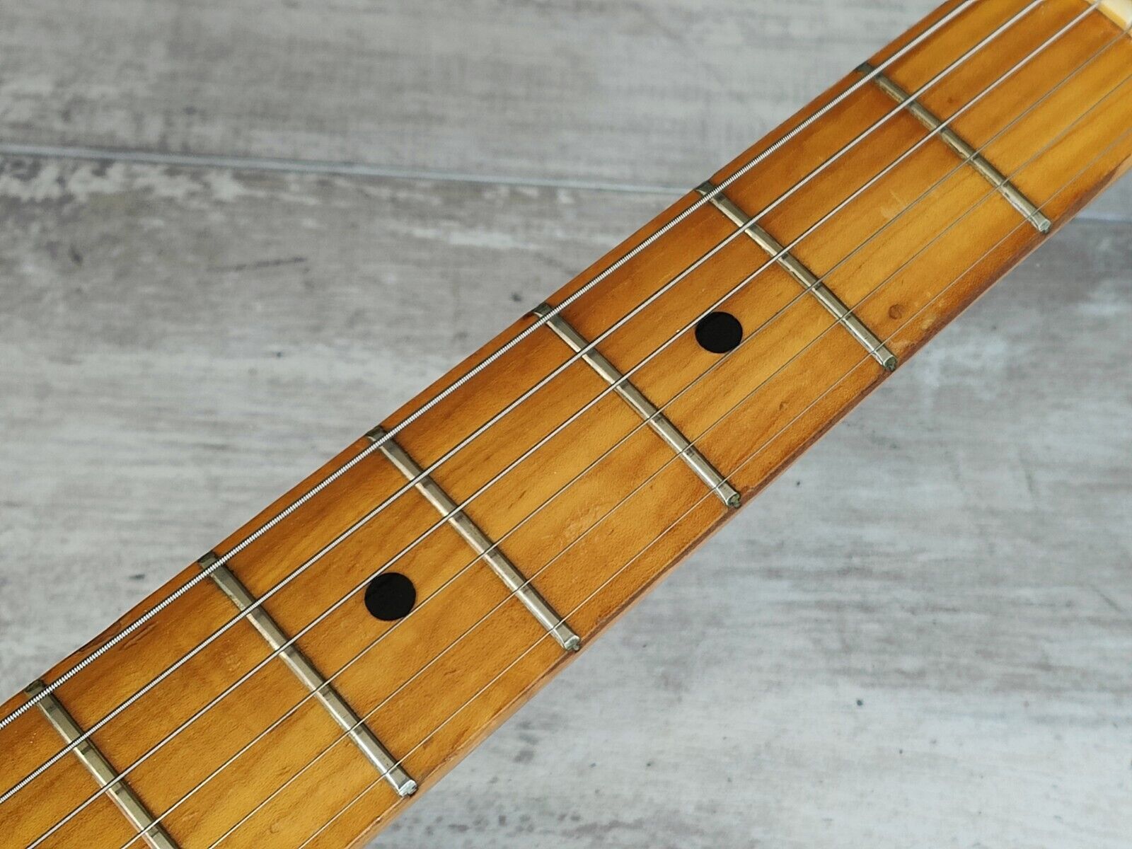 Made in the 1970's, Founder was a sister brand to Yamaki and Joodee and produced guitars mainly sold within Japan. A basic Stratocaster model with similarities to a Greco SE-500, this Founder model has a solid body with a maple neck and maple fingerboard and weighs 3.7kg's. Looks to have had a Graffiti Yellow refinish a while ago (or it's a factory custom colour order) and has had some generic single coils installed at some point.