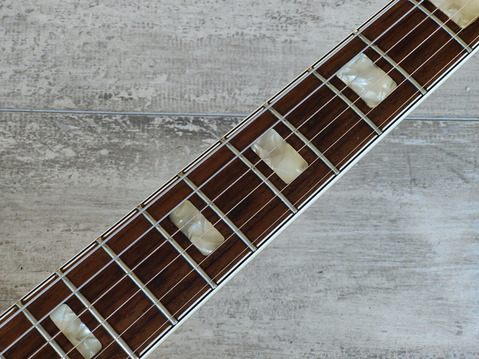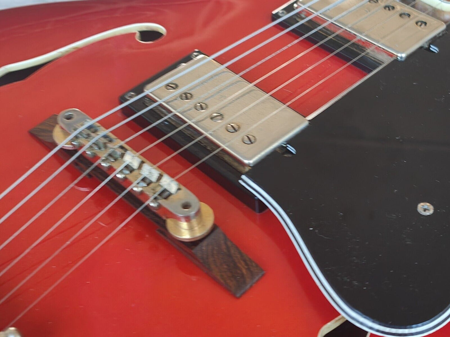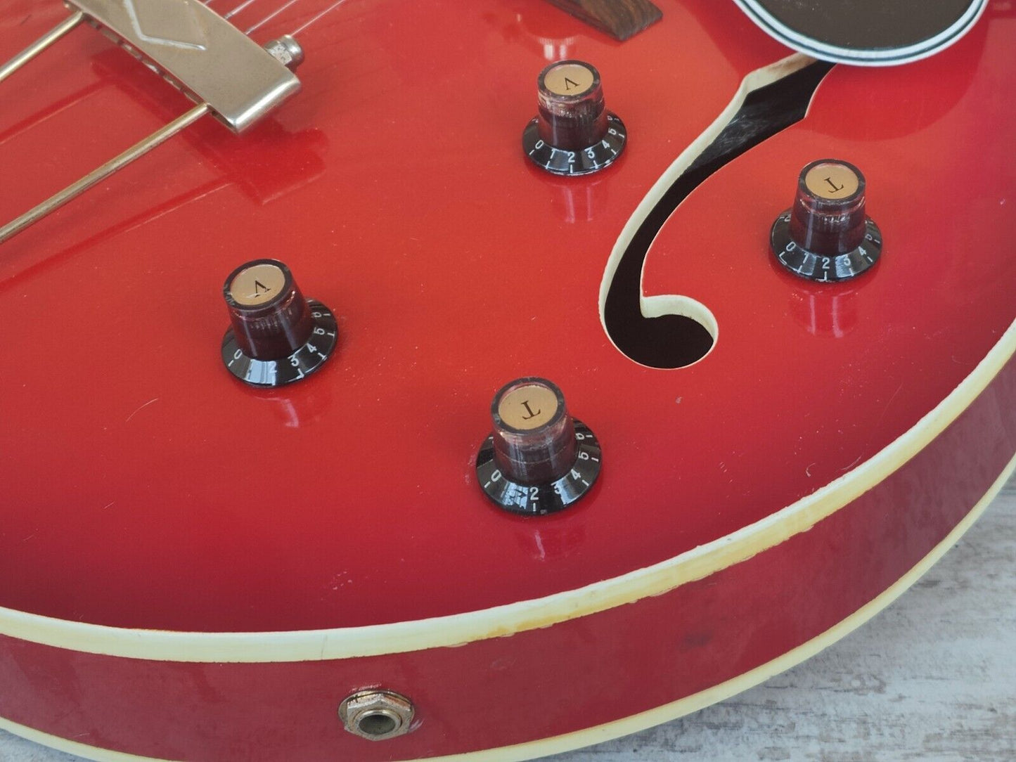 A higher quality build than many Guyatone models, the SG-28 was made by Matsumoku in the early 1970's (rather than the usual Guyatone factory that made most of the entry level models). Bound thinline hollowbody construction with a cherry red finish that has a very subtle burst, slim bolt on maple neck with a triple bound rosewood fingerboard (40mm nut width with a 628mm scale length) loaded with block inlays, weighs a nimble 2.9kg's.