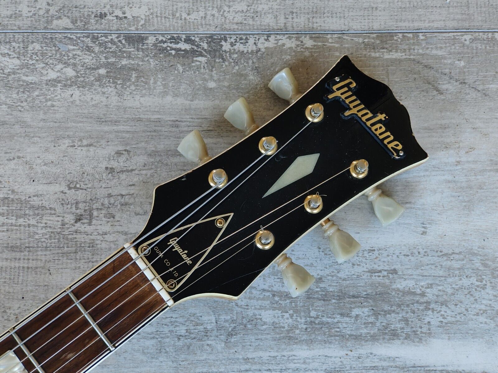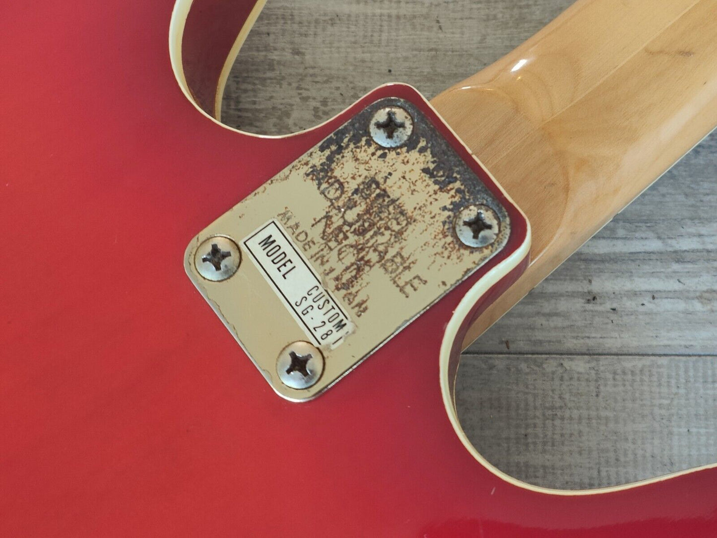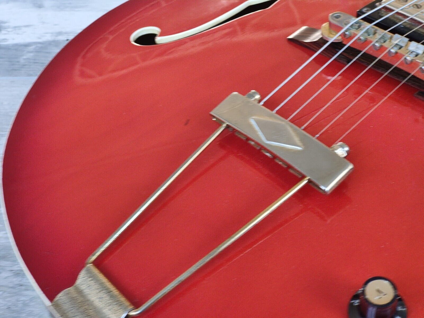 A higher quality build than many Guyatone models, the SG-28 was made by Matsumoku in the early 1970's (rather than the usual Guyatone factory that made most of the entry level models). Bound thinline hollowbody construction with a cherry red finish that has a very subtle burst, slim bolt on maple neck with a triple bound rosewood fingerboard (40mm nut width with a 628mm scale length) loaded with block inlays, weighs a nimble 2.9kg's.