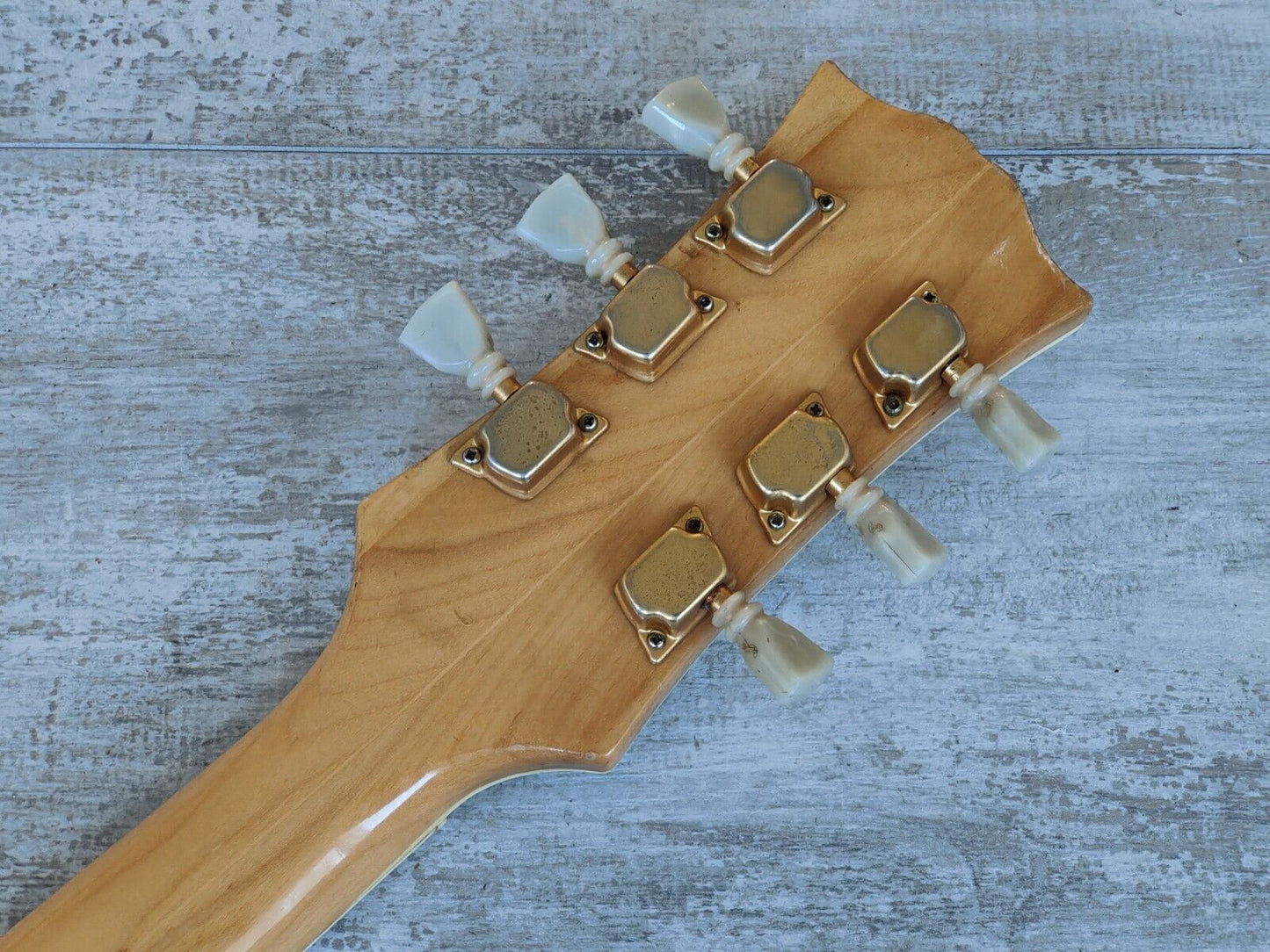 Seems to be all original with two volume and tone knobs and a three-way toggle switch controlling the nice vintage-output Aria humbuckers.