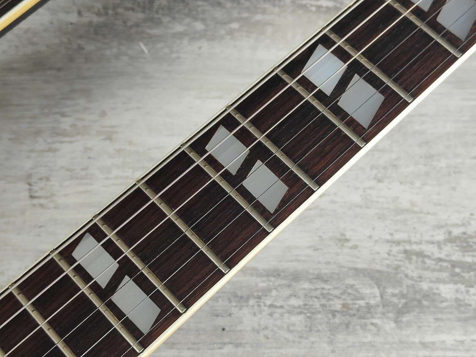 The kind of guitar that almost everyone dreams about but only a select few can actually handle. This is an unknown (headstock logo missing although two small holes remain where the badge would have been) Japanese replica of the Gibson EDS-1275 that was made in the mid 1970's. A big beefy mahogany body with two bolt-on maple necks and 20 fret rosewood fingerboards, it weighs 5.7kg's. This one wears all the Gibson trimmings including an open-book headstock and split inlays, it appears all original with Maxon made humbuckers (chrome covered on the 12 and zebra uncovered on the 6) that have plenty of clarity and bite.
