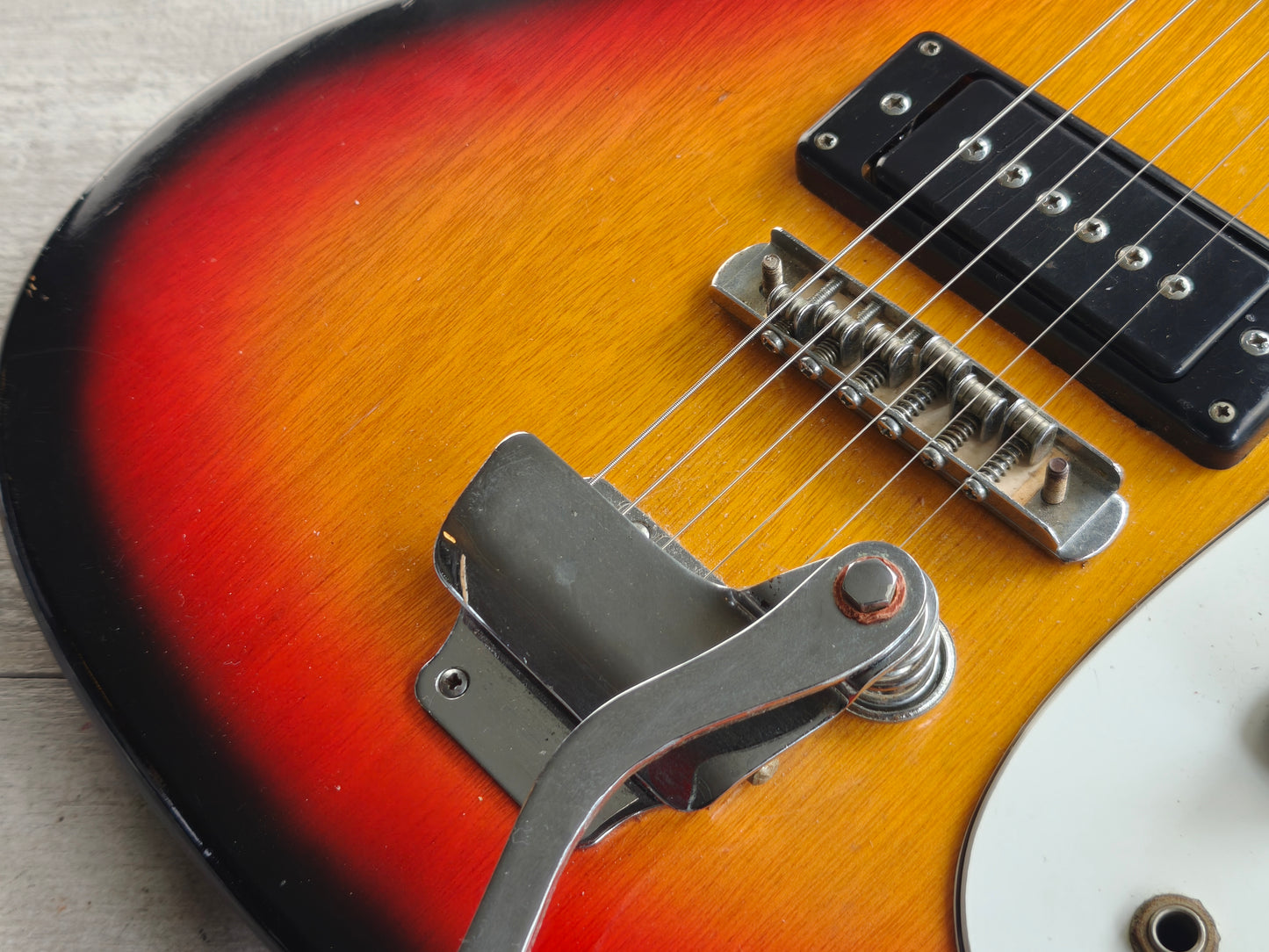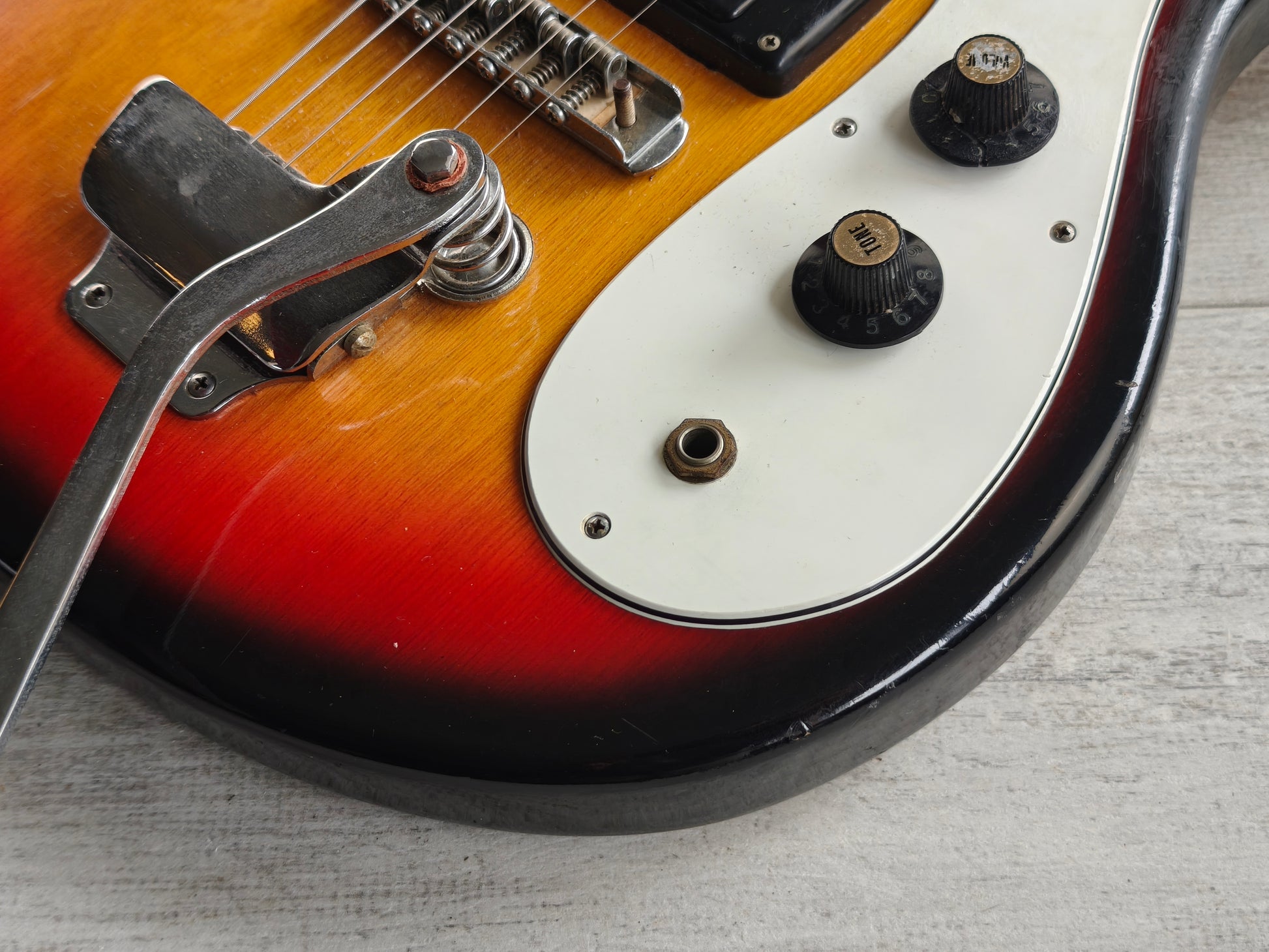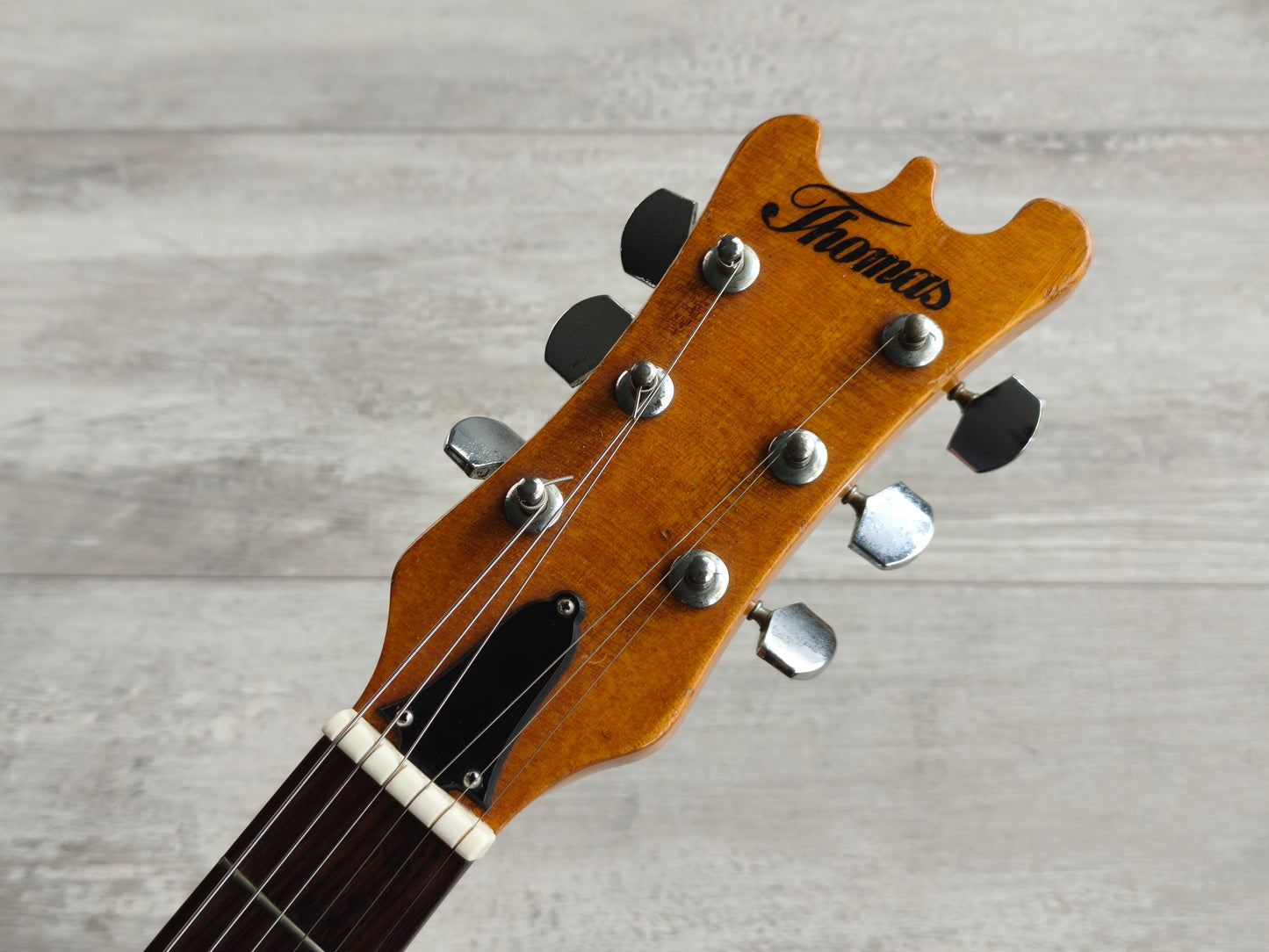 A Thomas branded version of the traditionally Guyatone branded LG-127T offset (which was based on the Mosrite Ventures model). Offset sunburst body bolted to a slim mahogany neck with a 21 fret rosewood fingerboard (628mm scale length, 44mm nut width), it weighs 3.3kg's. Mosrite-style single coils controlled by master volume/tone knobs and modified individual pickup selectors along with the original tremolo system, bridge and tuners.