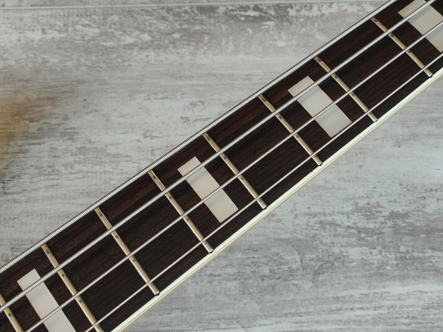 Japanese made in the 1970's, this is an unknown branded Jazz bass that was made alongside basses that have Greco or Ibanez on the headstock. Solid body with a maple neck and bound rosewood fingerboard with block inlays, it weighs a hefty 4.6kg's.