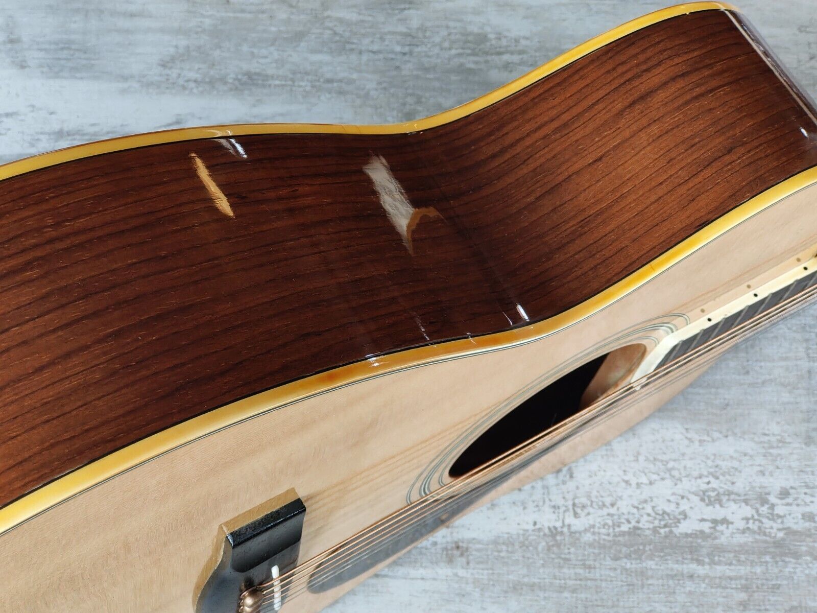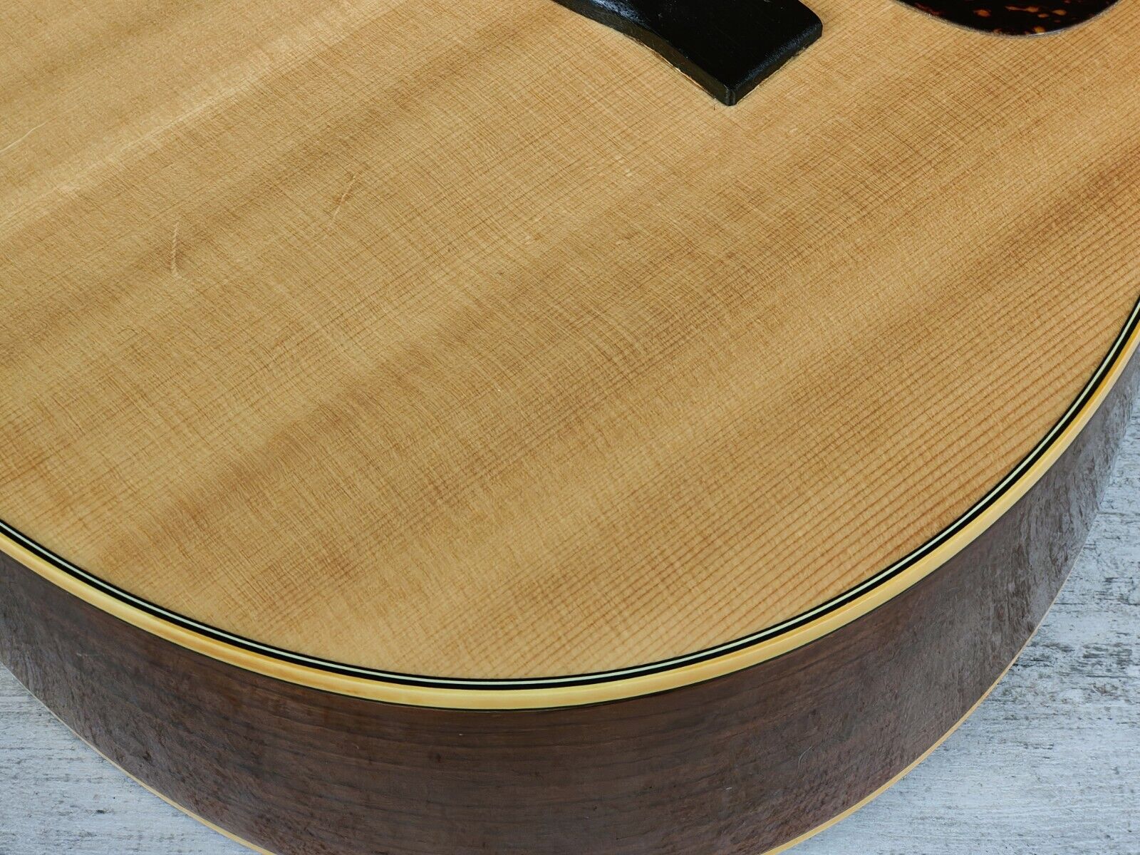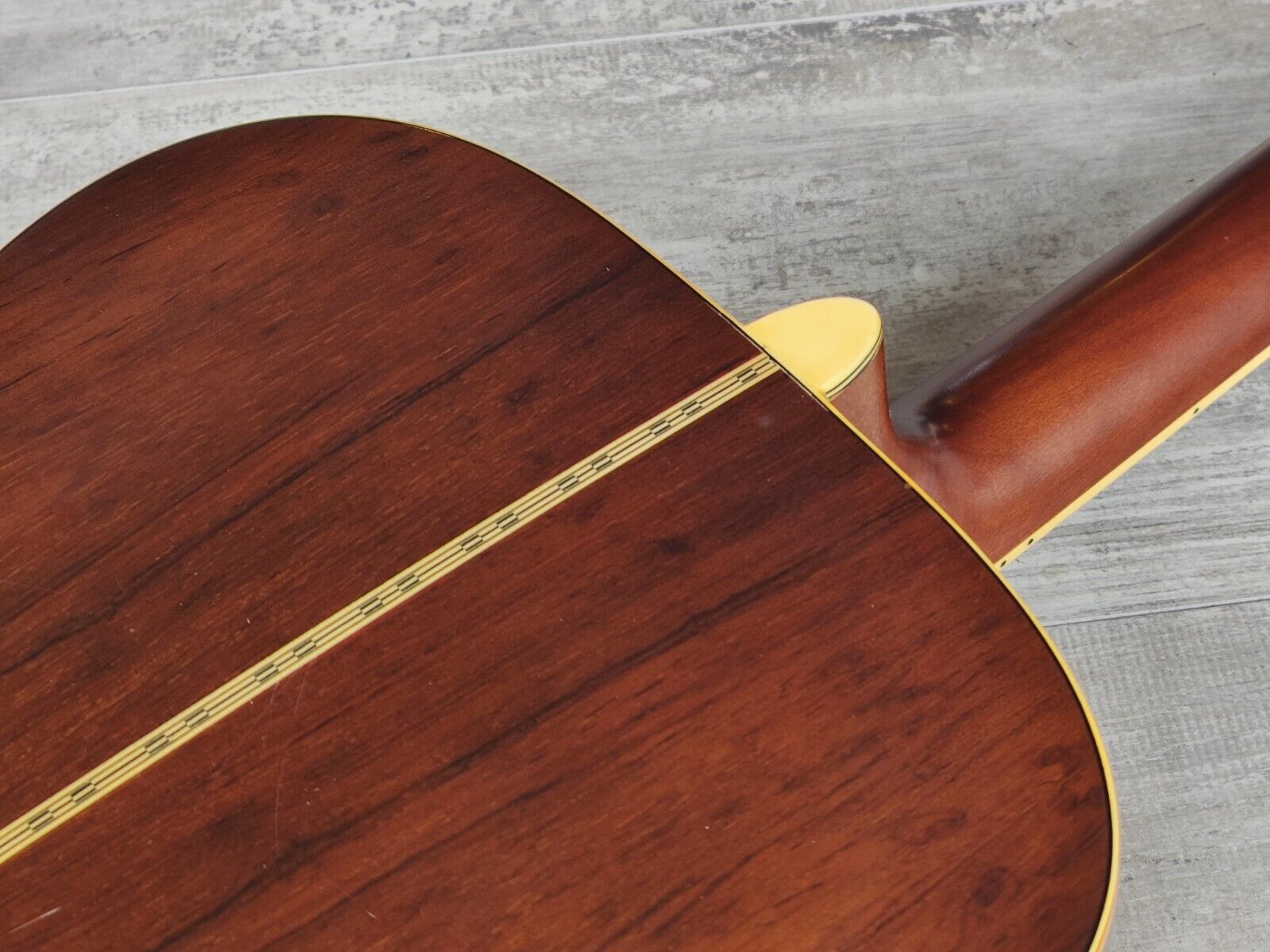 Fully laminate construction (spruce/rosewood) with an Indian rosewood fingerboard, nato neck (light V profile). Lower bout measures 38cm and the upper bout is 28cm, the action at the 12th fret on the low E string is around 3mm and it would love a neck reset (hence the price) however it plays nicely as it sits as a loungeroom guitar!
