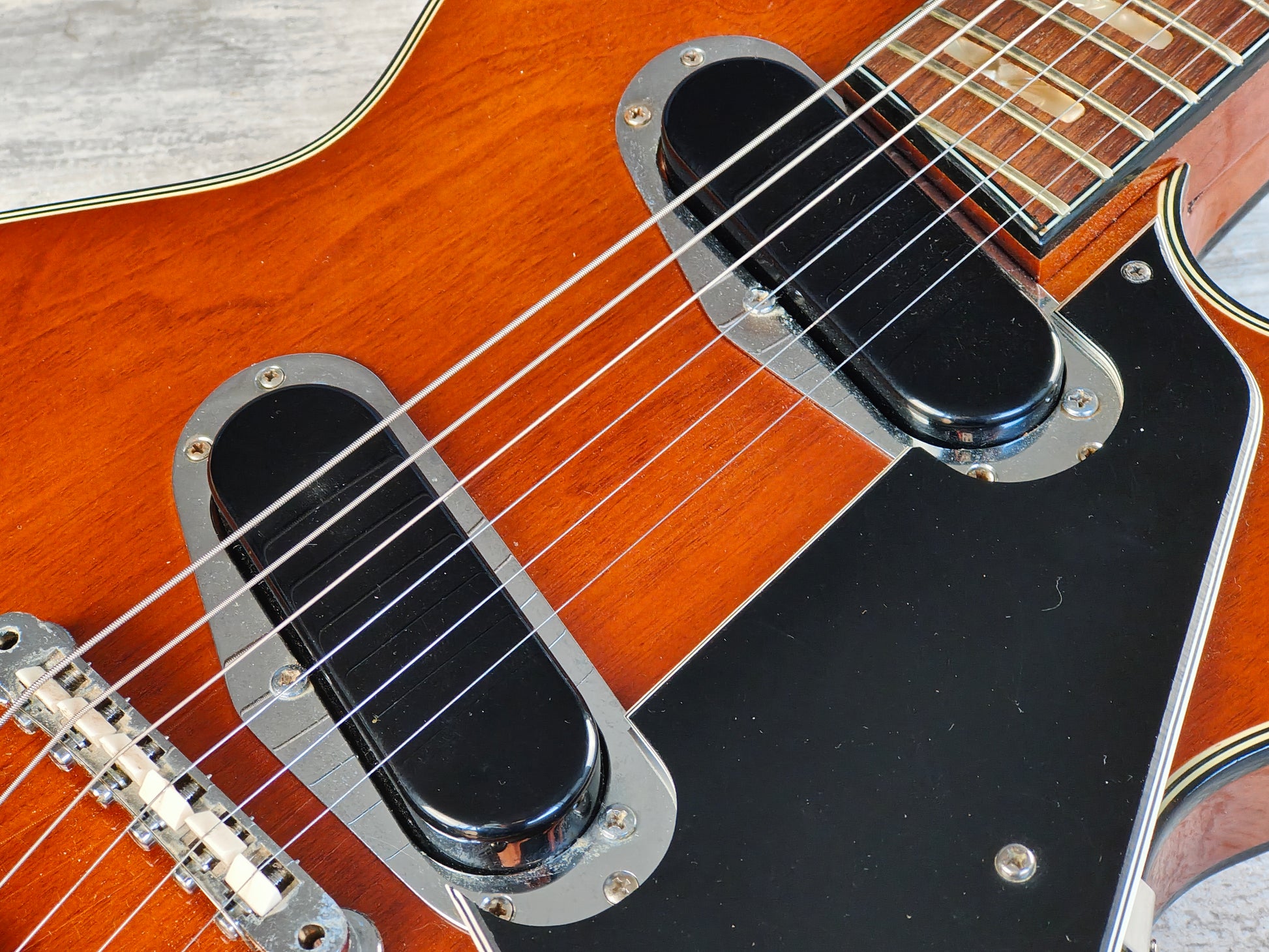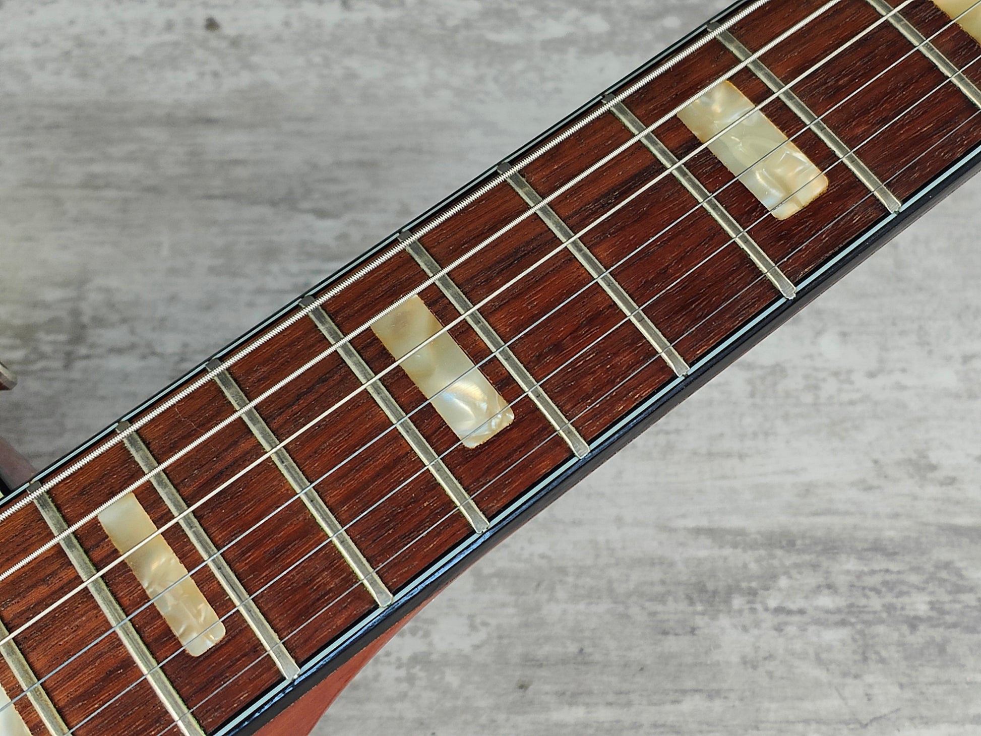 Clean vintage condition as pictured with a few signs of wear as pictured, restrung and given a basic setup including a truss adjustment and electronics flush. The frets have some light wear and tear but play smoothly.