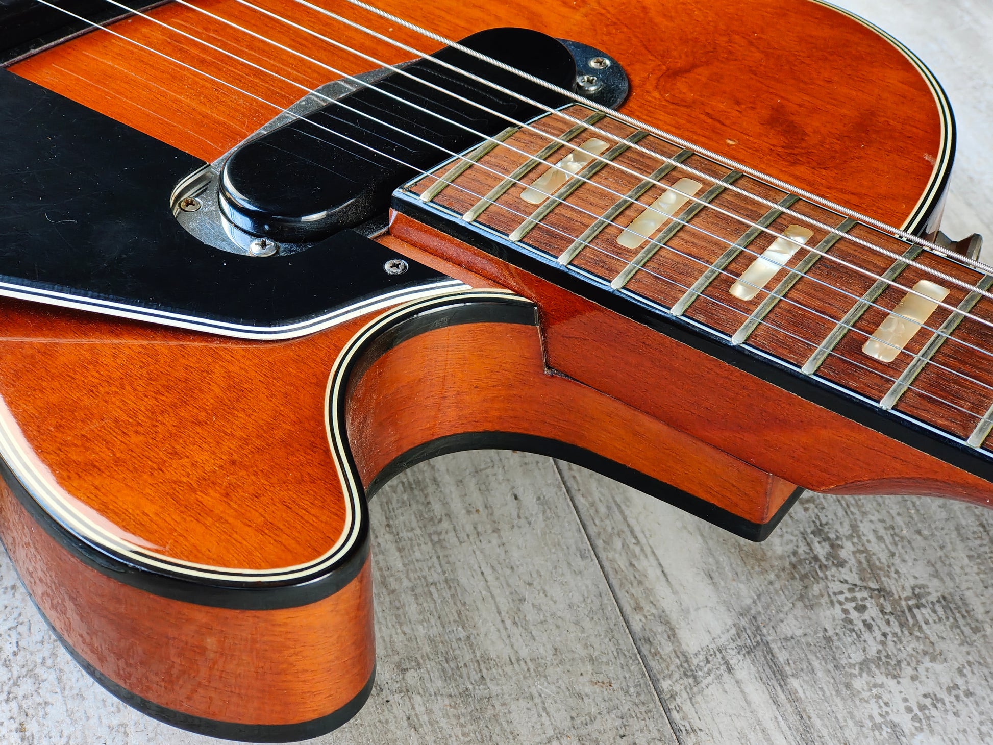 Made by the Matsumoto company (who produced guitars for brands such as Pearl and Franpton), the LE-200 was an attempt at recreating the polarising Les Paul Recording model. Chambered laminate mahogany body with black binding on the top and back, slim 60's style mahogany neck and a rosewood fingerboard (22ish frets, 42mm nut width), it weighs 3.6kg's.