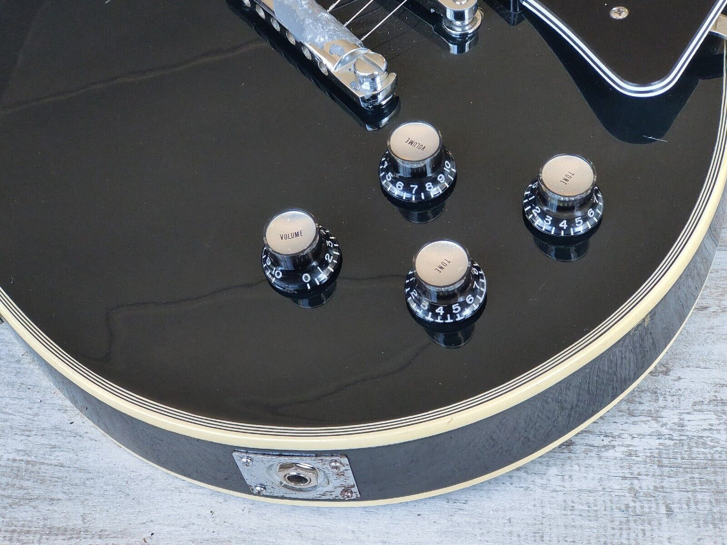 Made in Japan in 1973, these were some of the earlier model Les Paul Custom replicas sold by Greco and have a bolt on neck and solid pancake body. Weighing just under 4kg's and loaded with a pair of Maxon humbuckers, these sound and play great with a slim neck profile and plenty of sustain.