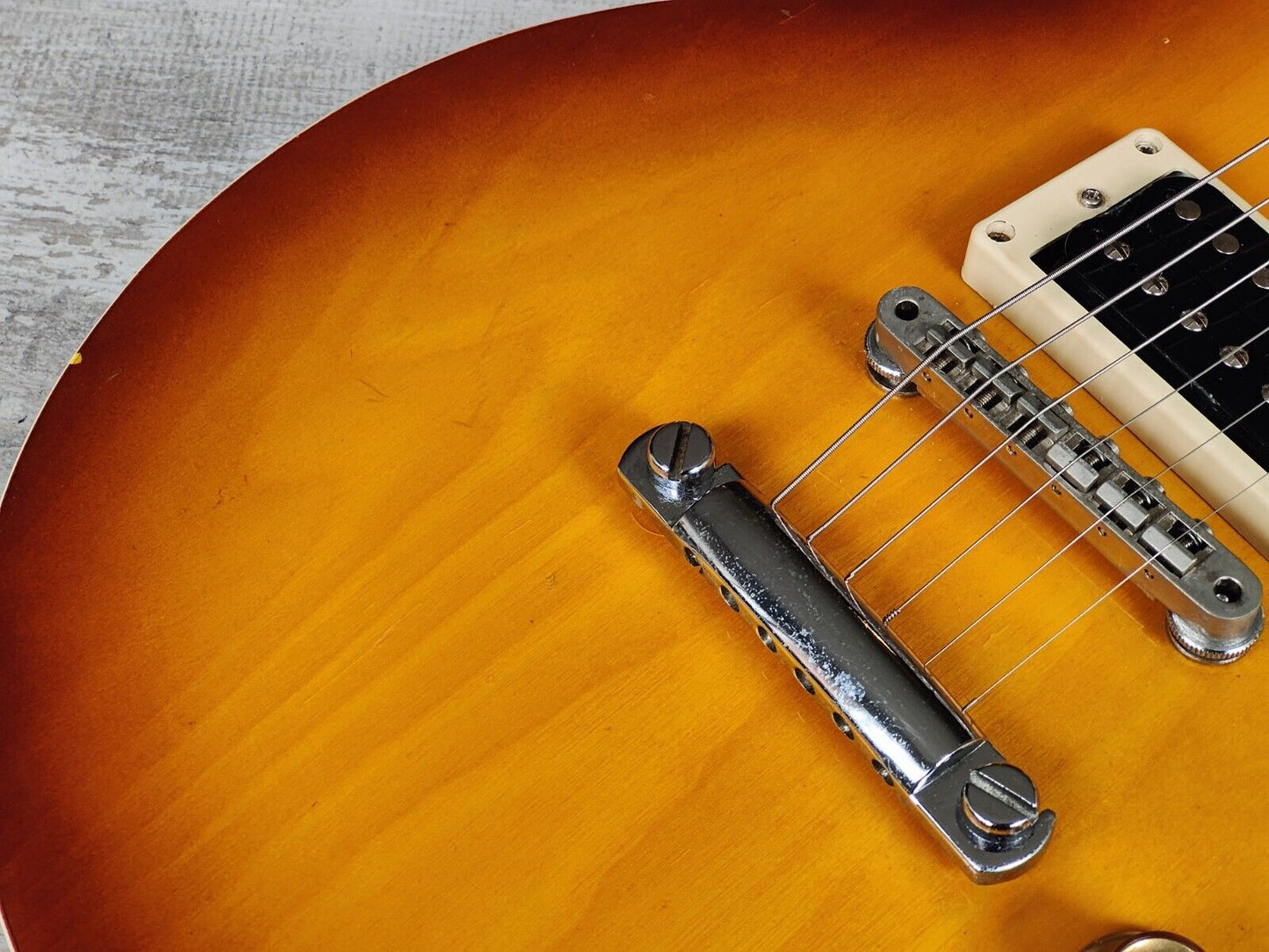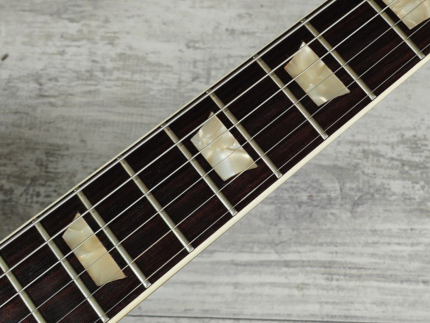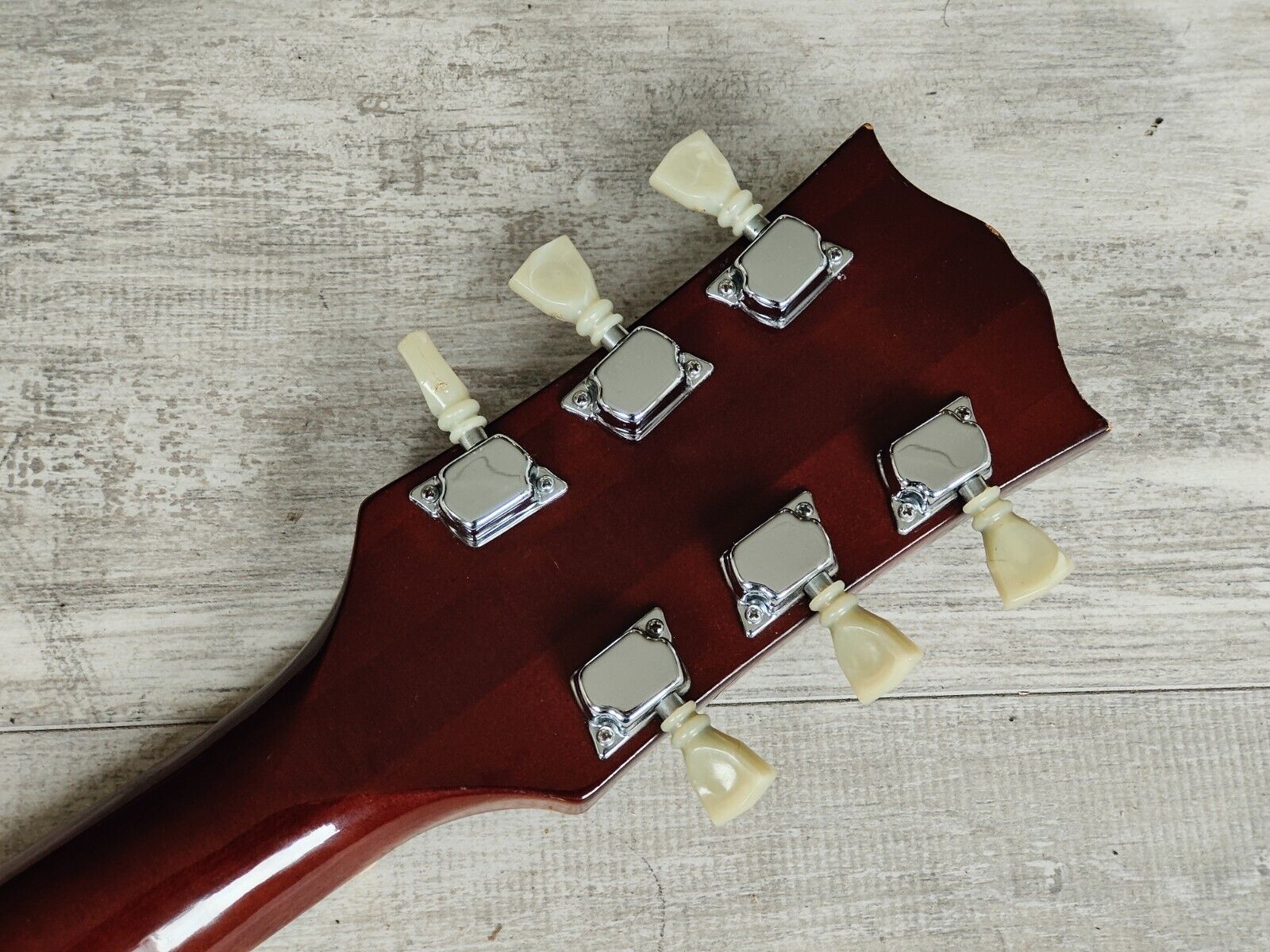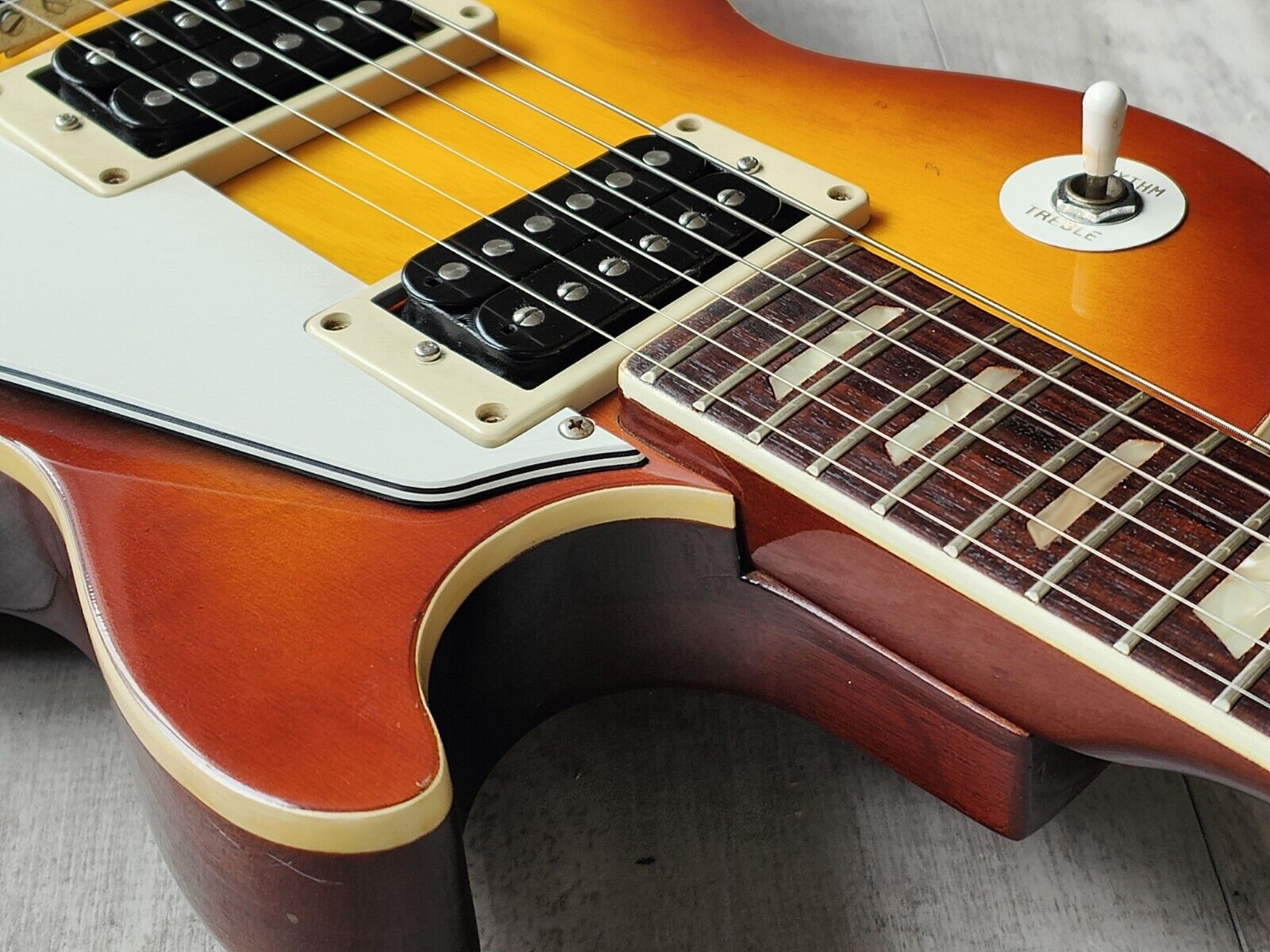 A Les Paul from the very early days of Greco, this is EG model wears a subtle plaintop brown sunburst finish. Pancake construction (3.5kg's) with a slim 60's bolt-on neck and 22 fret rosewood fingerboard, it's loaded with some aftermarket Gotoh humbuckers and an upgraded bridge with the original tailpiece, tuners and wiring.