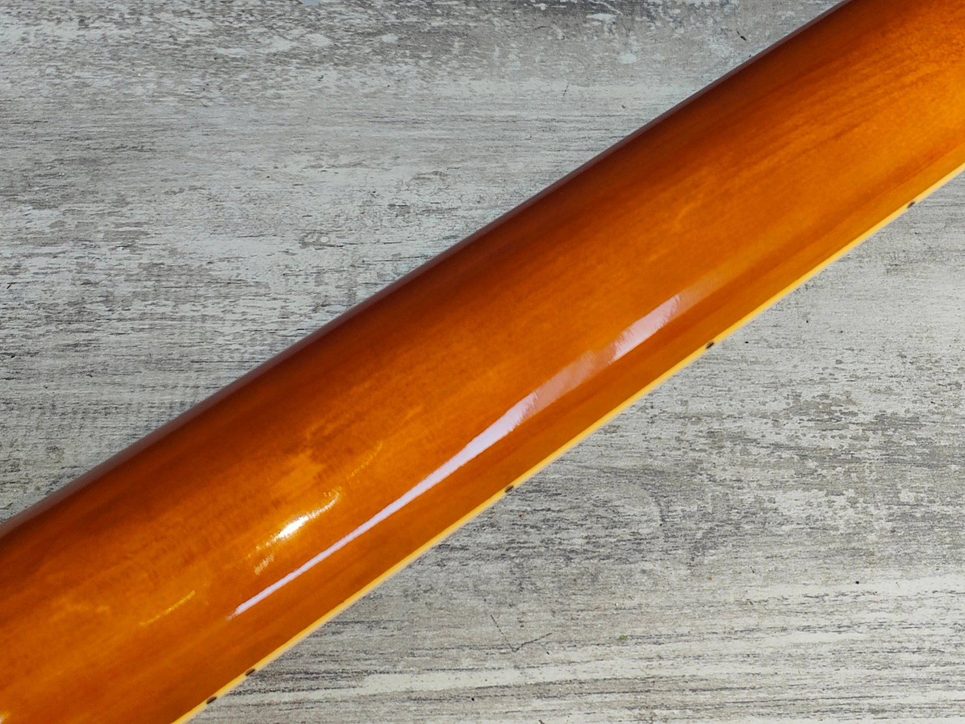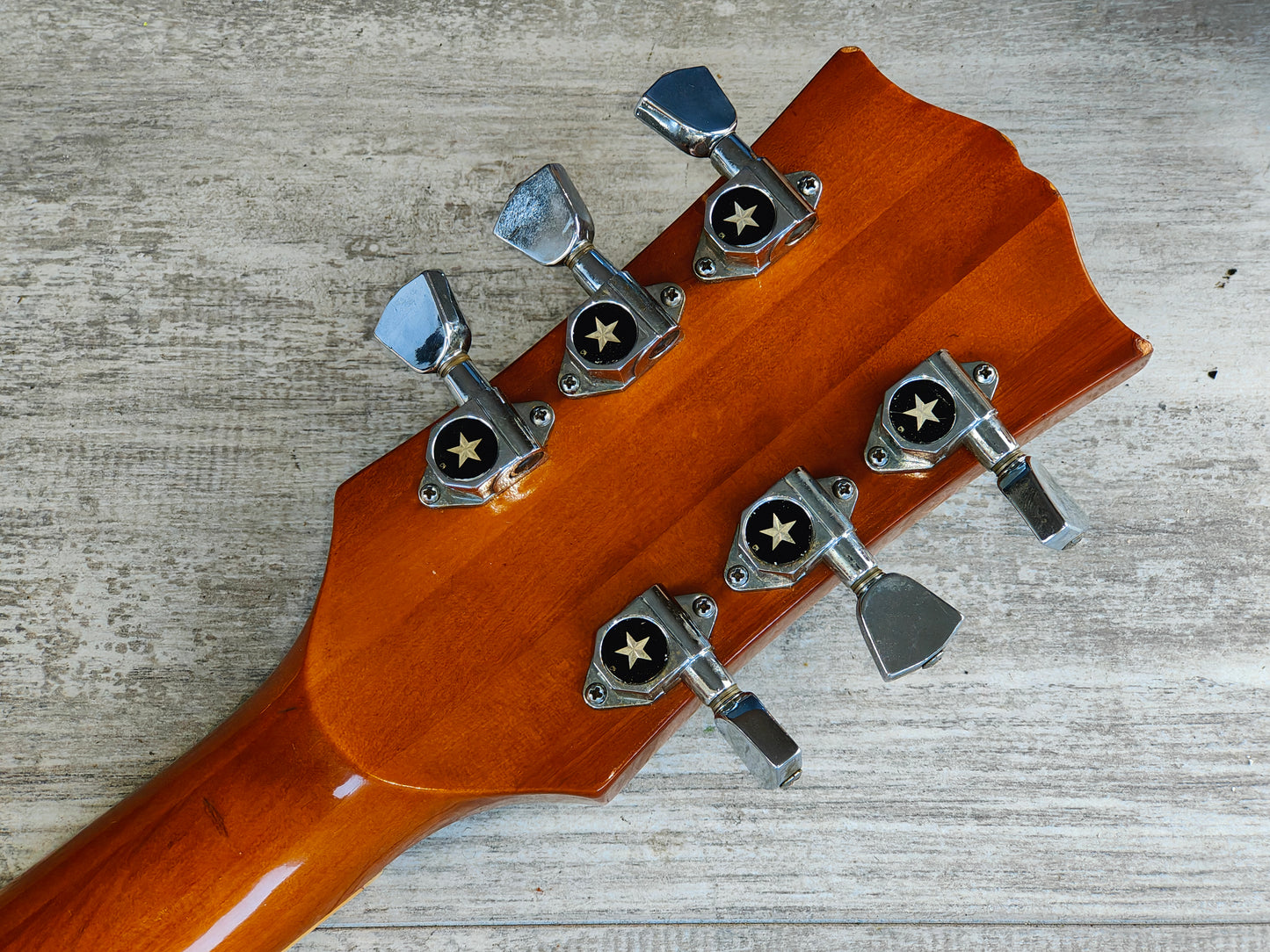 Made in 1973 for Greco's 1974 catalog, the EG-550GS was their seldom seen replica of the Norlin era Les Paul Deluxe. Solid pancake body bolted to a rounded C three-piece neck with a 22 fret rosewood fingerboard, it weighs a reasonable 4.3kg's.