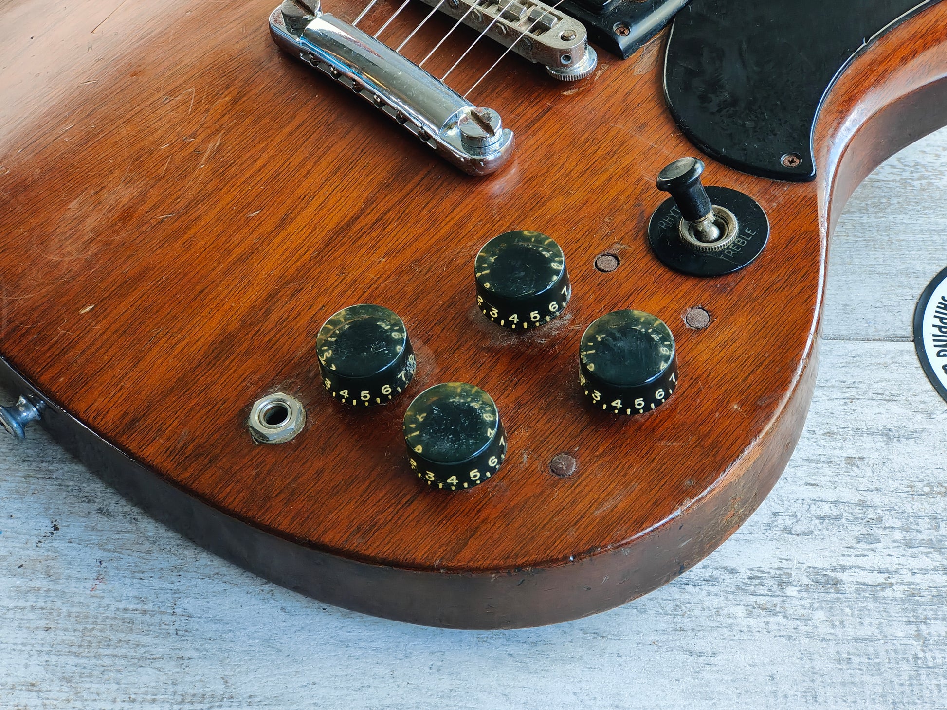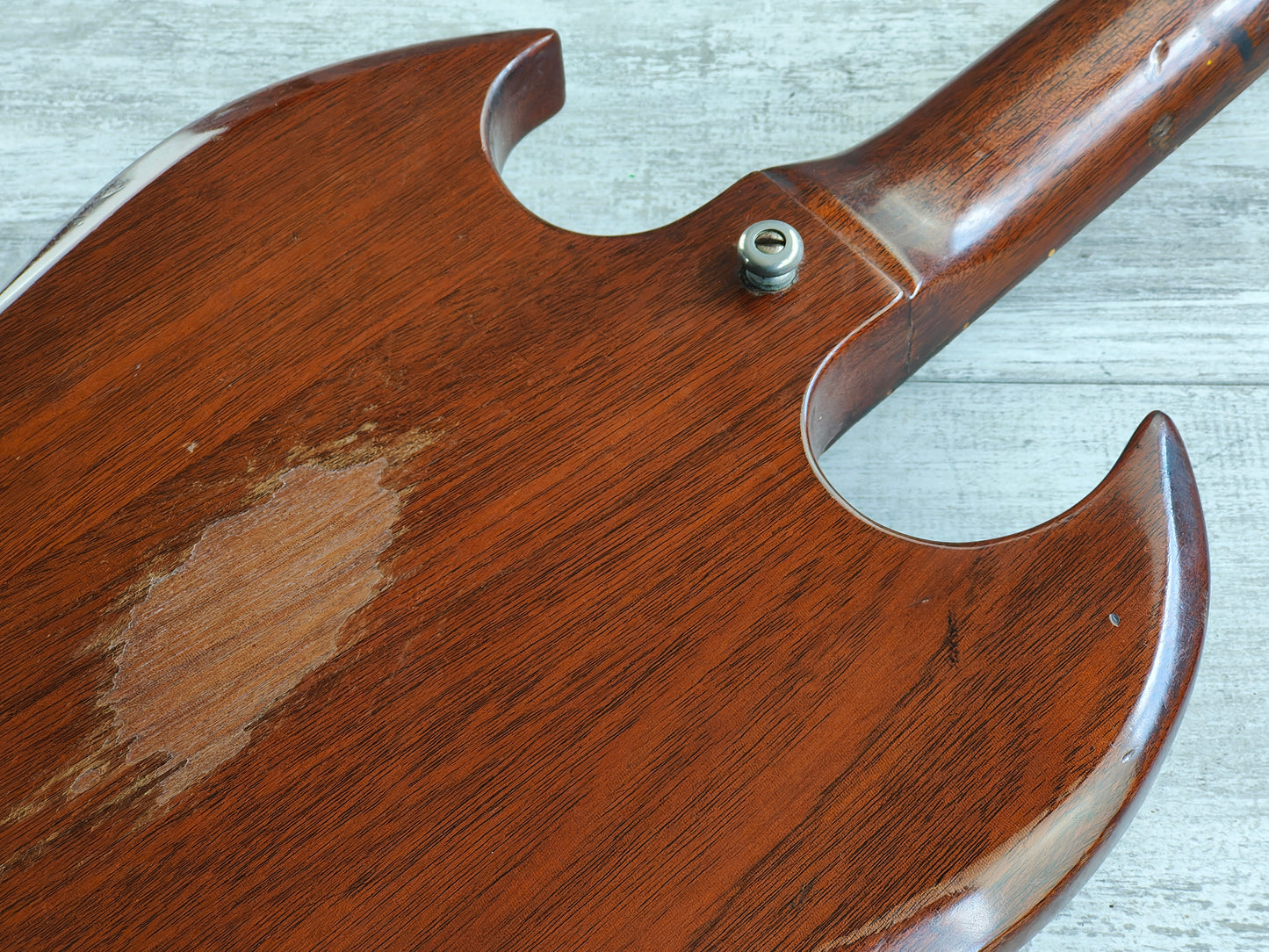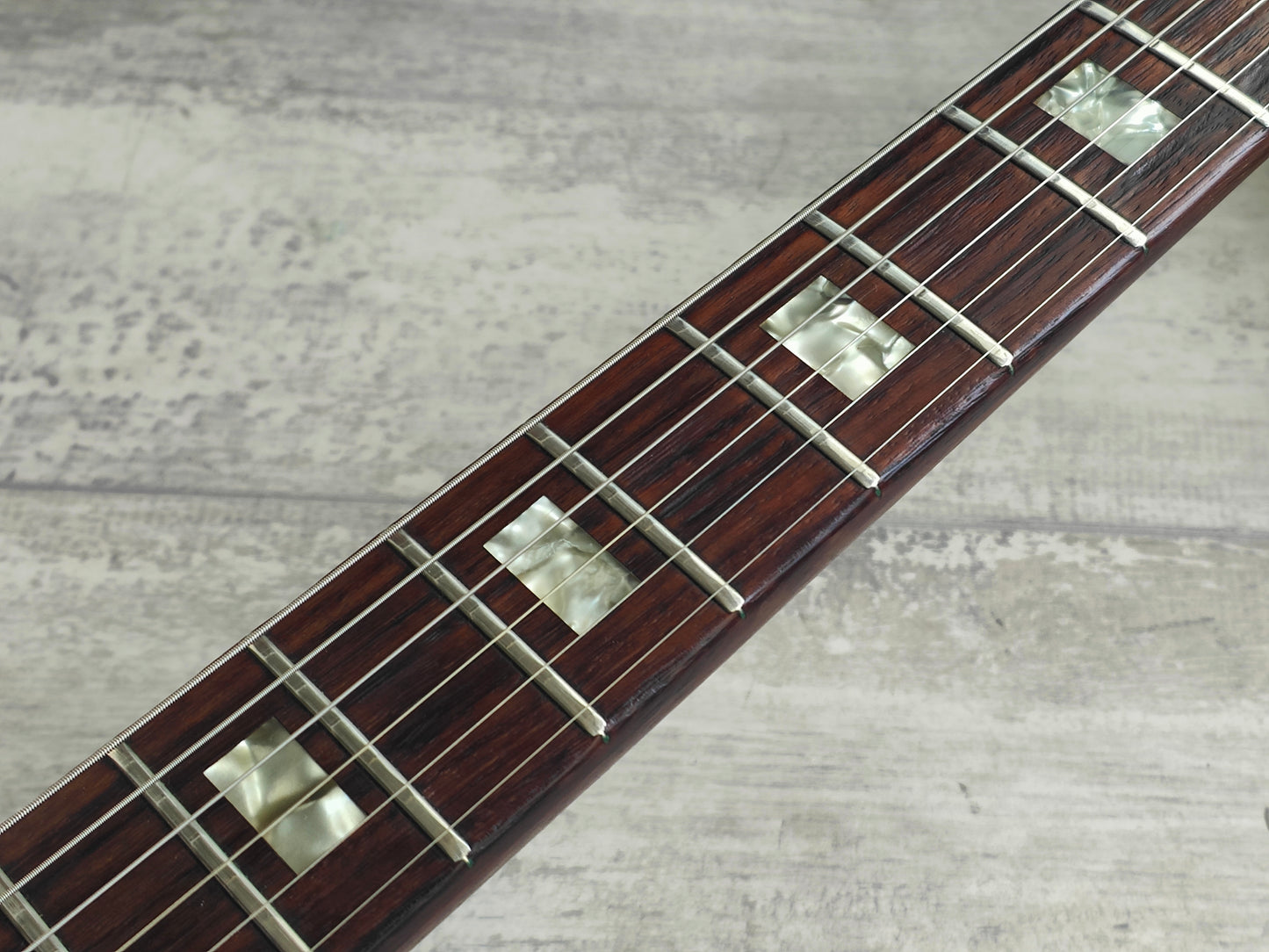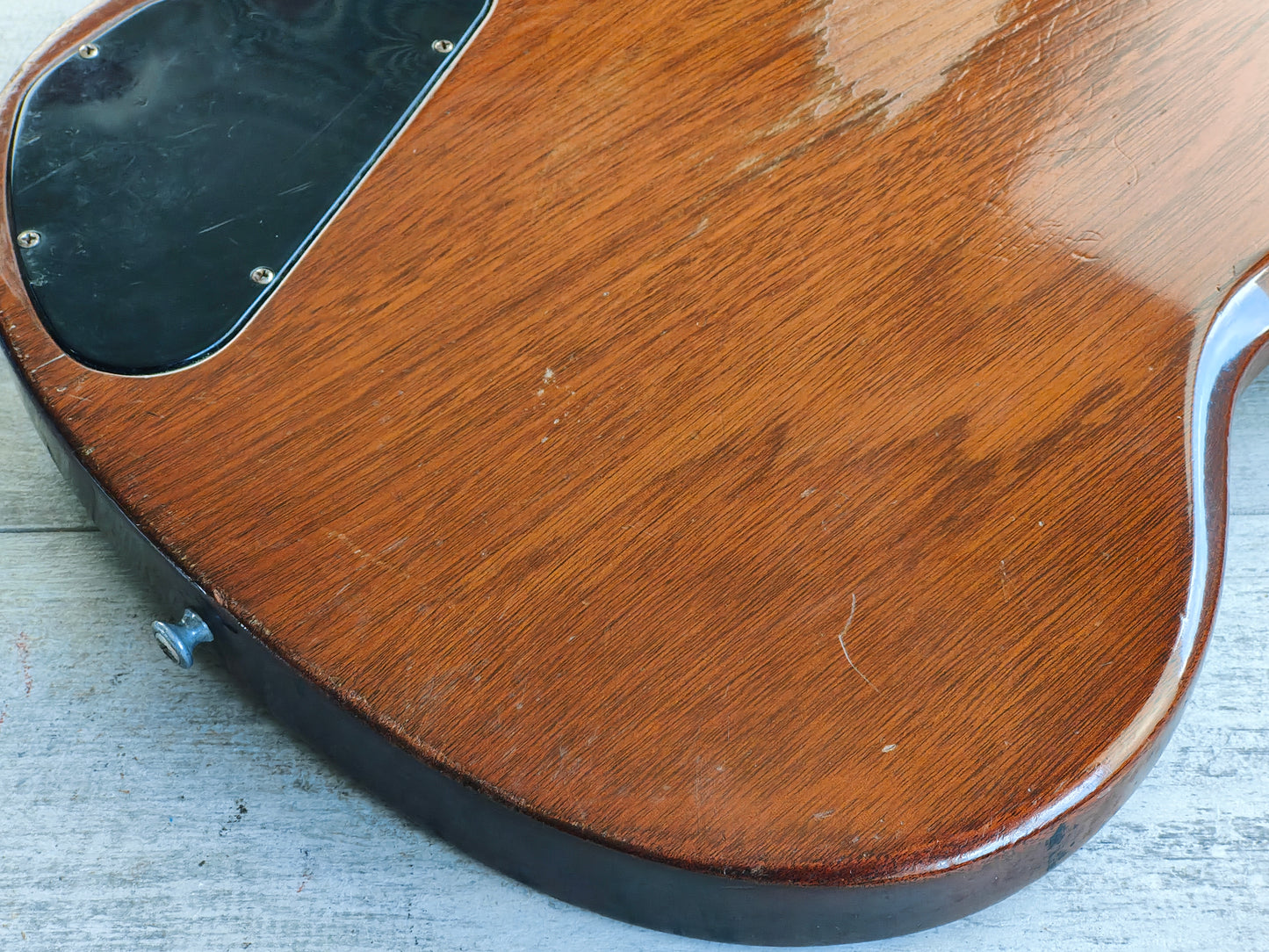 A real players-grade vintage guitar, this one has seen plenty over it's lifetime but is structurally solid with no signs of any breaks or repairs anywhere to be seen. There's a few small holes in the top that have been dowelled (likely where some toggle switches were installed at some stage) and the body has plenty of signs of wear from general use. The frets are seemingly original and have plenty of pitting and playwear, the neck is reasonably straight and the truss is responsive.