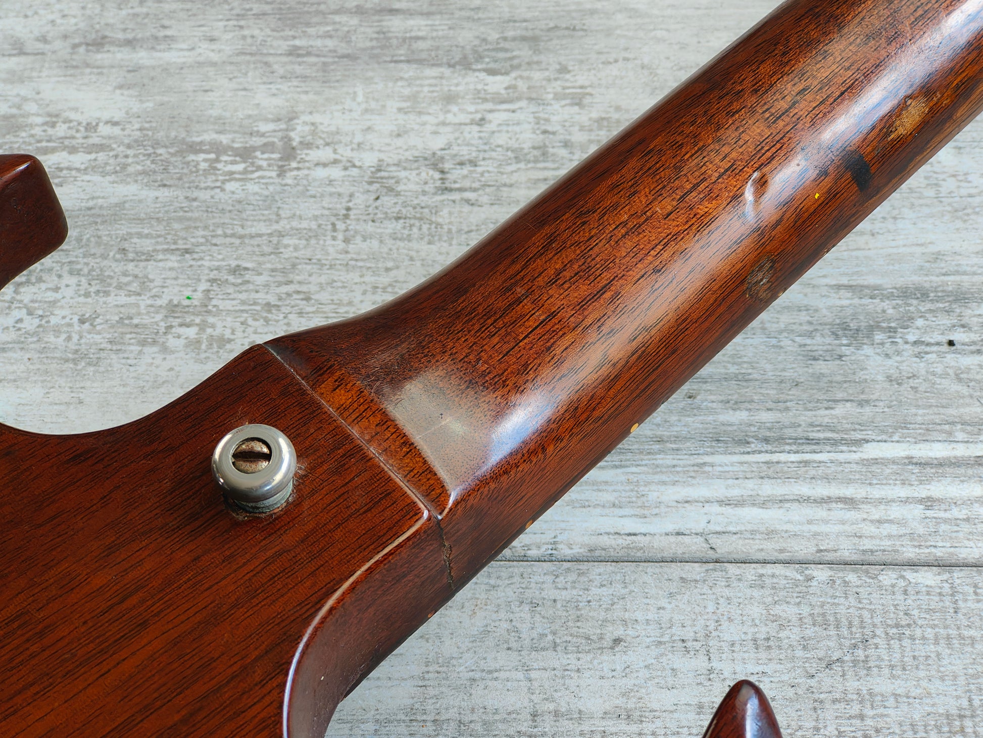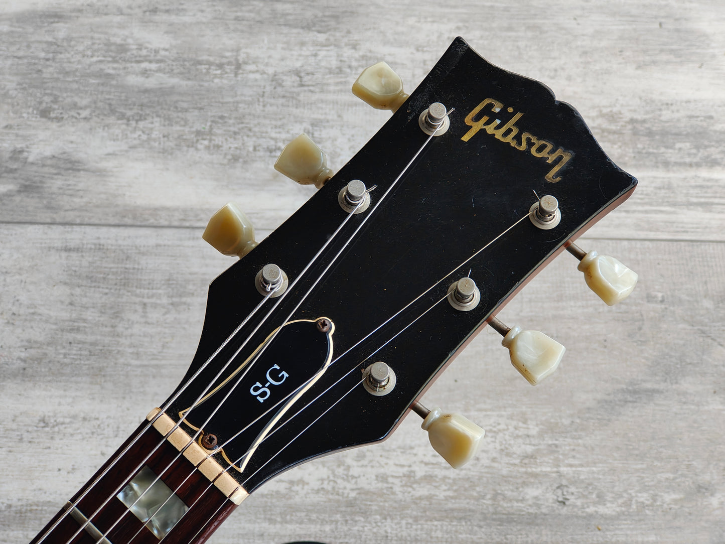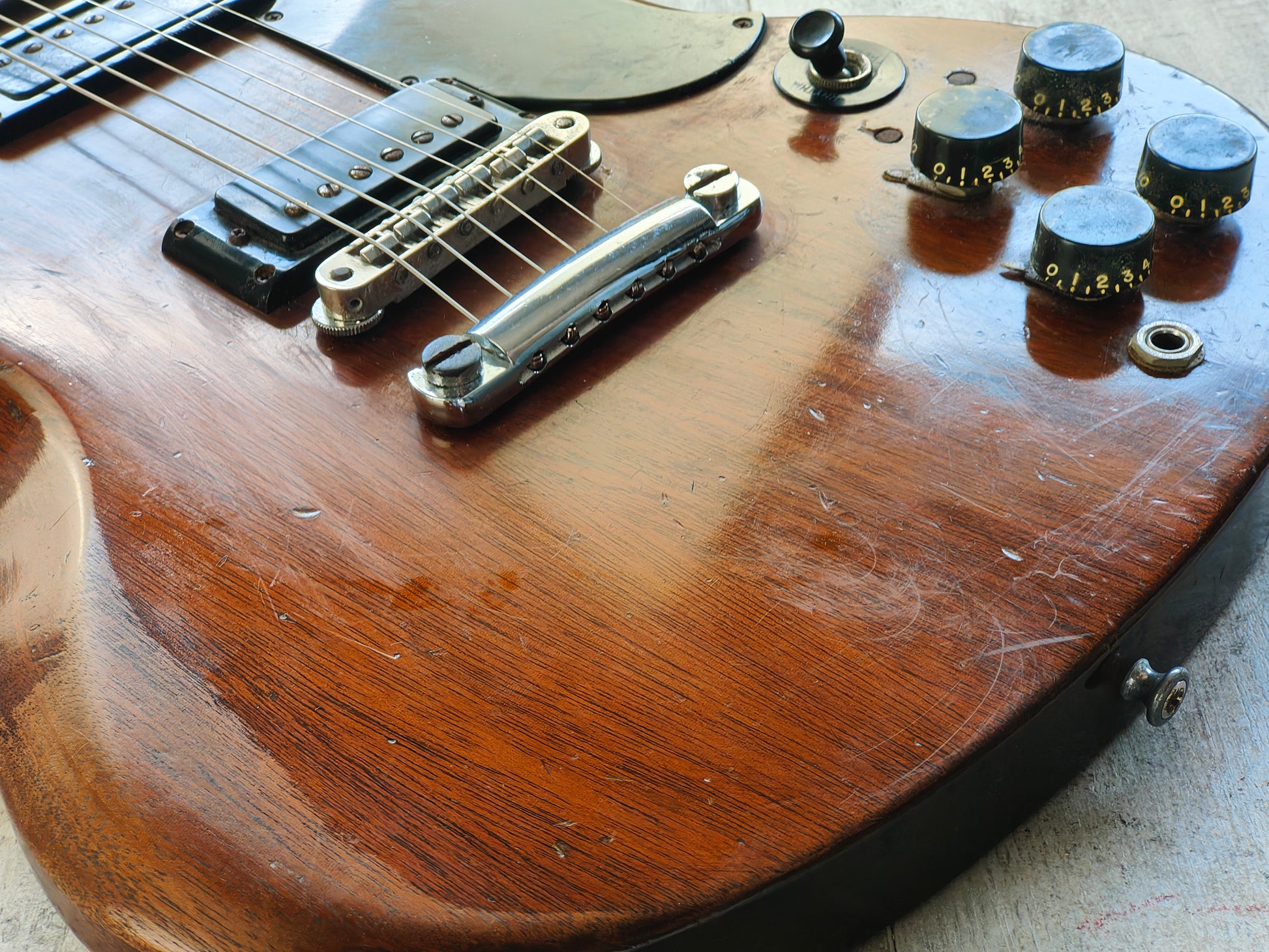 A real players-grade vintage guitar, this one has seen plenty over it's lifetime but is structurally solid with no signs of any breaks or repairs anywhere to be seen. There's a few small holes in the top that have been dowelled (likely where some toggle switches were installed at some stage) and the body has plenty of signs of wear from general use. The frets are seemingly original and have plenty of pitting and playwear, the neck is reasonably straight and the truss is responsive.