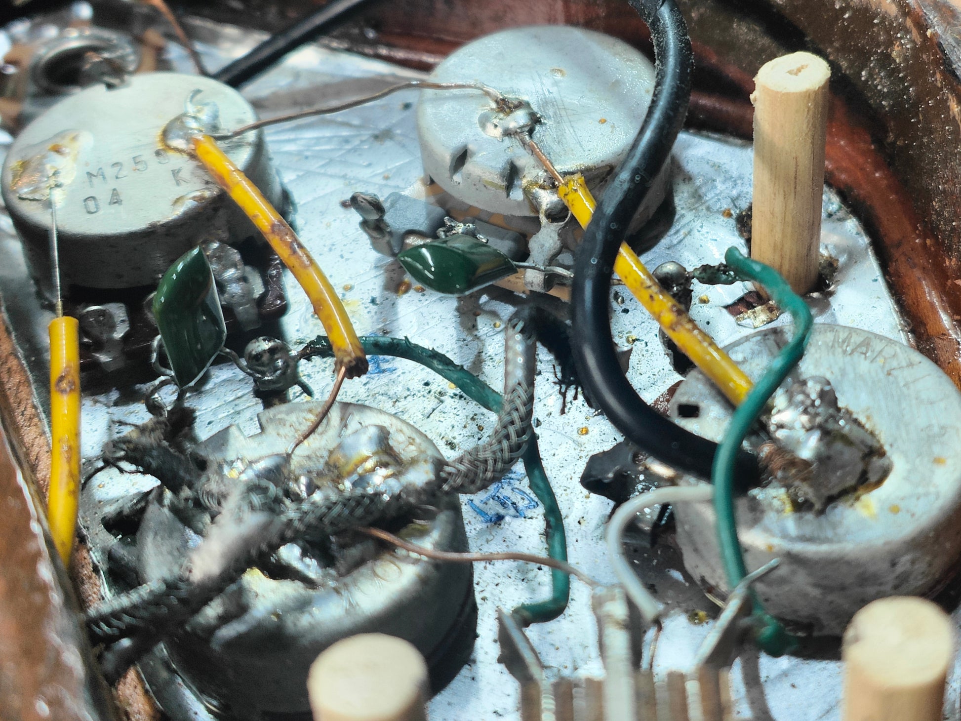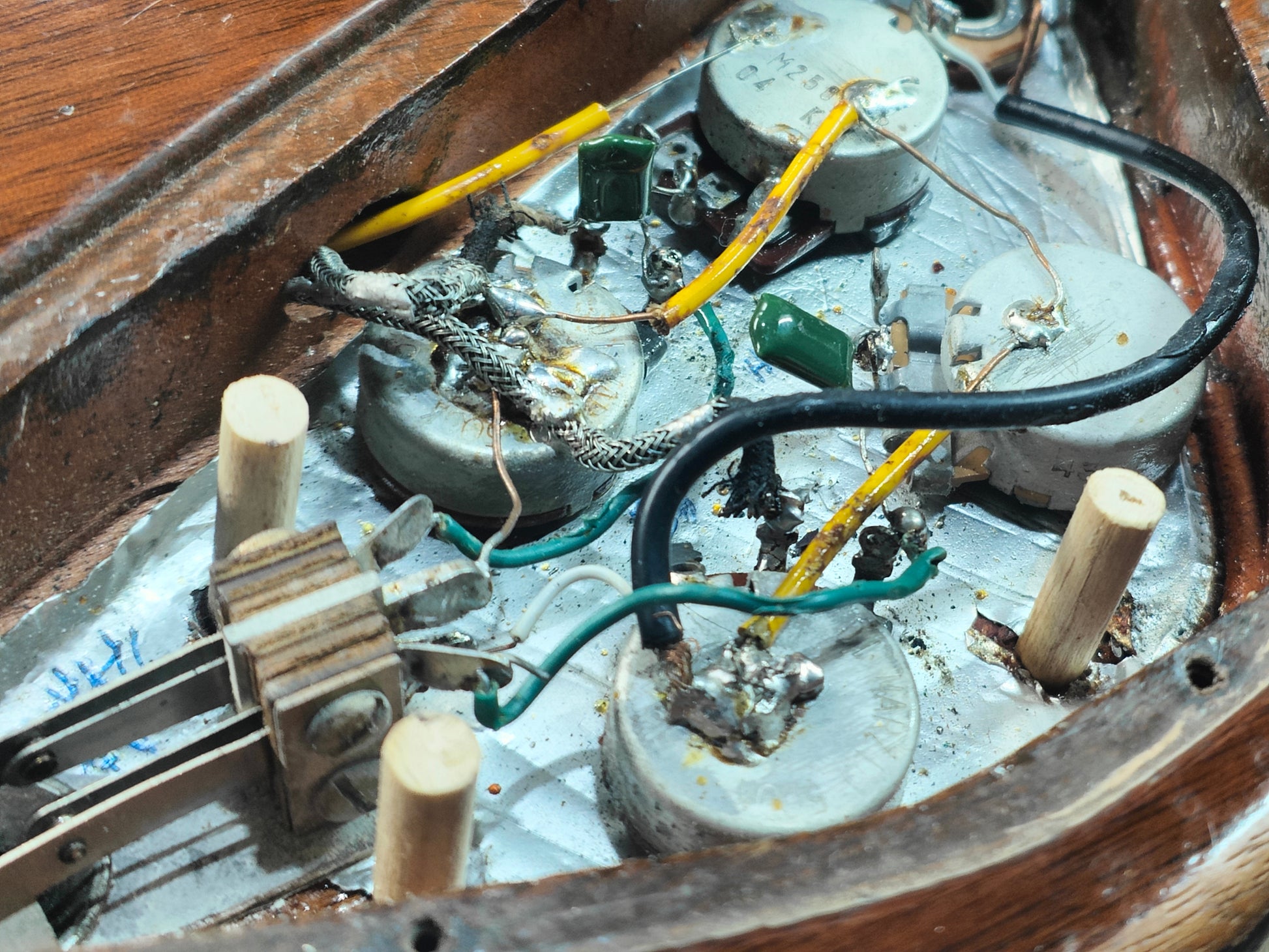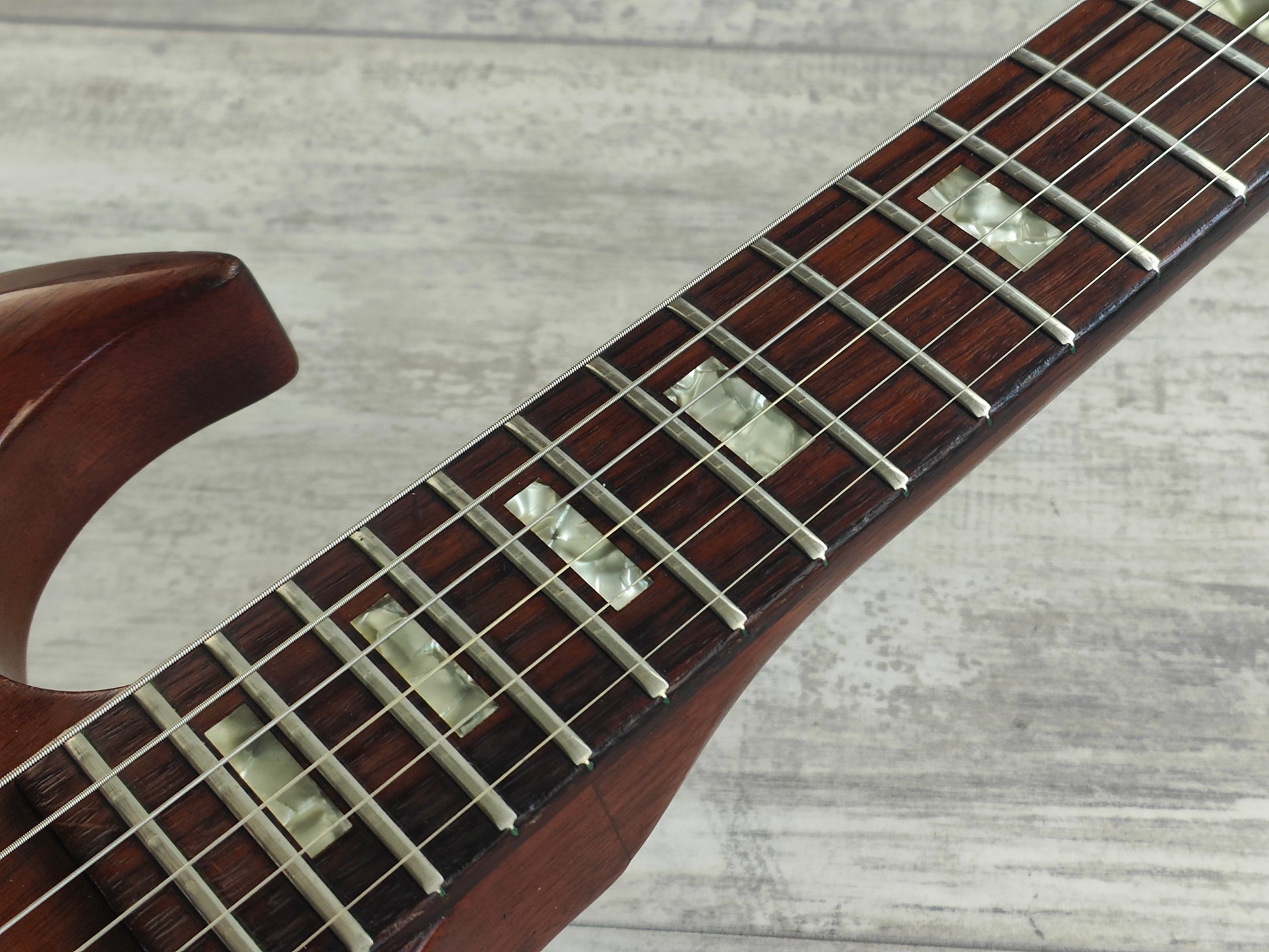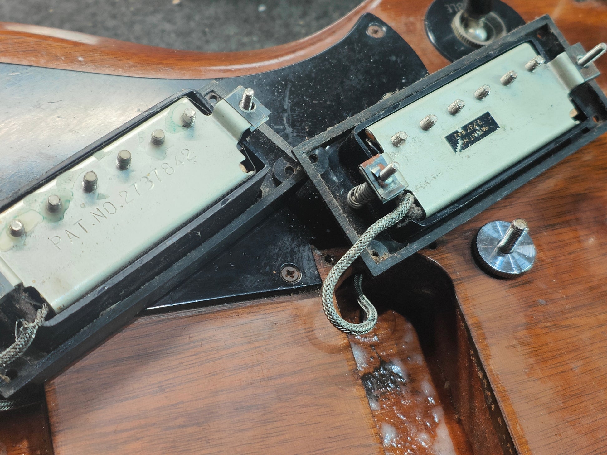 A real players-grade vintage guitar, this one has seen plenty over it's lifetime but is structurally solid with no signs of any breaks or repairs anywhere to be seen. There's a few small holes in the top that have been dowelled (likely where some toggle switches were installed at some stage) and the body has plenty of signs of wear from general use. The frets are seemingly original and have plenty of pitting and playwear, the neck is reasonably straight and the truss is responsive.