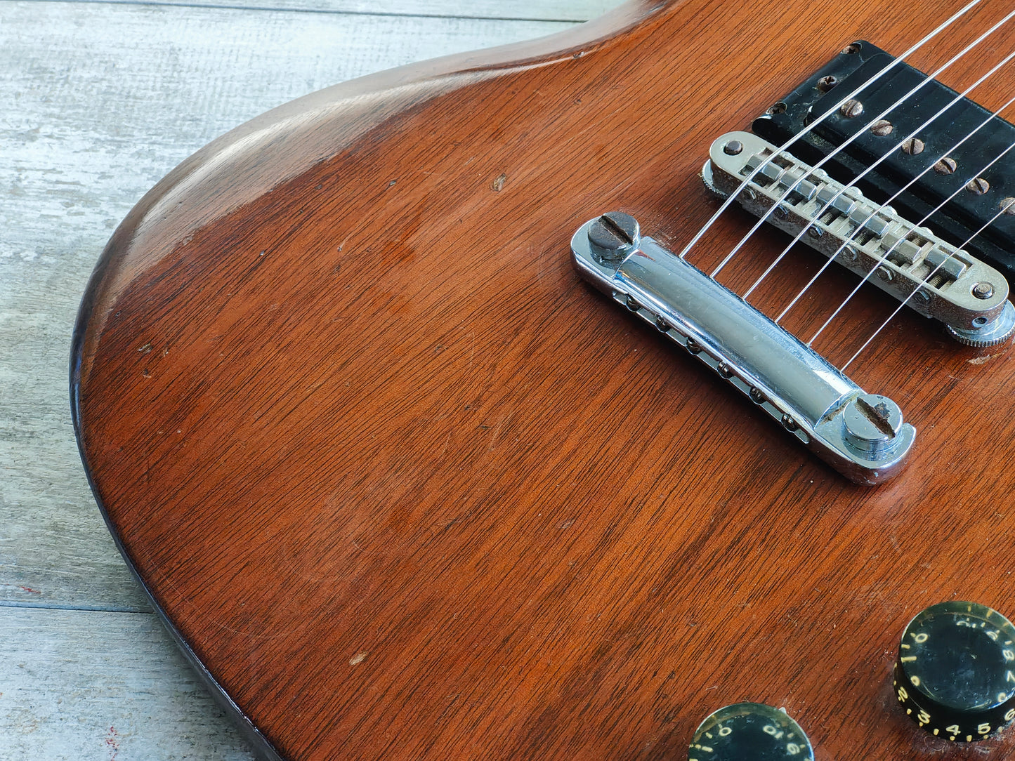Solid mahogany construction as pictured with a walnut finish set to a mahogany neck with a reasonably generous rounded profile and a 22 fret rosewood fingerboard, this one weighs 3kg's. This one is loaded with the original Mini Humbuckers along with the original tailpiece, the bridge has been replaced for a Gotoh and a few of the pots have been swapped as pictured.