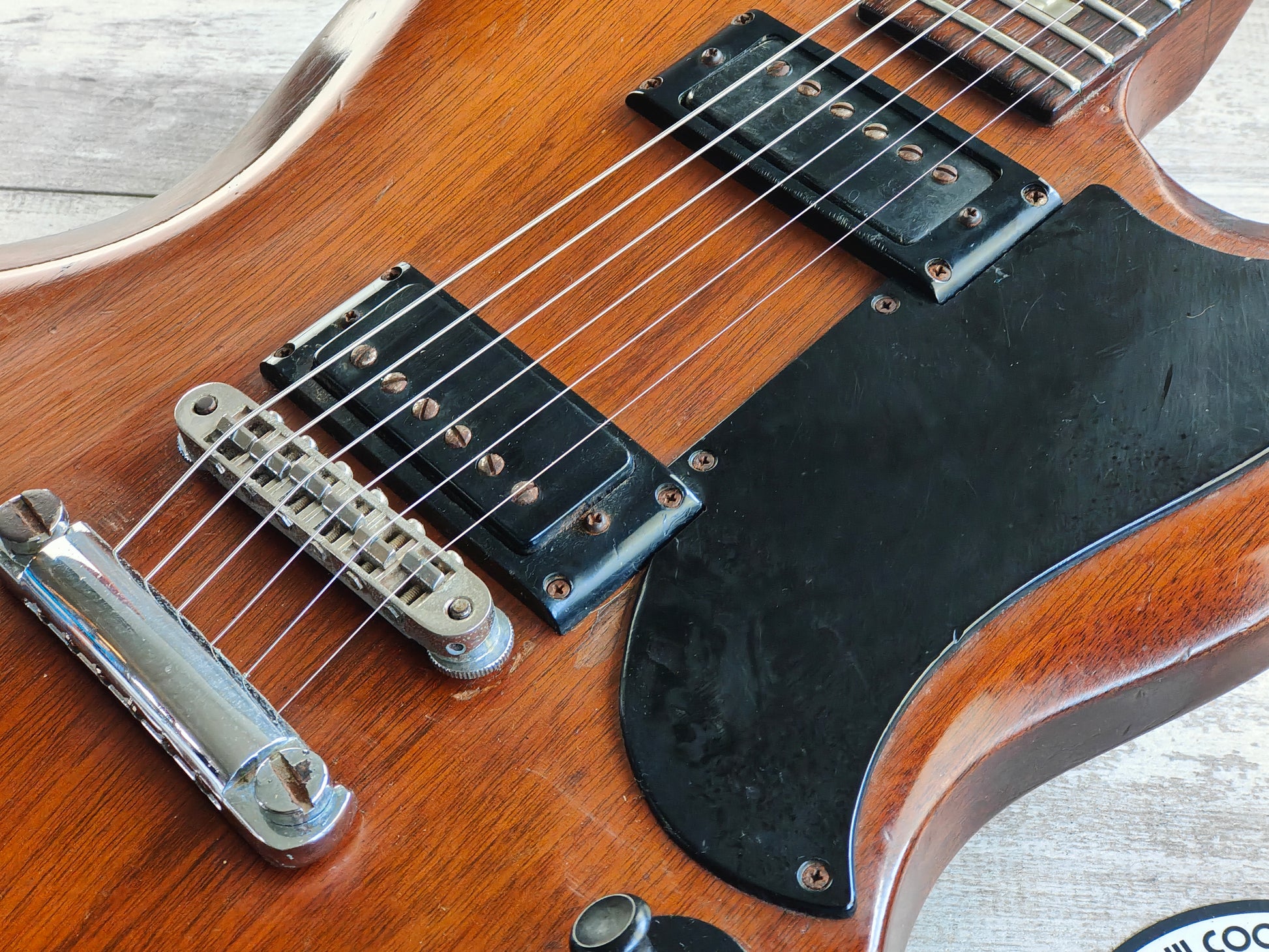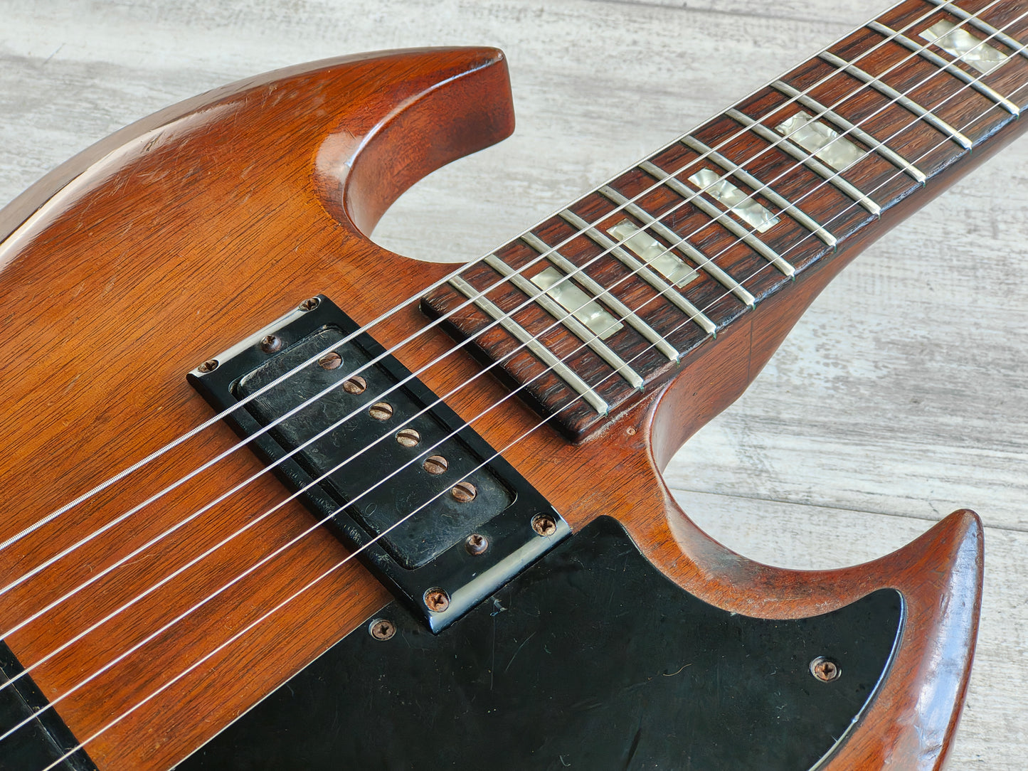 Made in the USA in 1975 or so, this is the second revision of the Norlin-era SG Special that features block inlays instead of the dot inlays on the earlier models. These are nearly identical to the SG Standard of the same era with the exception of the pickups, the Special was loaded with a pair of mini-humbuckers that give a nice tight tone.