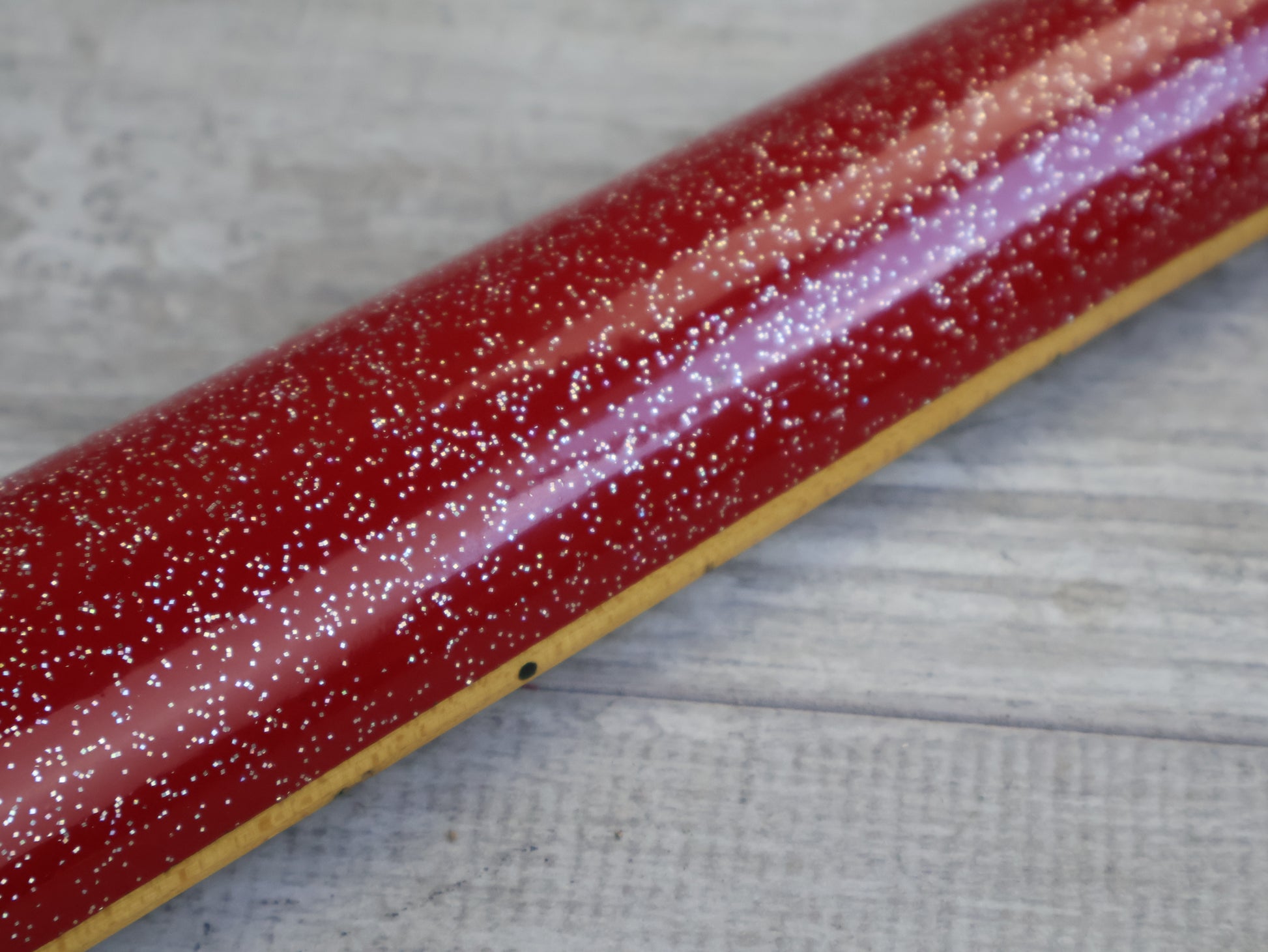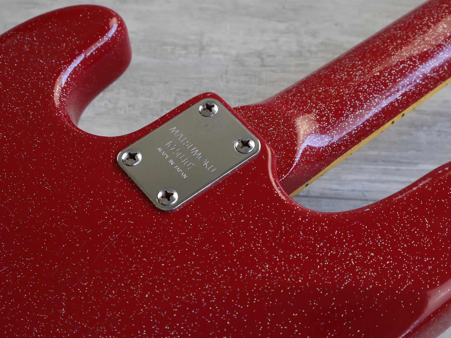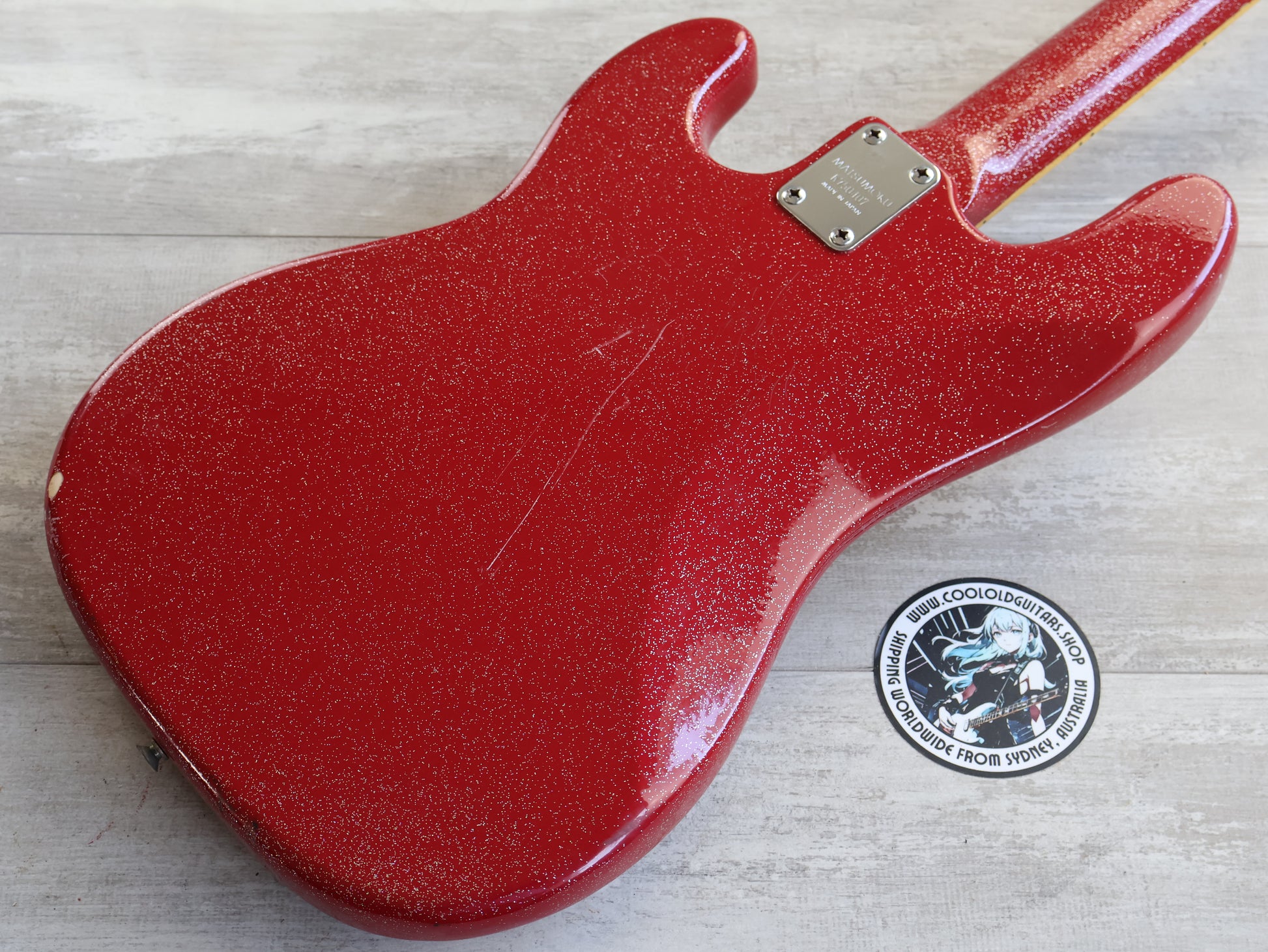 This one has a very fun (and reasonably professional) metallic sparkle red refinish over the body and neck as pictured along with a replacement pickguard and some gold knobs to match the aesthetic. In general it's in good vintage condition as pictured with basic signs of wear and tear from general use. The truss adjusts well and the neck is straight, the frets are in reasonable condition with plenty of life left.