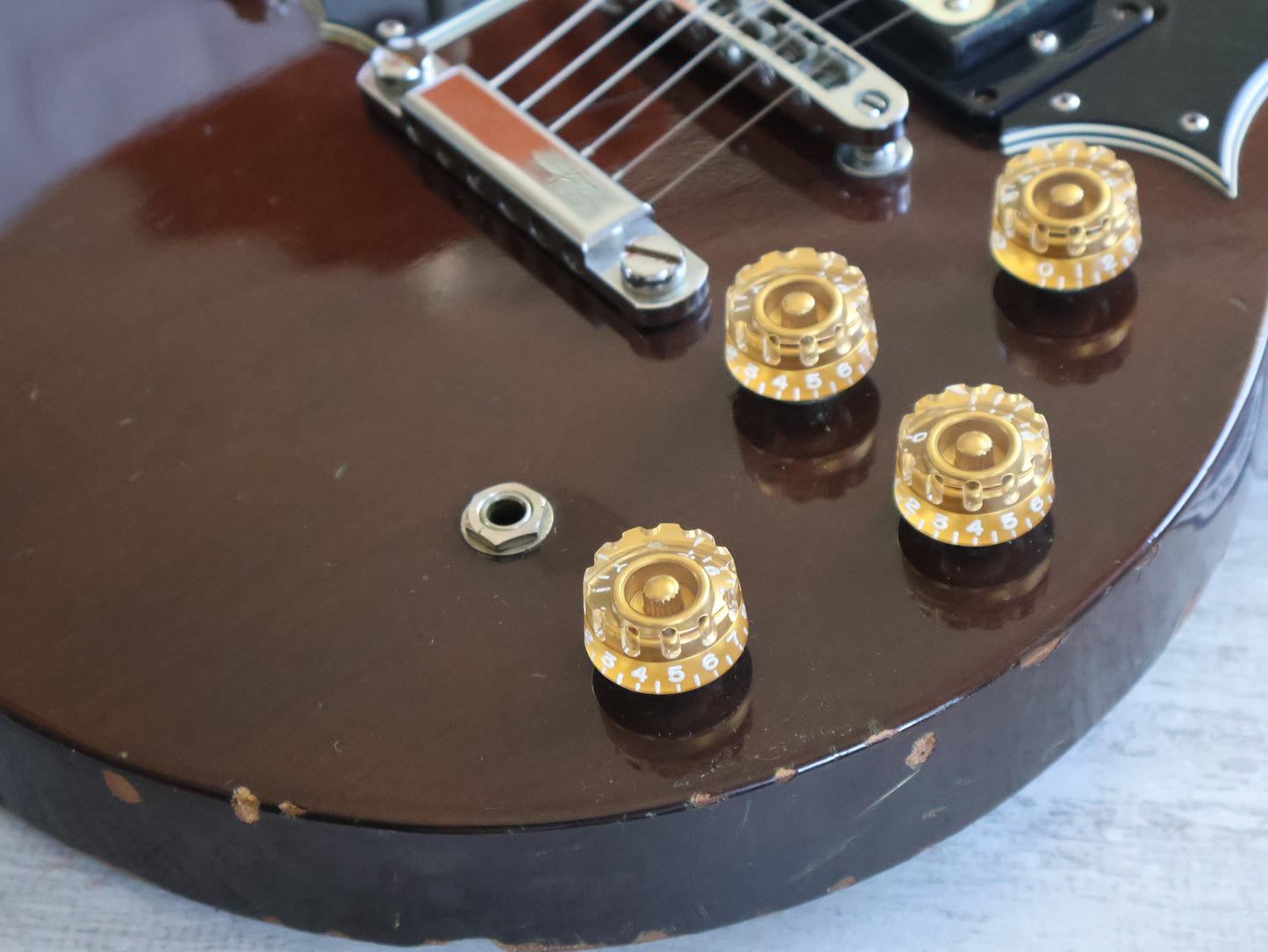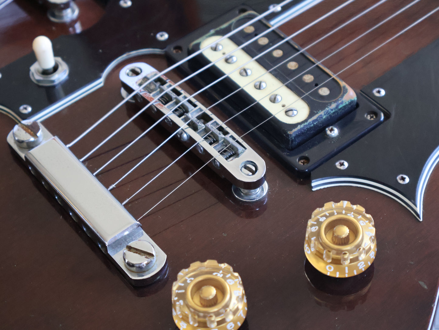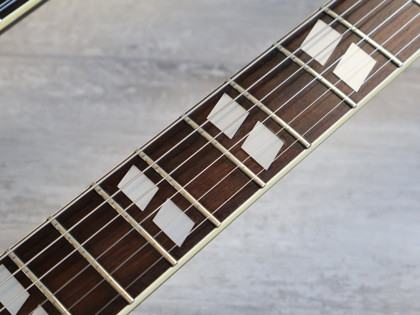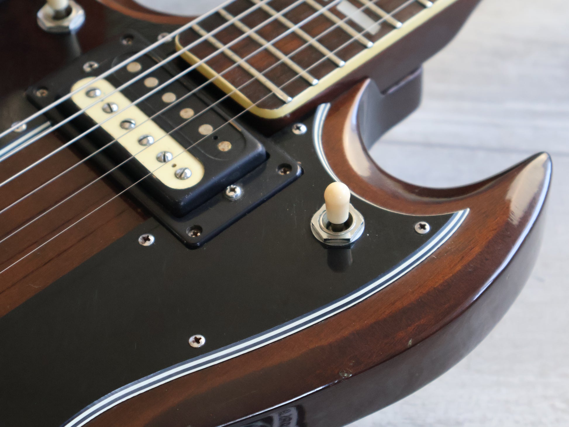 This one wears all the Gibson trimmings including an open-book headstock with a crown inlay and split fretboard inlays, loaded with the original Ibanez Super 70 humbuckers and seemingly all original hardware with the exception of the knobs.