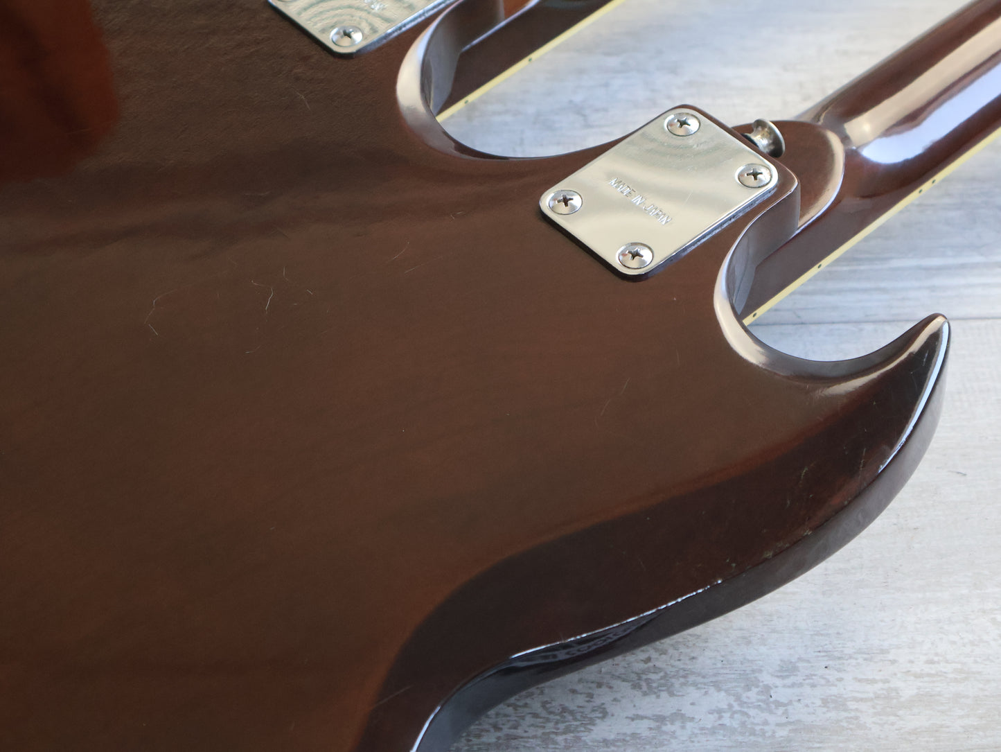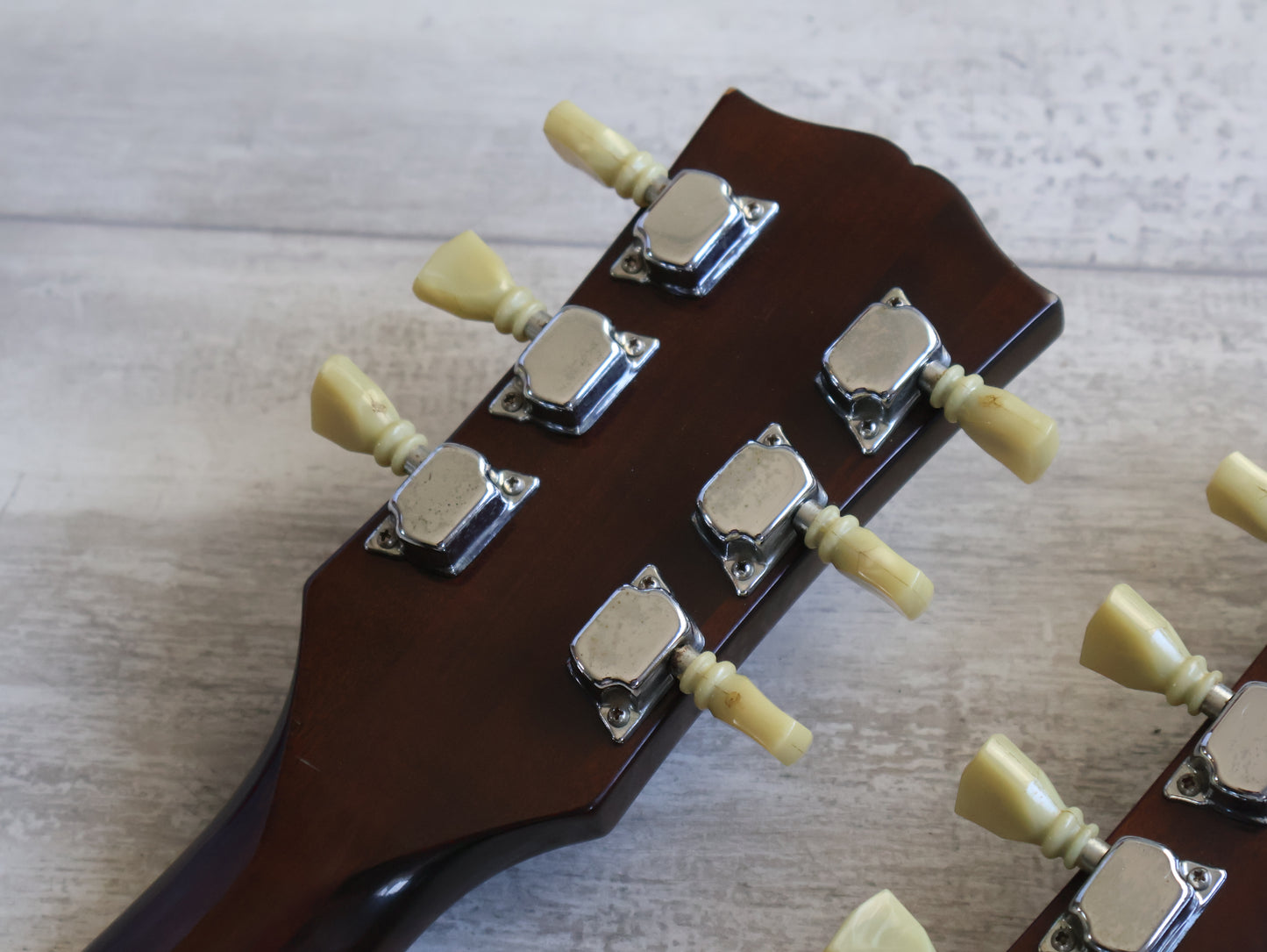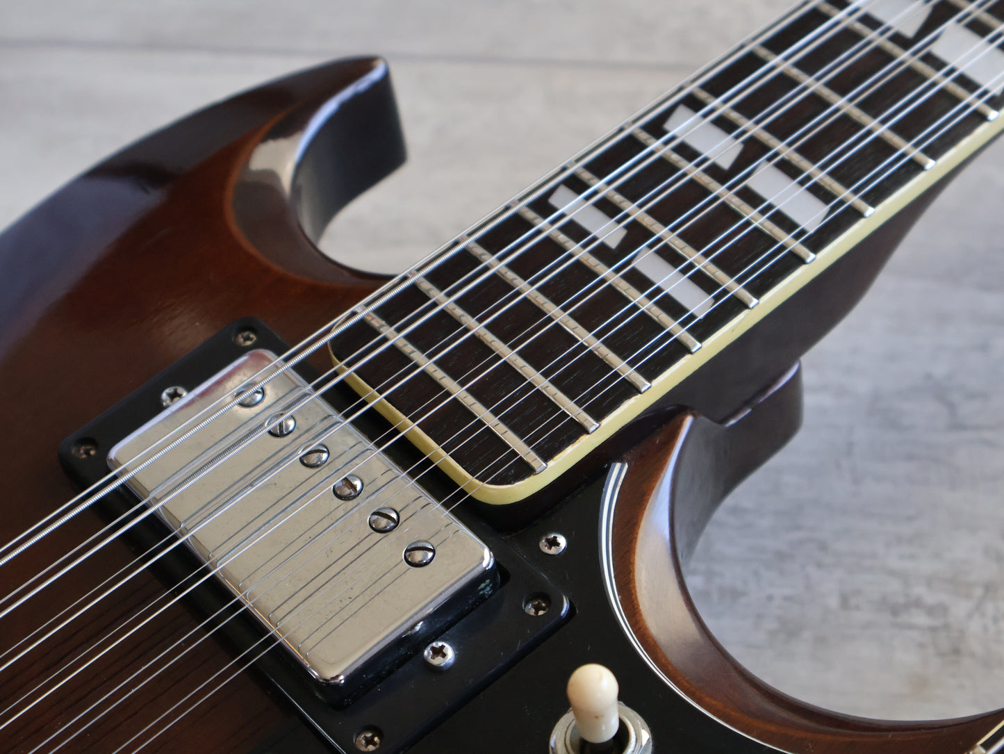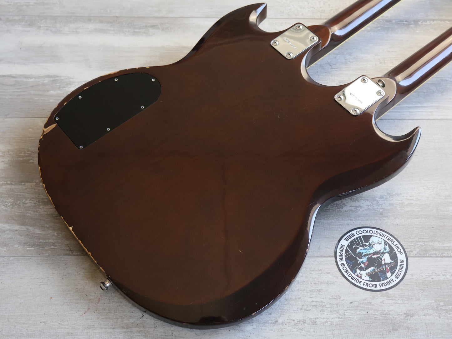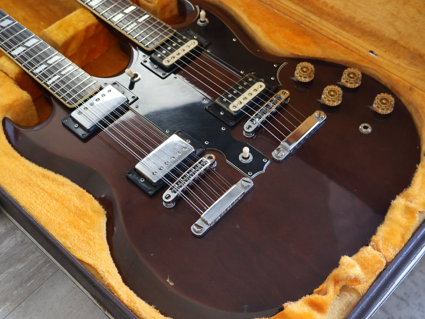 Wearing the very rare Walnut finish (that was only used for a year or two before being discontinued) on a big beefy mahogany body with two bolt-on maple necks and 20 fret rosewood fingerboards, it weighs a manageable 5.5 kg's.