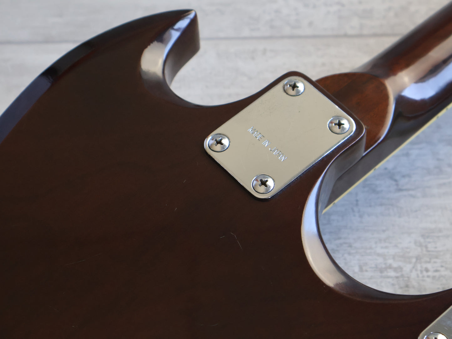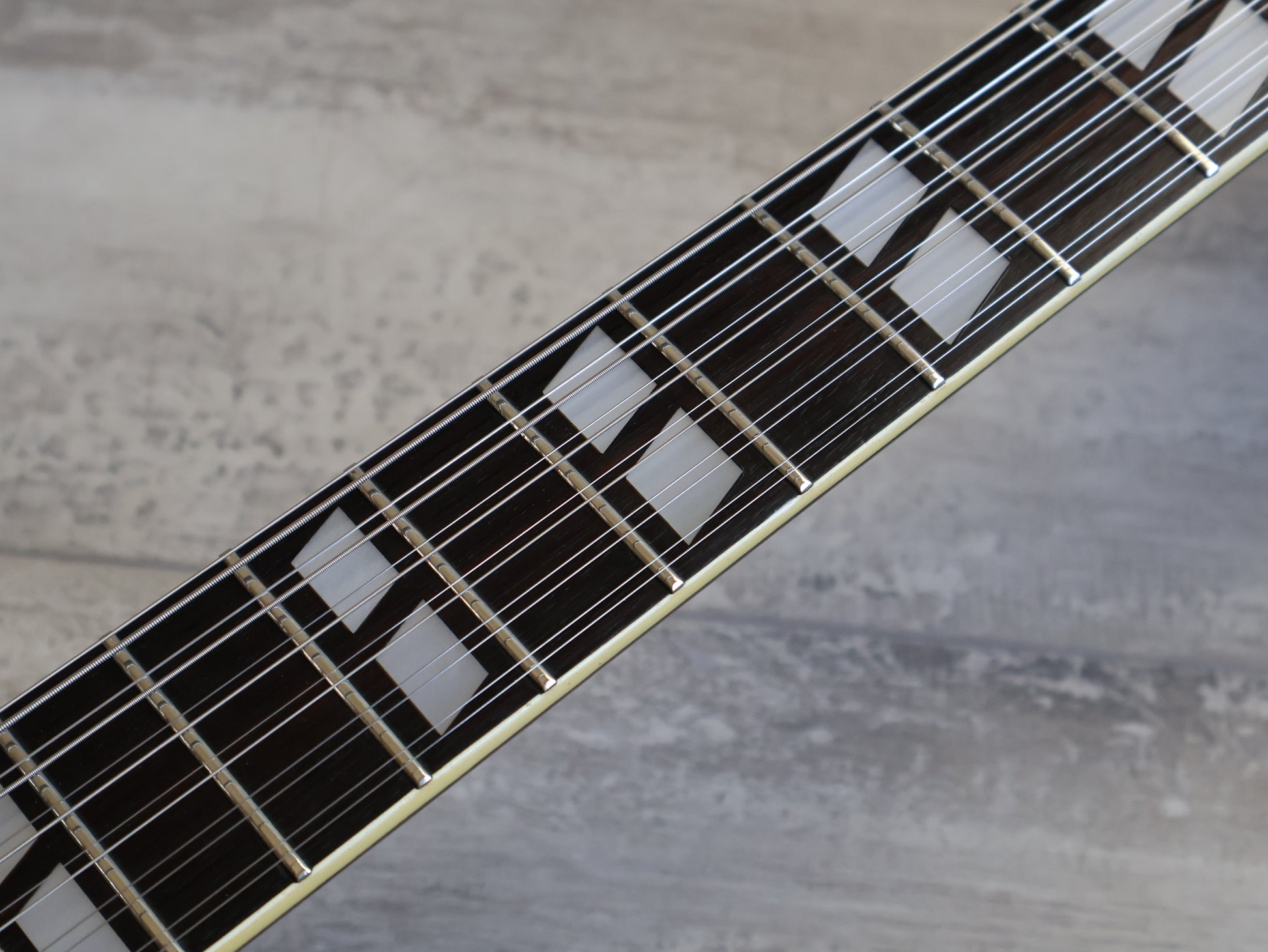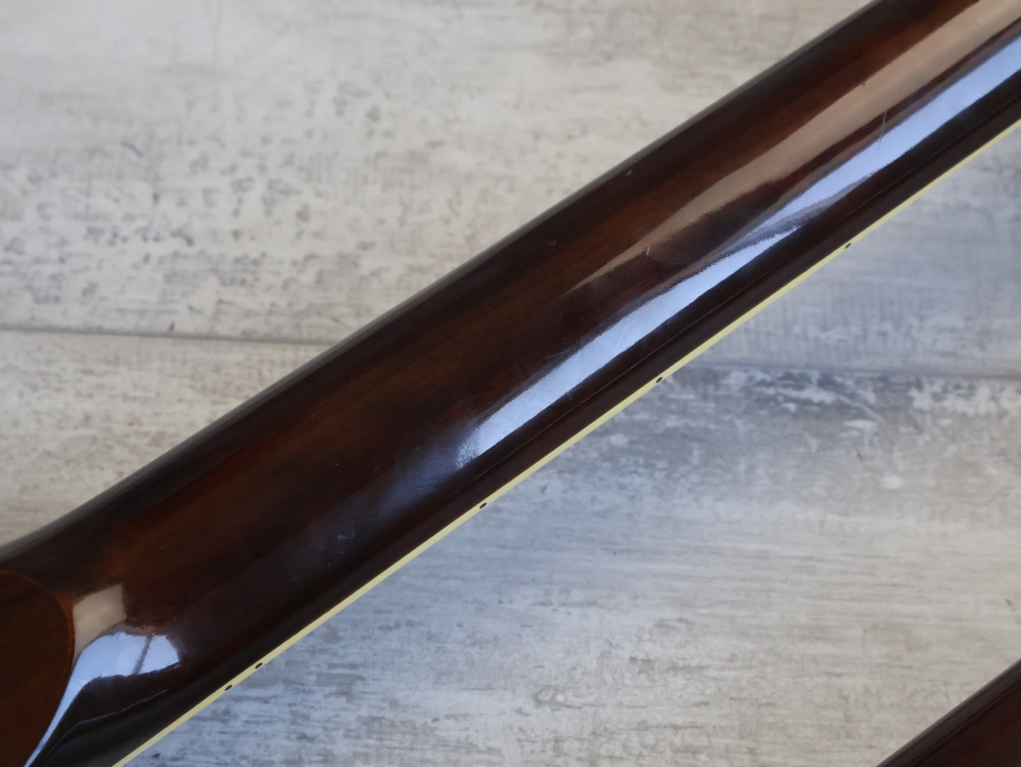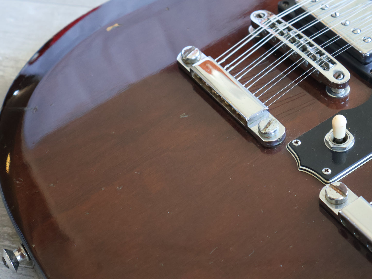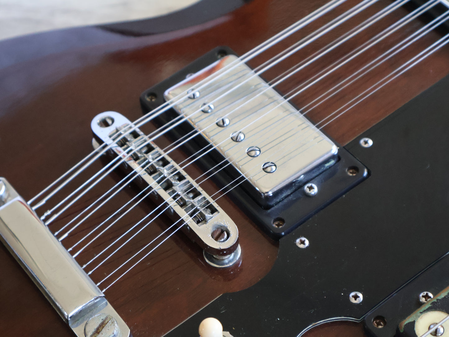 Wearing the very rare Walnut finish (that was only used for a year or two before being discontinued) on a big beefy mahogany body with two bolt-on maple necks and 20 fret rosewood fingerboards, it weighs a manageable 5.5 kg's.