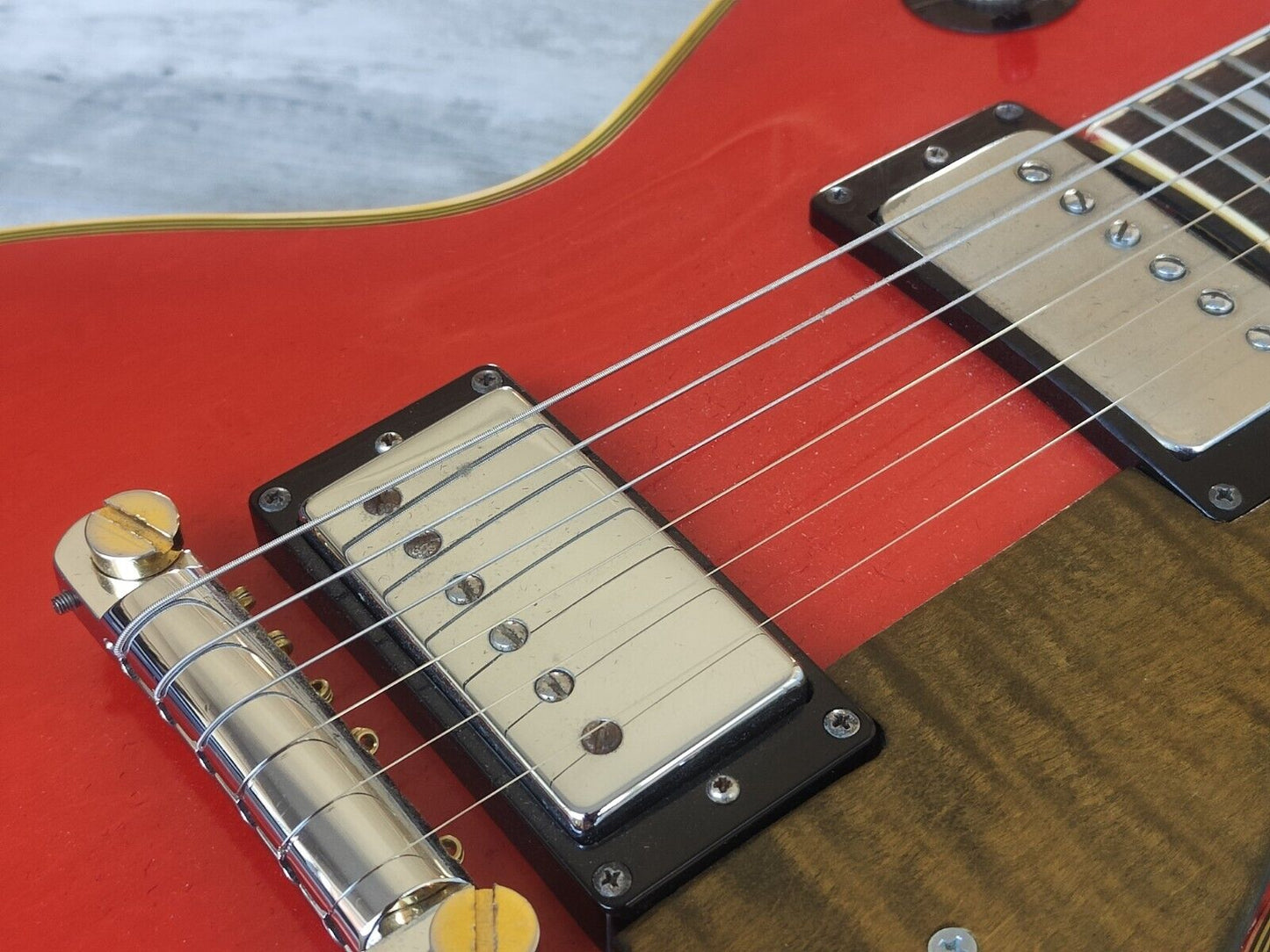Matsumoku made in the mid 1970's, this Aria Pro II LC Series Les Paul Custom is made with a pancake mahogany body with a maple top, slim 60's mahogany neck and a rosewood fingerboard, weighs 3.8kg's. Previous owner converted the bridge and refinished the top in transparent red along with replacing many of the parts such as the knobs, pickguard and possibly the pickups.