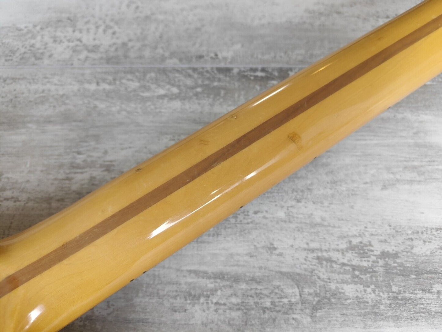 Made in Japan by Fernandes in 1976, the FST-75N was their take on the CBS style '70's Fender Stratocaster. Natural finish on a pancake ash body with a one-piece maple neck (fretless wonder style fingerboard), it weighs 3.8kg's. Full CBS aesthetic with a three-bolt neck design with a tilt adjuster for the neck angle along with a bullet truss and dual string trees. This one seems to have an aftermarket volume pot, pickguard and bridge pickup (rail-style humbucker, unbranded). The original bridge system and Fernandes stamped tuners both function as they should.