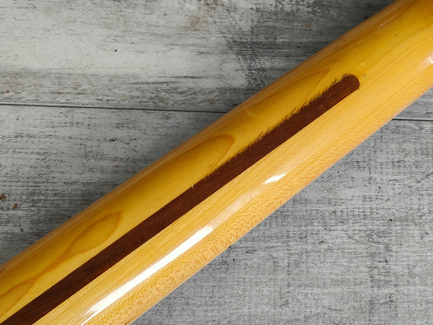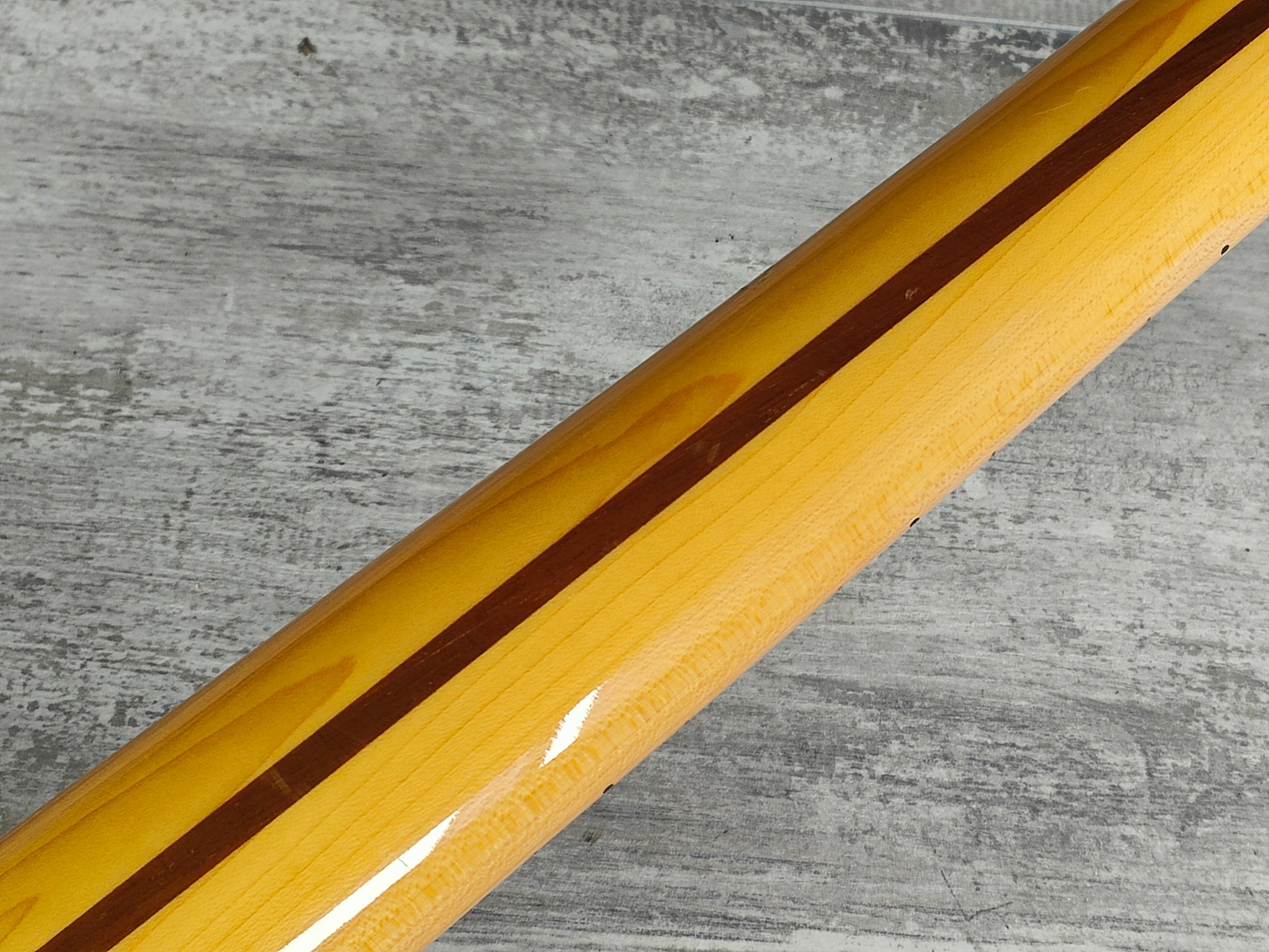 Given a basic setup and service prior to listing, the truss works as it should and the neck is straight with a smooth action and shiny frets with plenty of life left. The clear coat on the skunk stripe is cracking slightly but is smooth to the touch and barely noticeable when playing.
