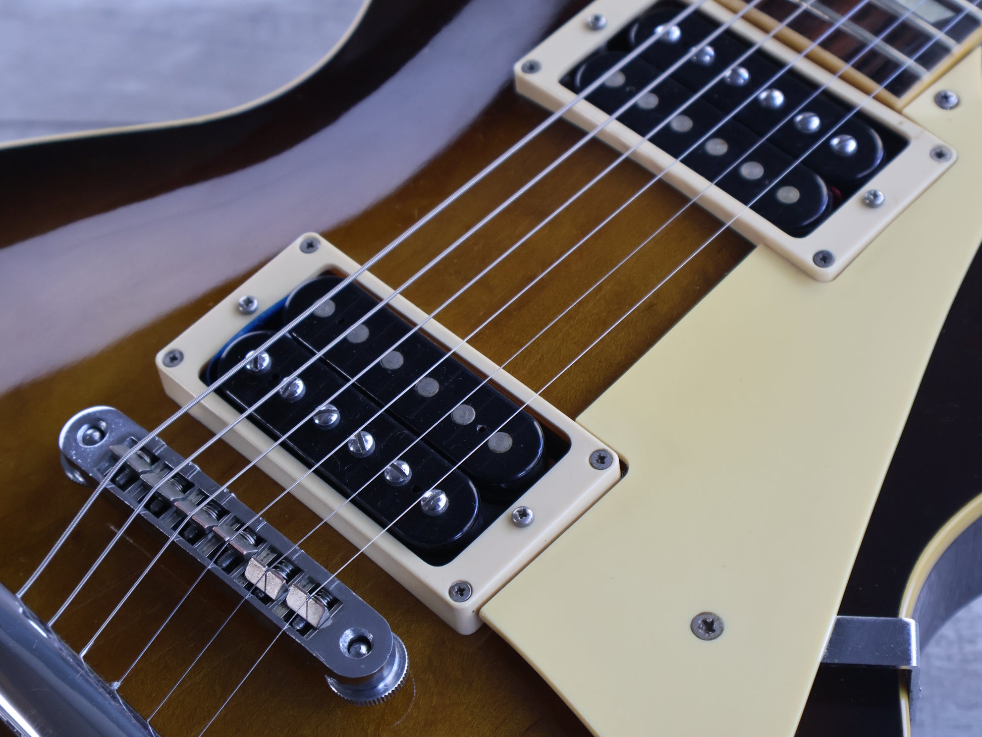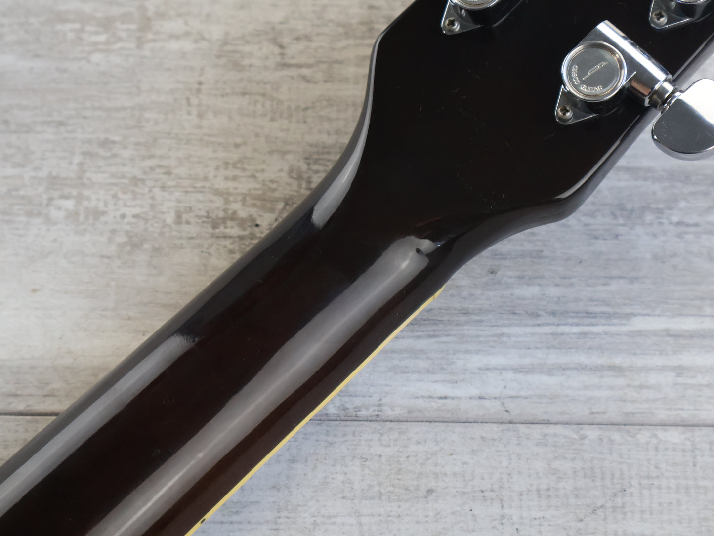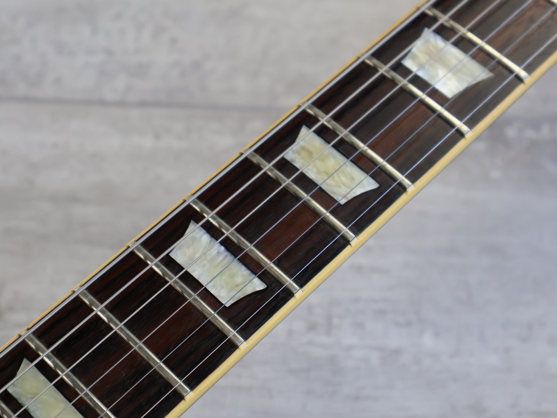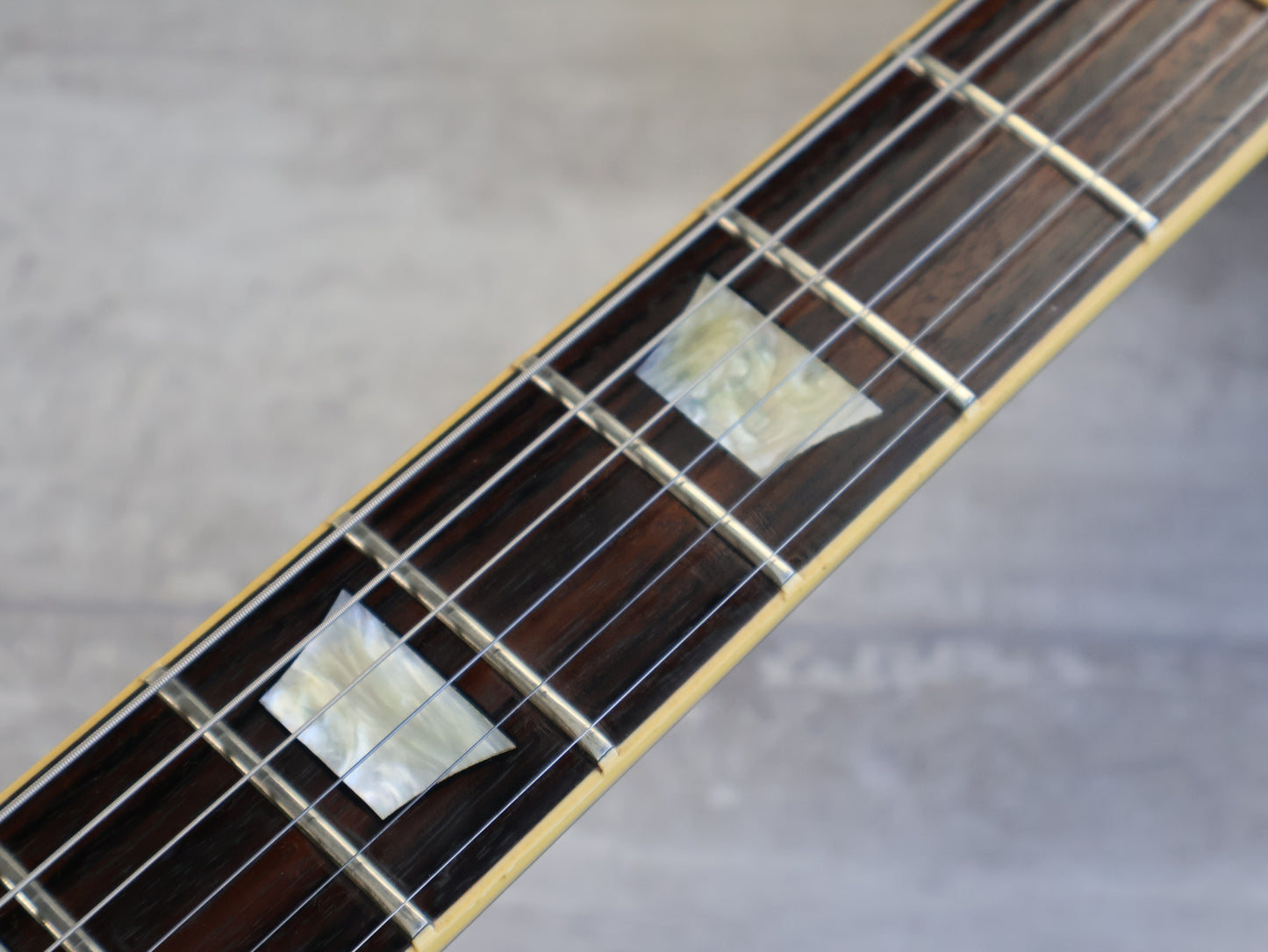 Made by the Fujigen factory in 1977, the EG-700 was a mid-tier model from the Greco catalog and is mostly notable for being one of the heavier models in their range (with this one weighing just over 4.7kg's). Pancake mahogany body with a maple top, slim 60's neck profile with a 22 fret rosewood fingerboard (44mm nut width). Loaded with the original critically acclaimed Maxon humbuckers along with Greco stamped tuners and Japanese pots/hardware, this one seems to be all original with the exception of the missing pickup covers and the coil split mini toggle for the bridge pickup.