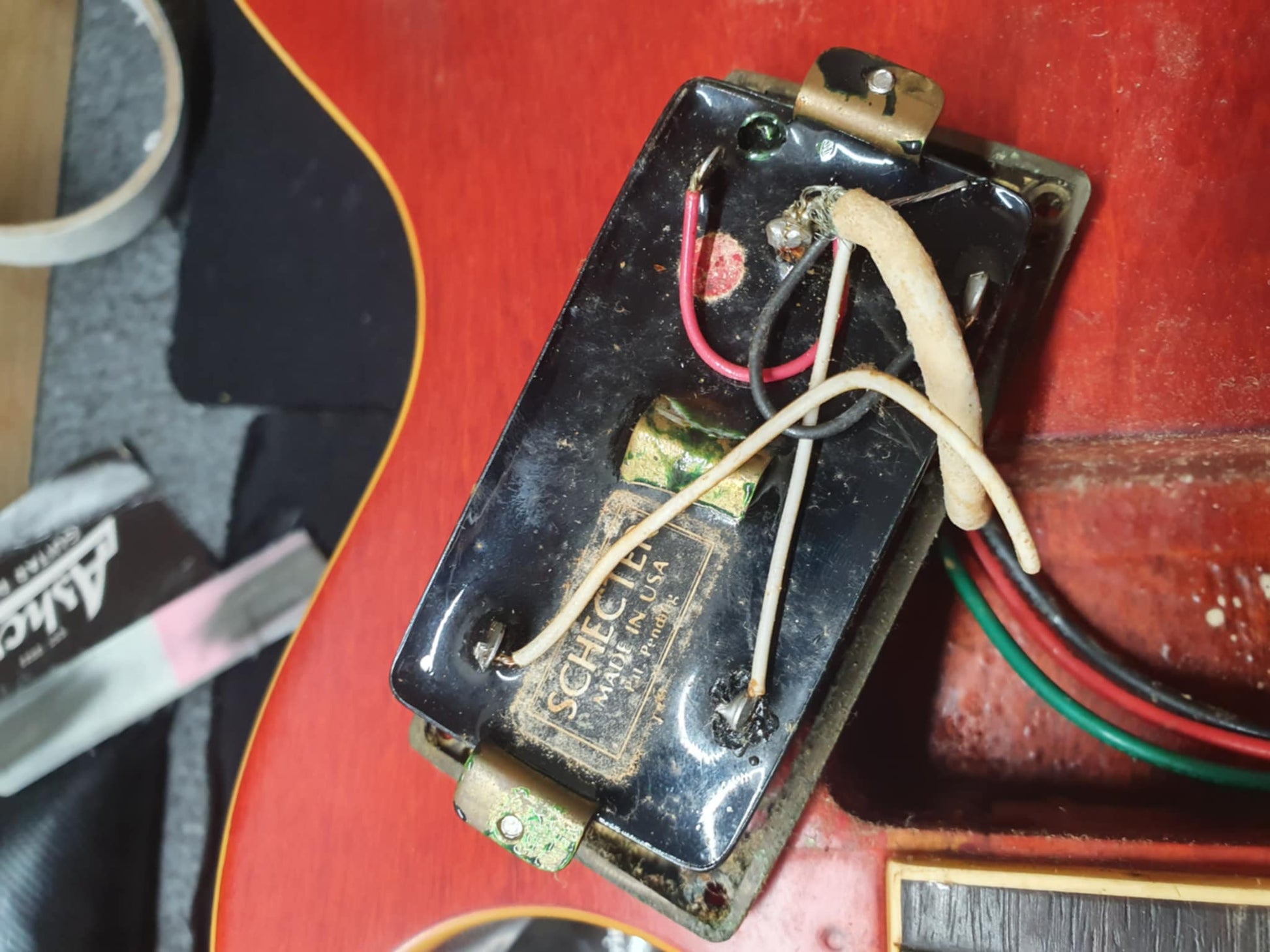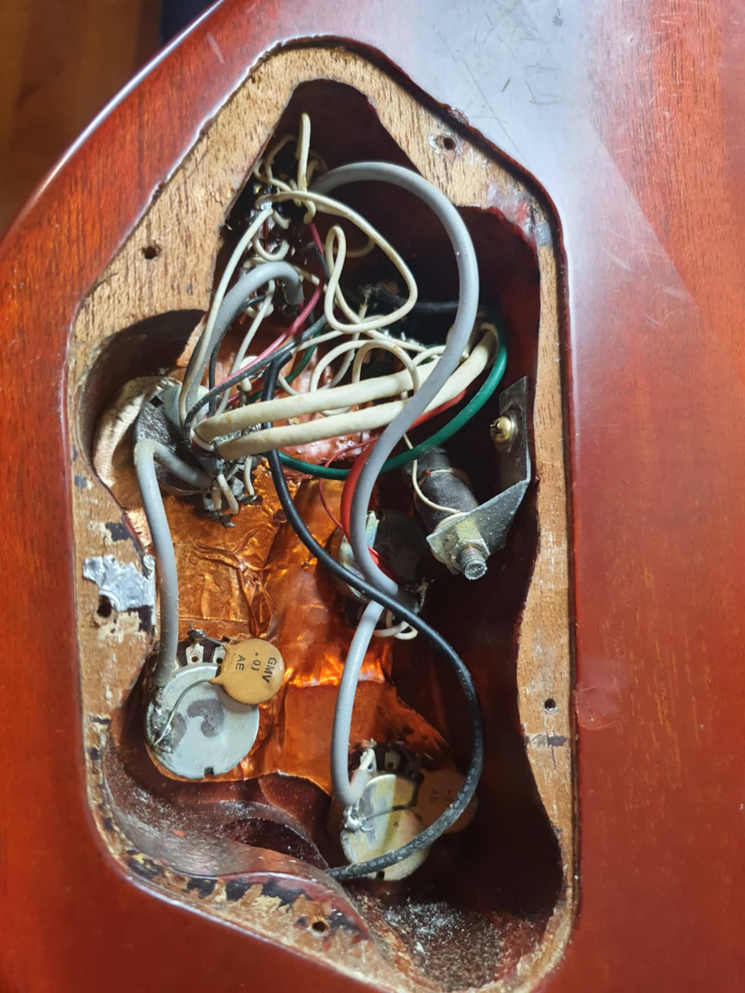 Made by the Fujigen factory in 1977, the EG-700 was a mid-tier model from the Greco catalog and is mostly notable for being one of the heavier models in their range (with this one weighing just over 4.6kg's). Pancake mahogany body with a maple top, slim 60's neck profile with a 22 fret rosewood fingerboard (44mm nut width). This one's been heavily modified with a new finish, aftermarket bridge, 6-way rotary switch and three mini toggles for a bunch of different series/parallel style options on the two Schecter USA Pat Pending humbuckers.