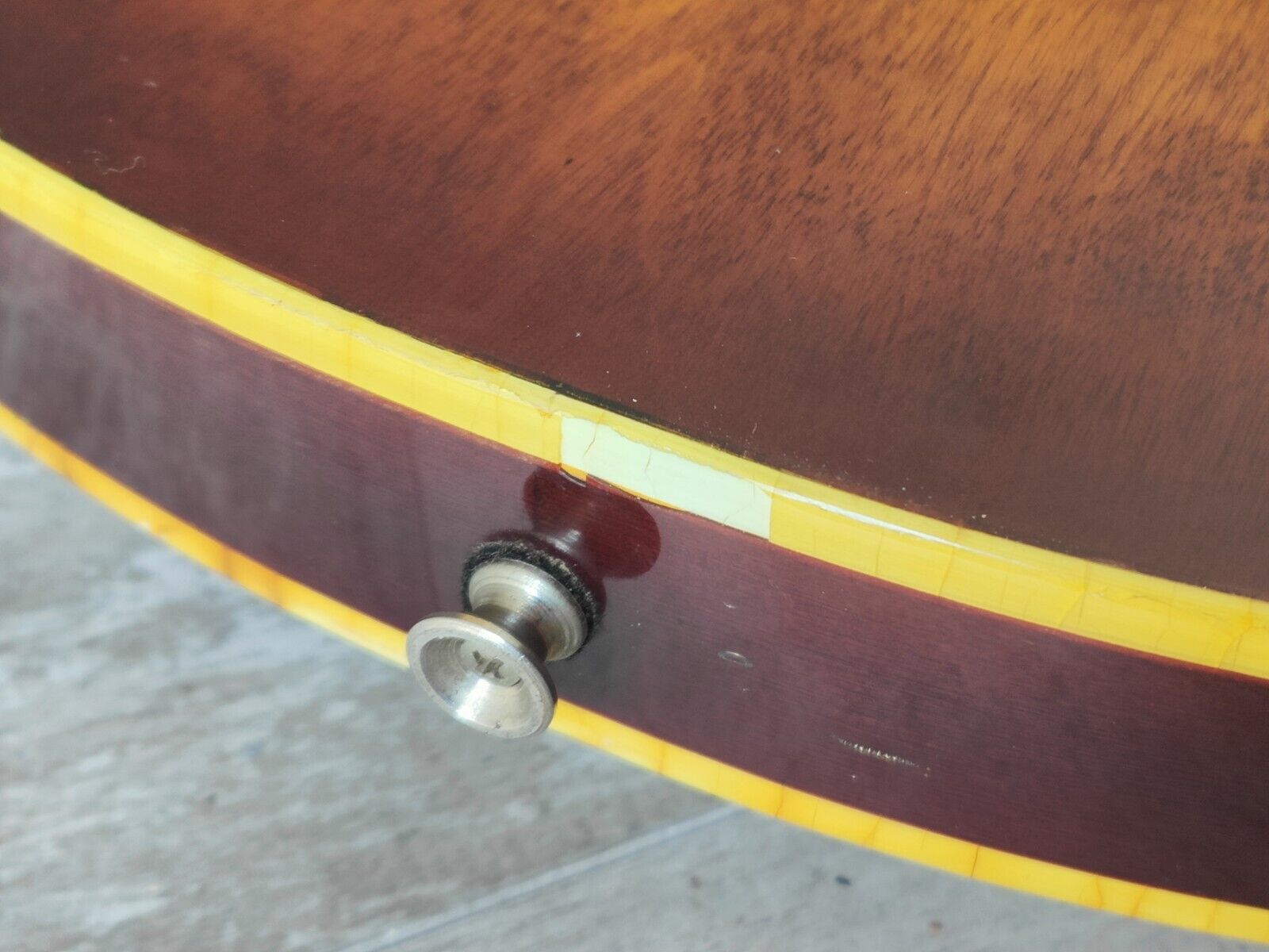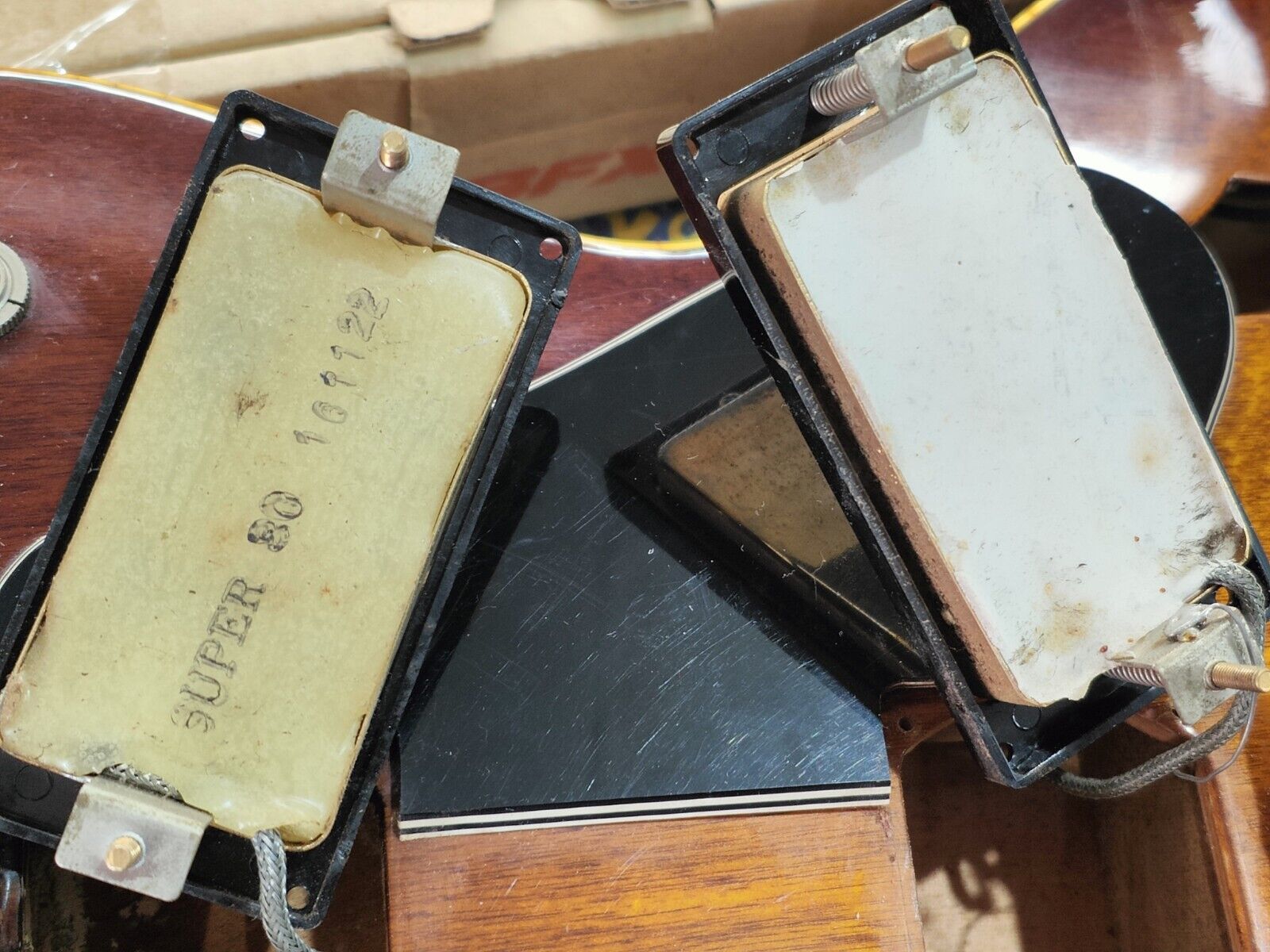Interestingly this one has no sign of a strap button anywhere near the neck joint or either horns and it also has a second output jack where a usual Left Handed one would be on the opposite side of the body. We suspect it was custom ordered to have the output jack there to wrap around the strap button and was played with a banjo-style strap tied to the headstock (like i said, we grabbed this because it's a fascinatingly cool guitar!).
