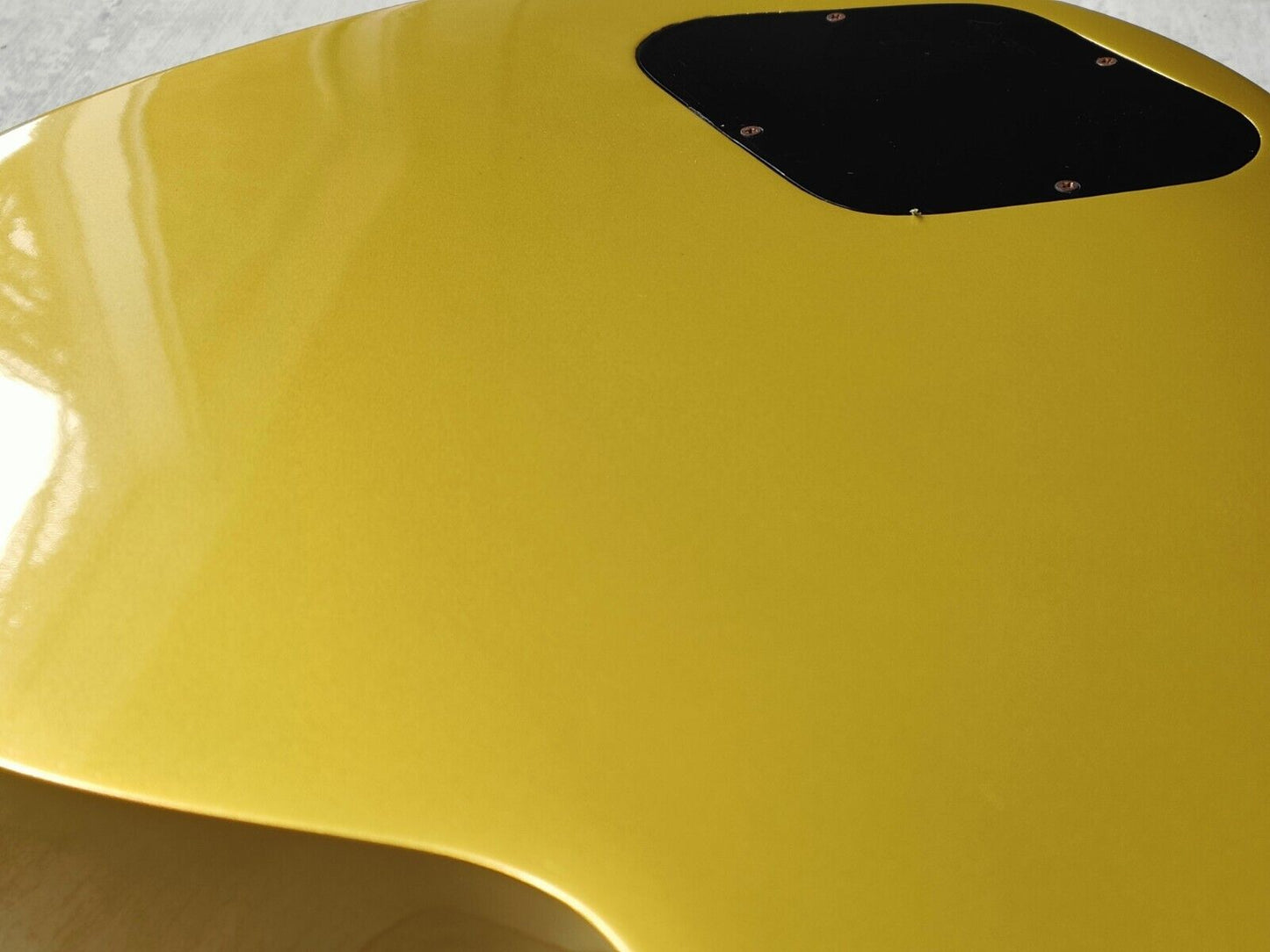 This one was completely painted in gold prior to receiving a full professional setup and service, the finish is spotty but suits the age of the guitar well. The frets were polished and are shiny and smooth with some light pitting/playwear, the neck is straight with a fully adjustable truss.