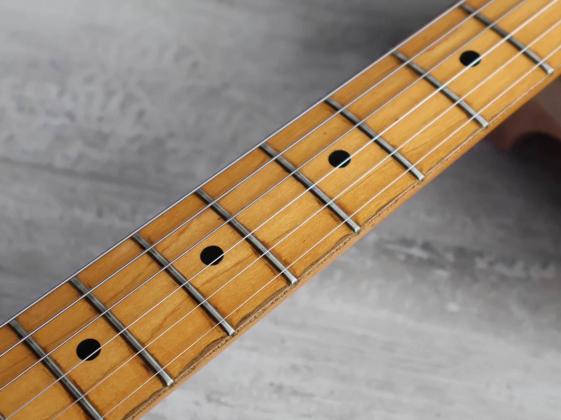 Looks to be all original as pictured with plenty of wear from general use but overall it's a well cared for and well loved vintage guitar. The frets have plenty of life and play smoothly, the neck is straight and the truss works as it should. There's some sticker tan from a previous owner giving it a two-tone competition stripe vibe.