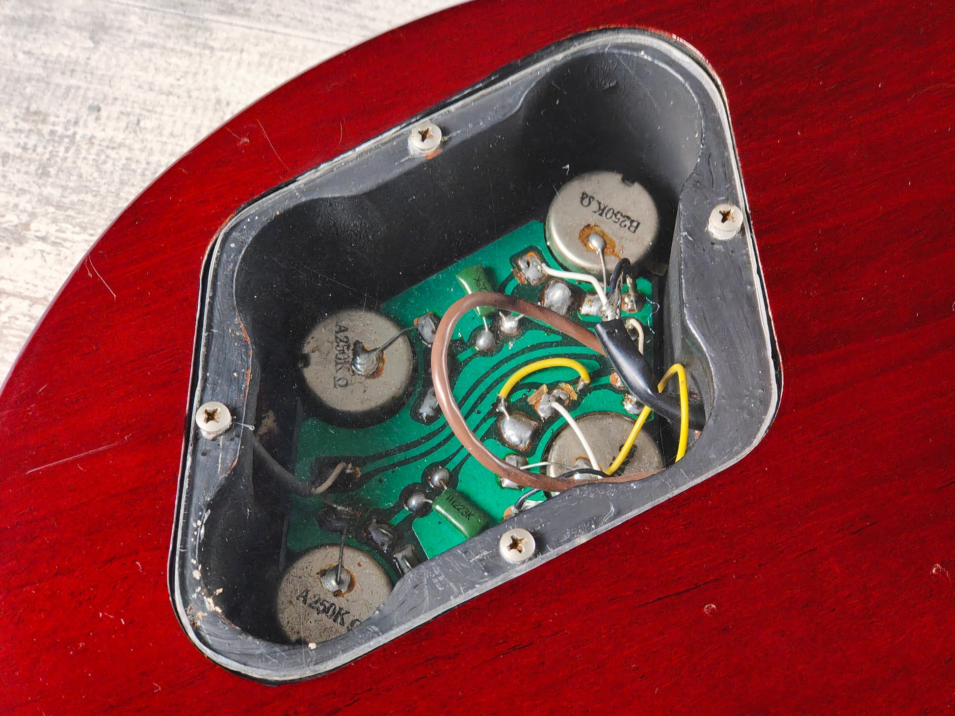 This one has a pair of vintage Dimarzio humbuckers installed along with clear back cavity covers, a replacement nut and a new set of knobs.