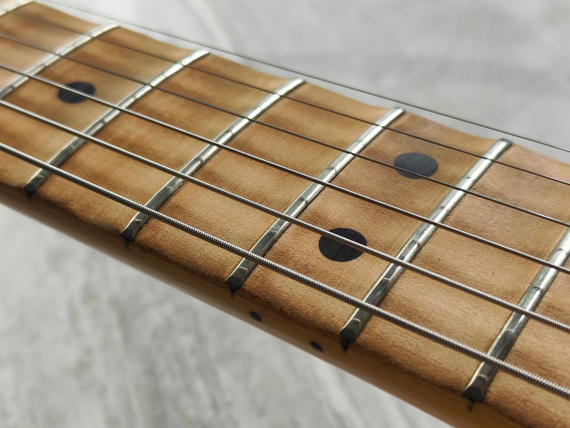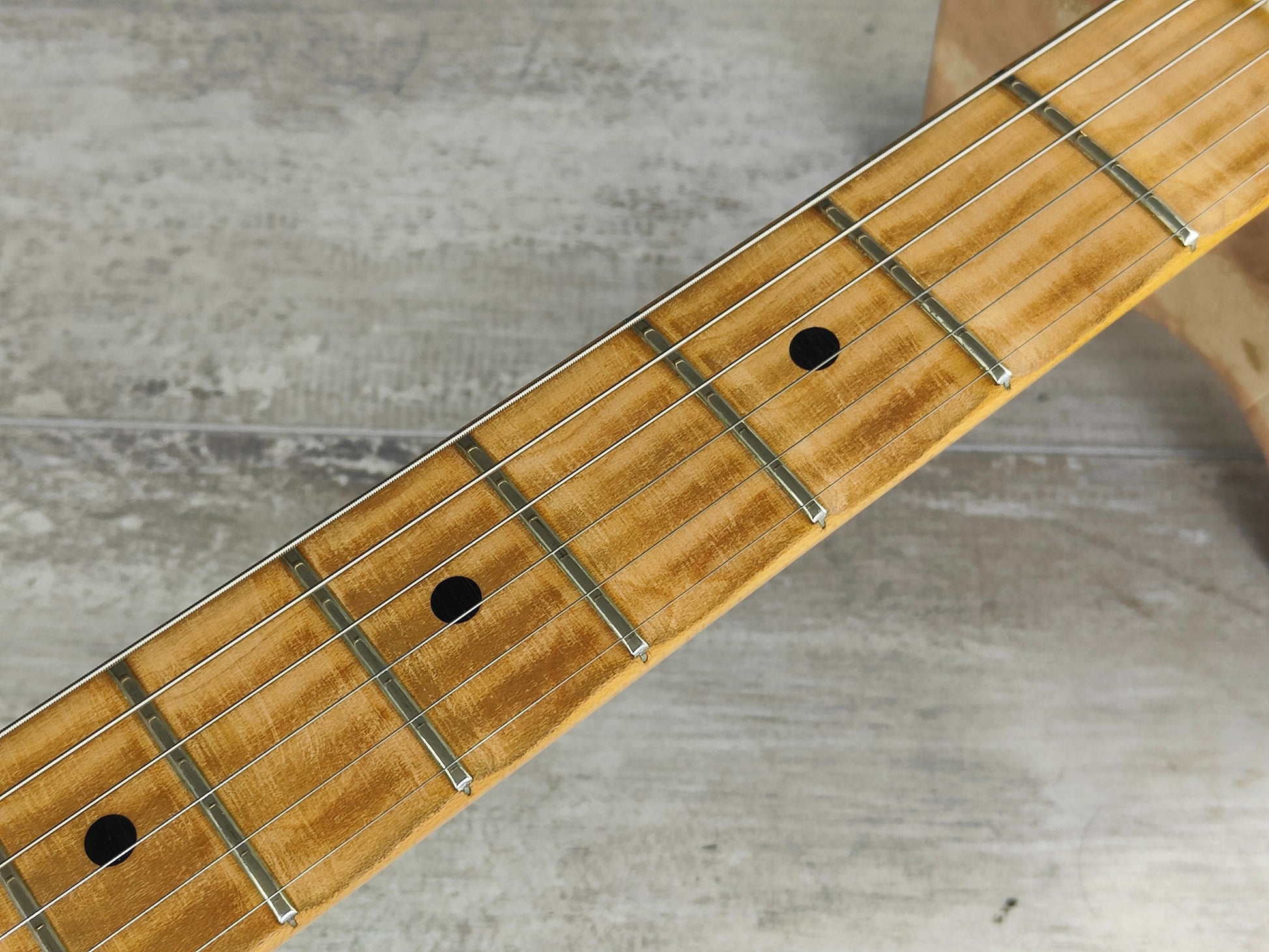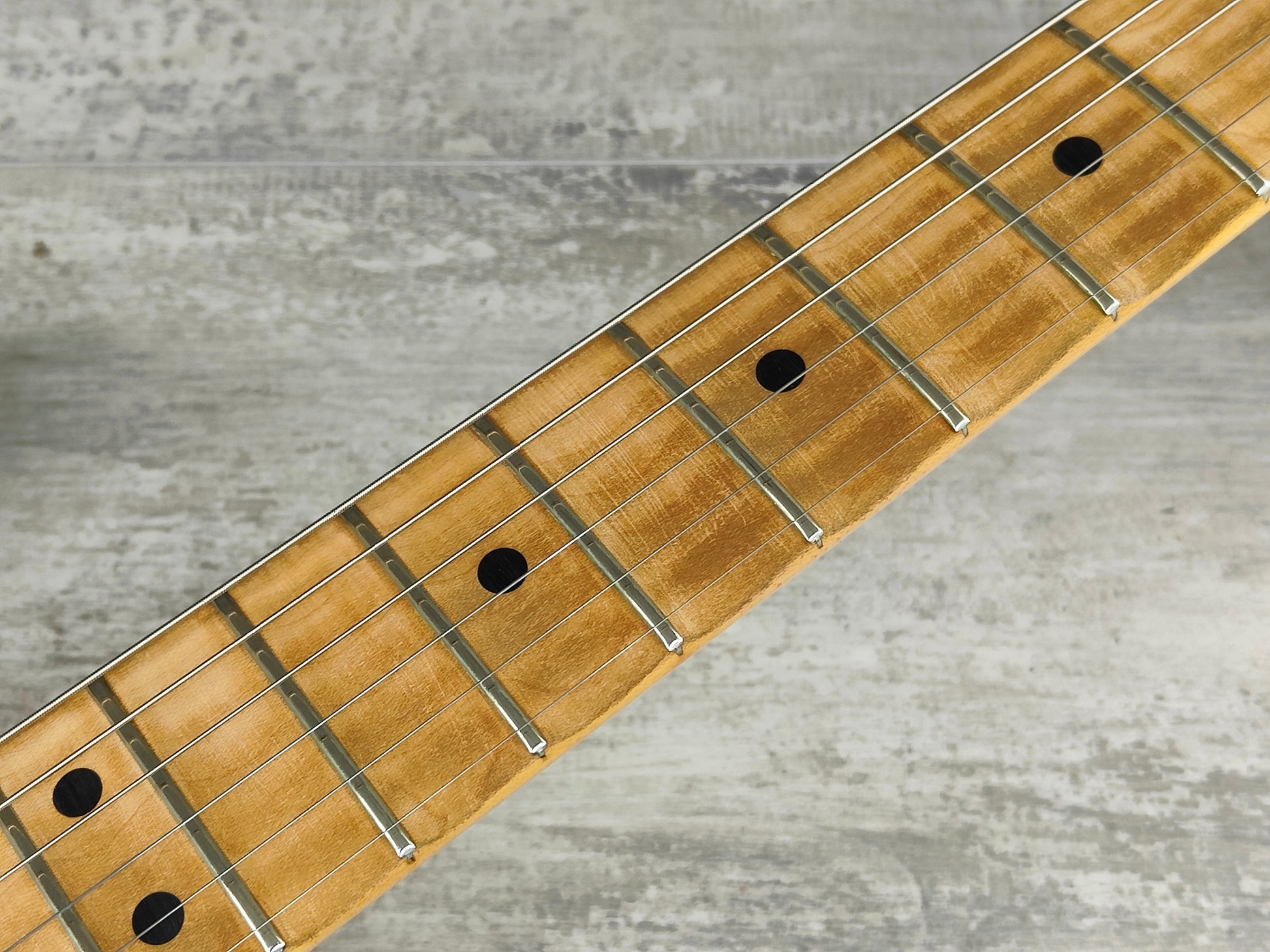 Good overall vintage condition as pictured with regular wear and cosmetic blemishes. The neck is nice and straight and the truss is adjustable, frets are clean with some light playwear but play smooth and are shiny with life left. The scallop work seems to be reasonably professional and is level across the fretboard, definitely not a DIY job.