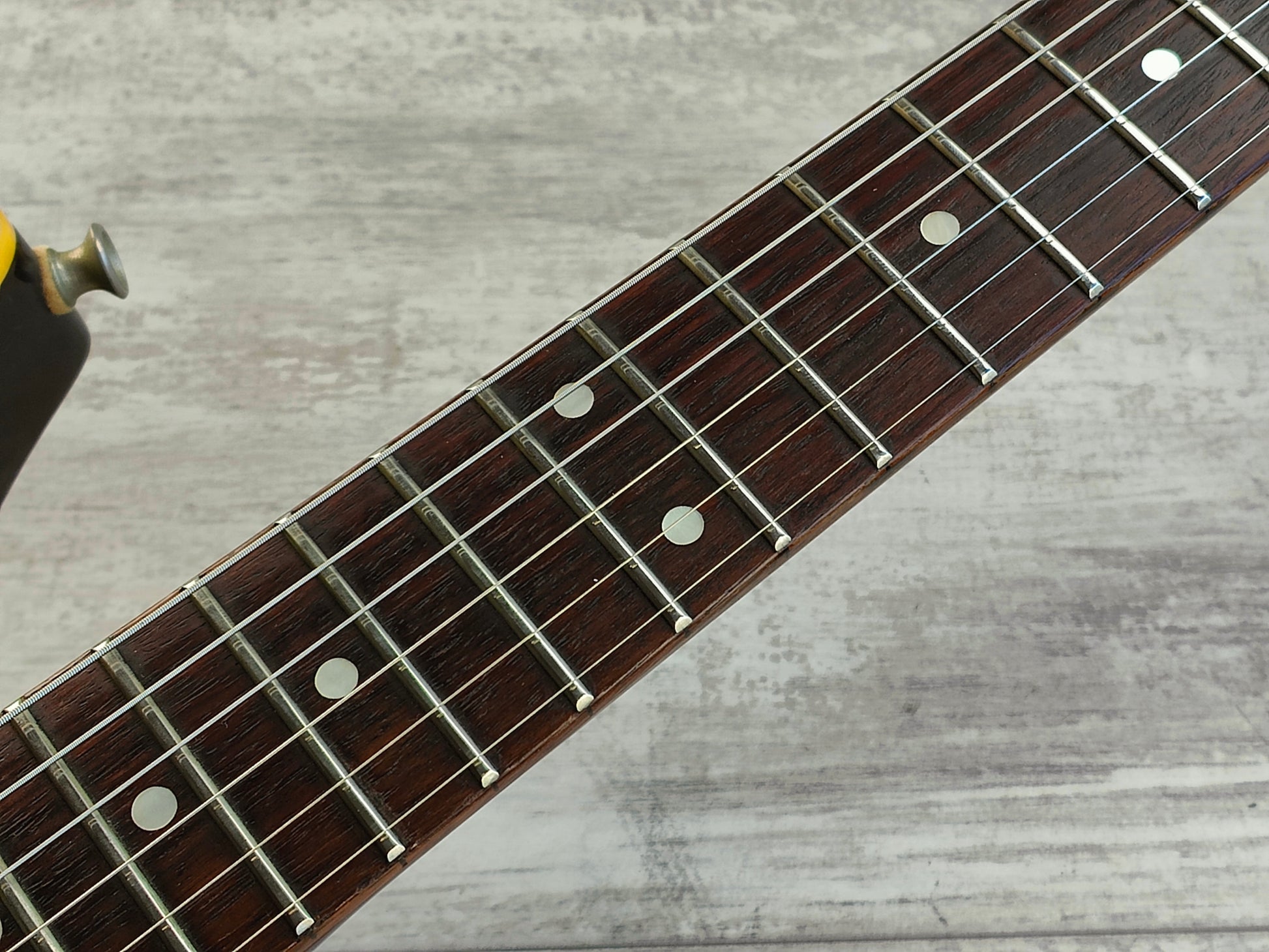 The Brawler is a compact, nimble design with a modified "tulip" ash body with a set maple neck and 24 fret rosewood fingerboard (628mm scale length), weighs in at a reasonable 3.6kg's. Loaded with a pair of original Maxon single coil pickups and the famous GO style floating tremolo system (missing the arm). Wiring includes two volume knobs, a master tone control and a series/parallel pickup switch.