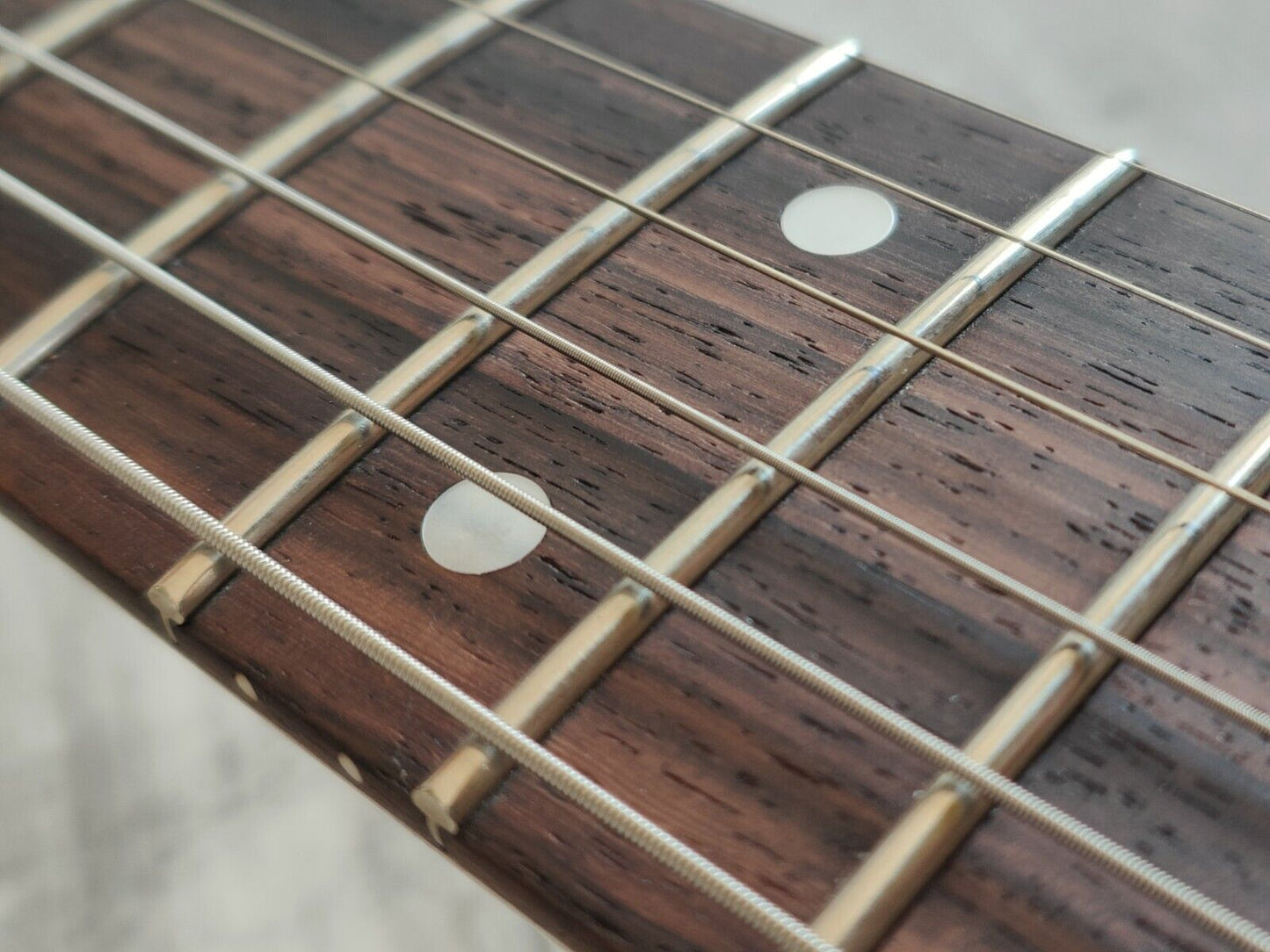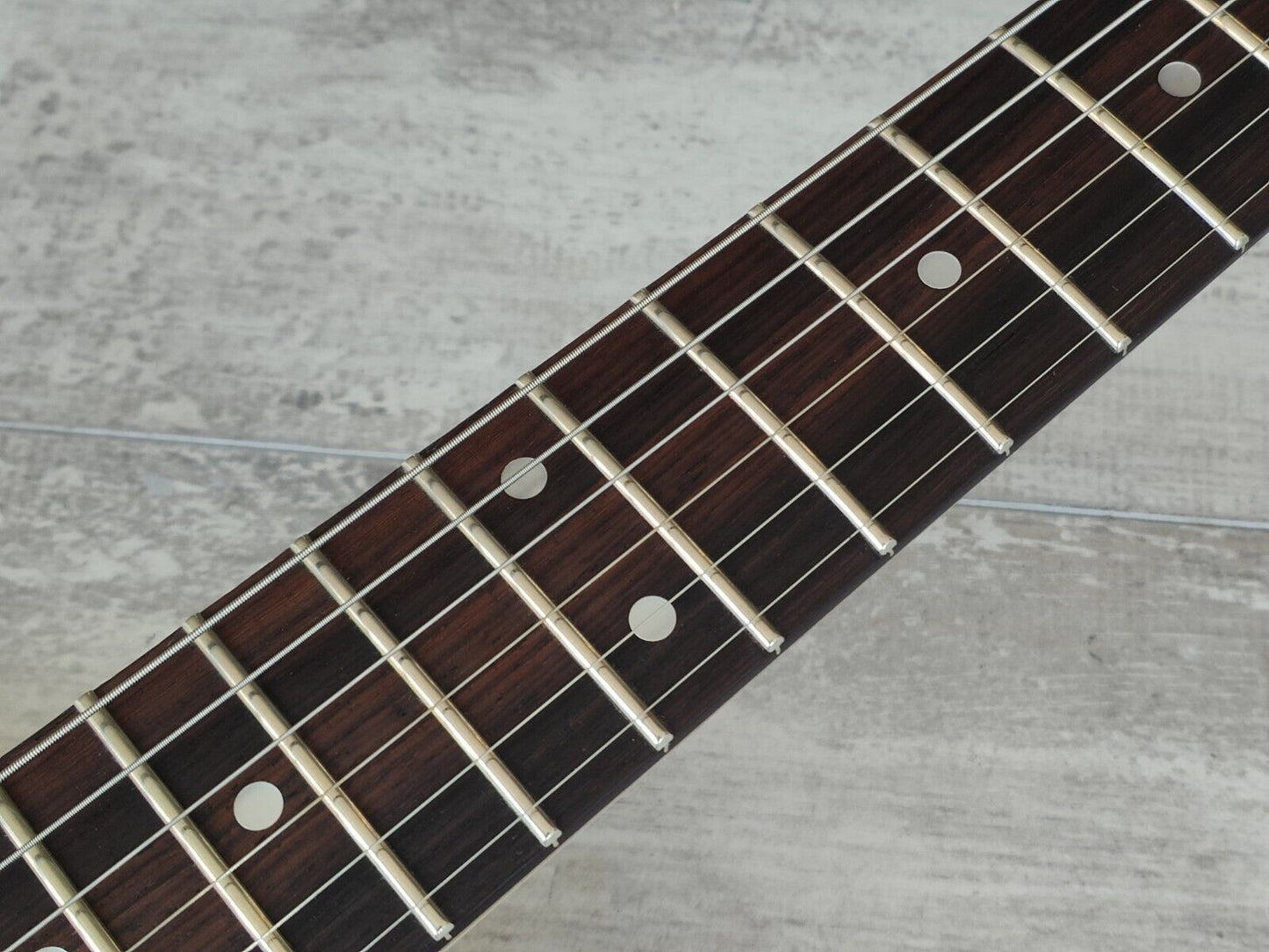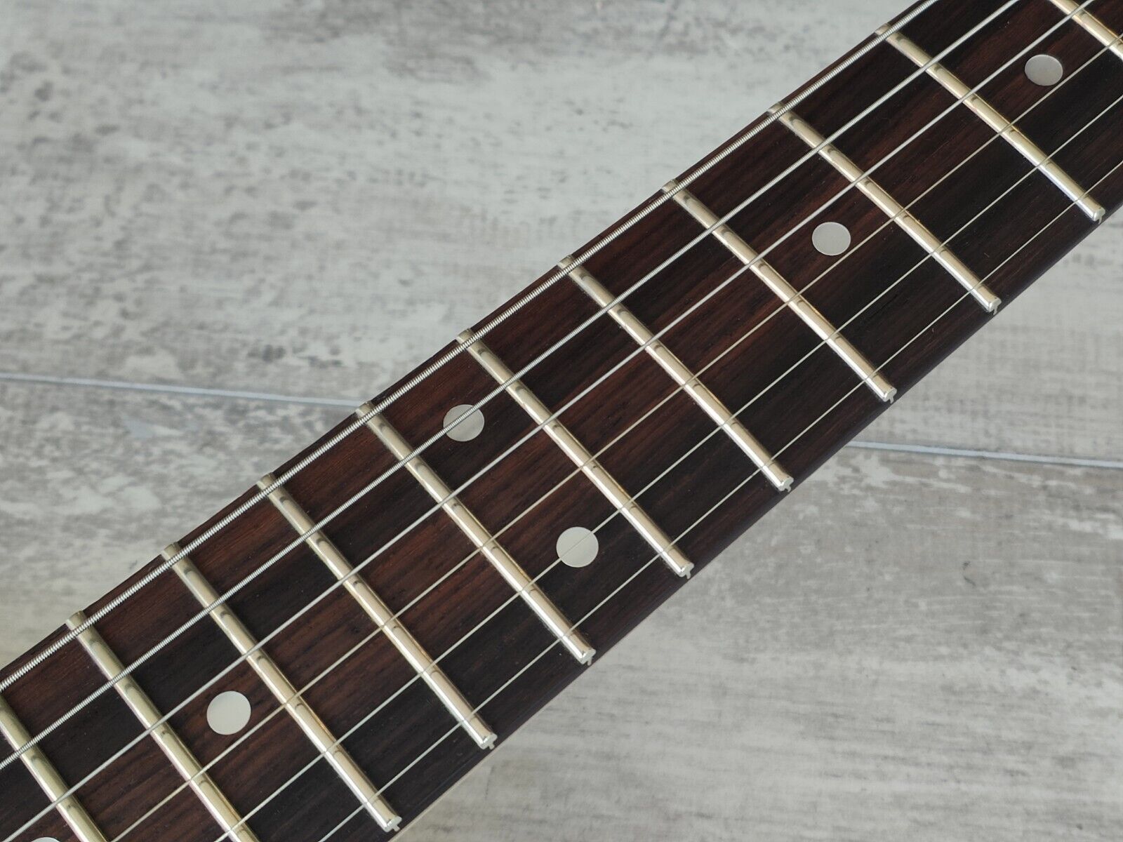 This one came to us in a very sorry state and was completely rebuilt by our in-house tech Vaughan. The fretboard was completely re-radiused to remove a very shallow scallop attempted by the previous owner. There's still plenty of depth left in the neck with all the inlays on both the top and side of the neck still perfectly visible. The back of the neck was lightly sanded and buffed back to a satin feel along with the paint being removed from the side of the fingerboard to create a smoother playing experience. It was then re-fretted with brand new jumbo frets and set-up with a smooth low action. Cosmetically there are plenty of bumps and bruises on the finish as pictured.