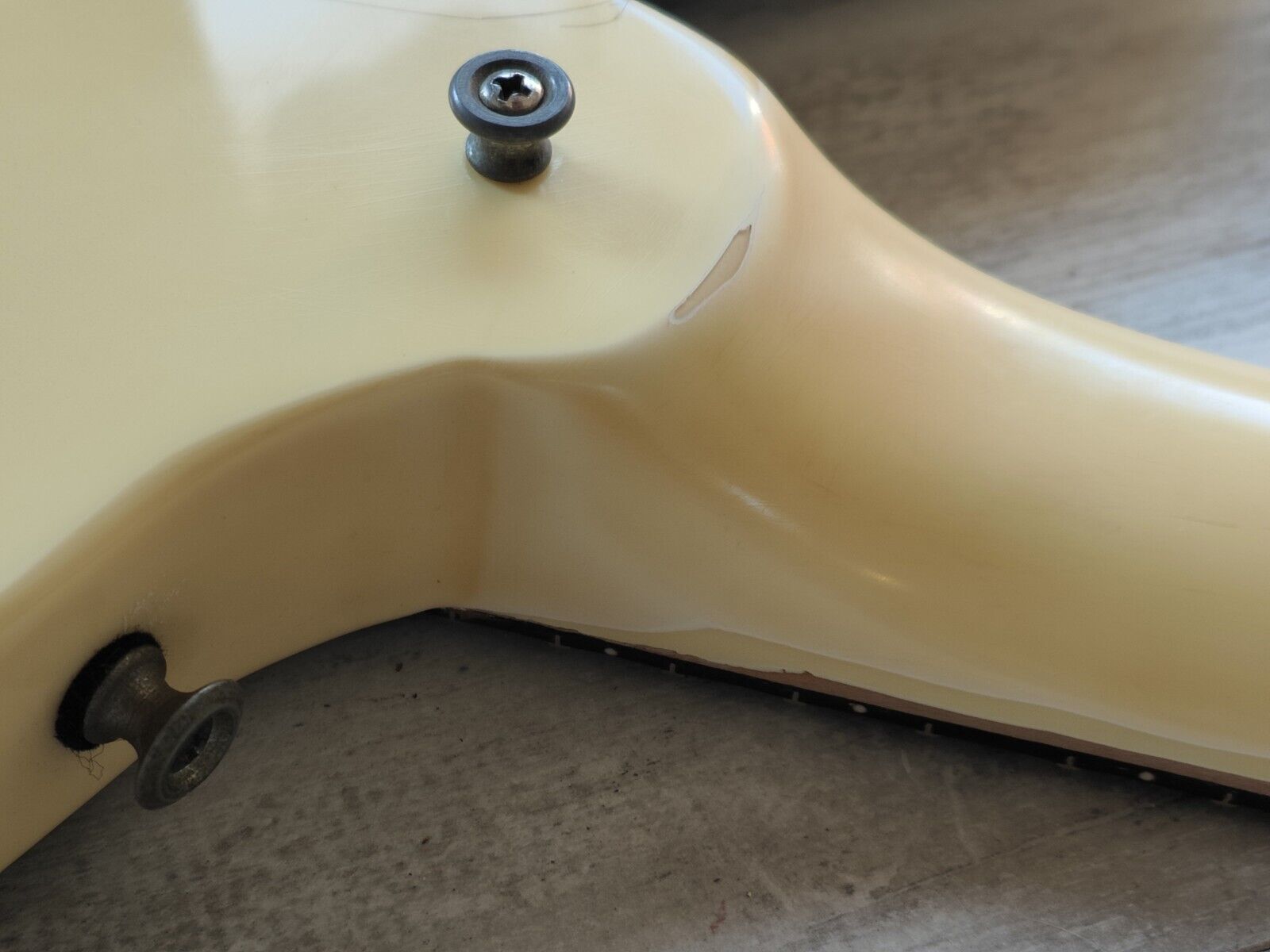 Made by the Fujigen in February of 1978, the EX800W was a non-catalog variant of the Greco EX range to feature a white finish. Sen (ash) body with a maple neck and a 22 fret rosewood fingerboard (9.5" radius, 44mm nut width), it weighs 3.9kg's. Loaded with the original Maxon PU humbuckers and Greco stamped tuners.