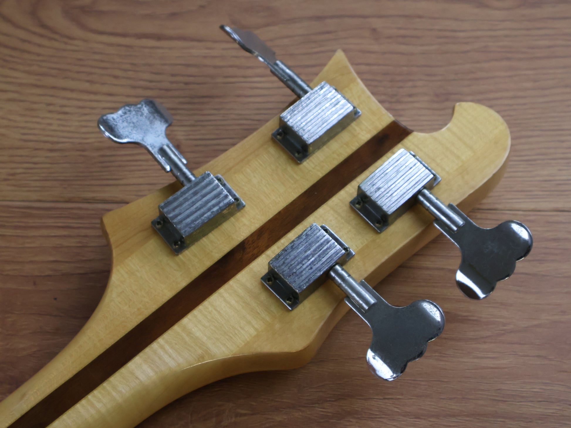 Solid bound maple body with a maple neck and glossy rosewood fingerboard, it weighs 3.7kg's. Loaded with the original RB style pickups (missing cover on the bridge pickup) controlled by two volume and two tone controls, this one appears all original with waffle-style tuners and a functional bridge mute.