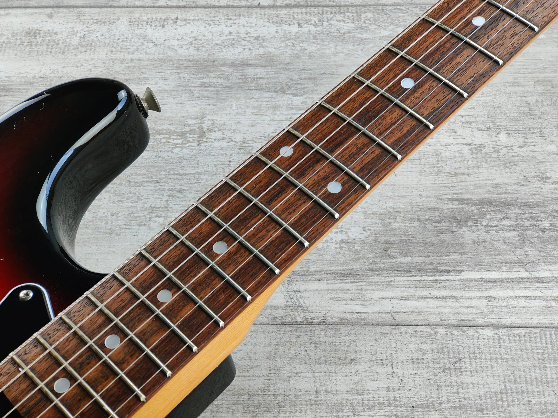 Made by the Matsumoku factory in 1979, the SE-500 was a mid-range model from the Aria Pro II catalog. Features a Sunburst finish on an ash body bolted to a '62 profile maple neck with a veneer rosewood fingerboard and weighs 3.8kg's. Appears to be all original except for a replacement neck plate.