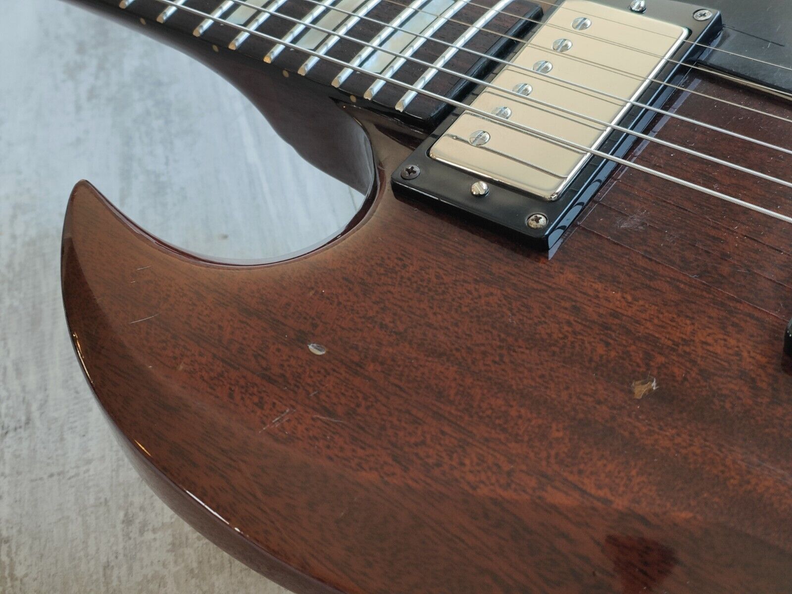 Given a full professional setup and service prior to listing including the previously mentioned re-fret. Overall it's in good vintage condition as pictured with some honest play-wear and cosmetic bumps/bruises. The neck is straight and the truss works as it should, it plays like a dream and is one heck of an SG.