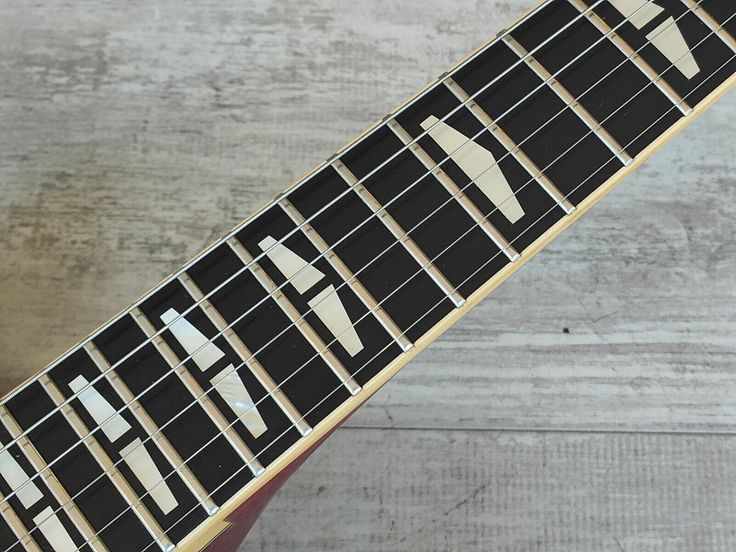 A heavily modified example that weighs in at 4.8kg's, it's built with a mahogany body, maple top, slim 60's mahogany thru-neck and an ebony fretboard (12" radius, 628mm scale length, 43mm nut width). This one's had a "Wonderbar" Shift 2001 tremolo system installed so you can divebomb forever along with the pickups changed to a set of 1970's Yamaha humbuckers wired with two volumes, two tones and one push/push pot acting as a killswitch.