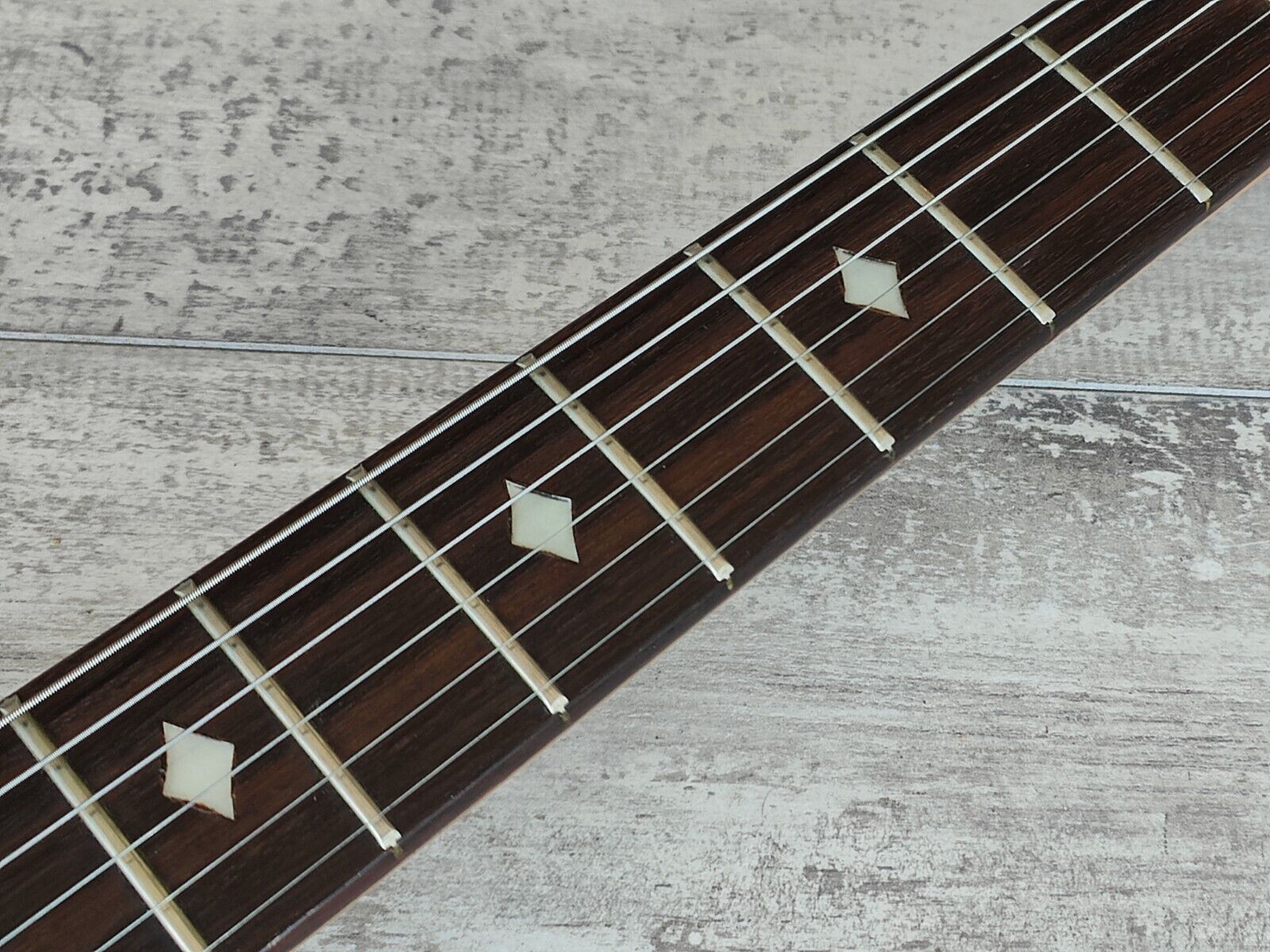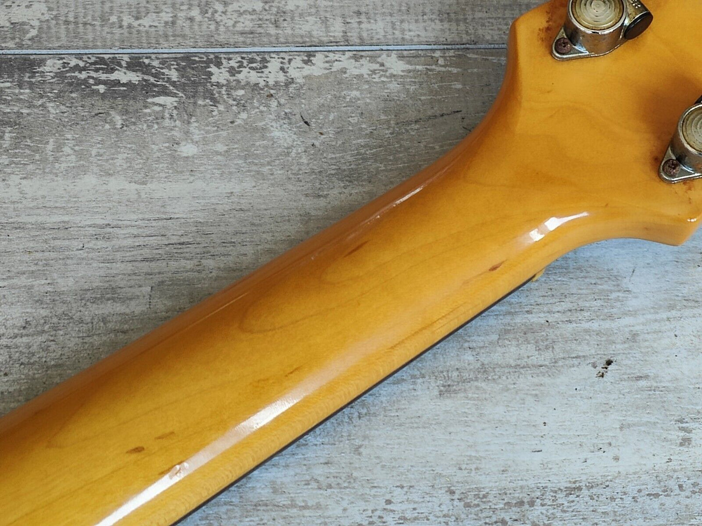 Clean overall vintage condition as pictured with regular wear and cosmetic blemishes. There's some slight separation in the finish along the factory joins on the body/neck and a few small bumps and bruises but no structural damage or repairs. The neck is nice and straight and the truss is adjustable, frets are clean with some light playwear but play smooth and are shiny with plenty of life left.