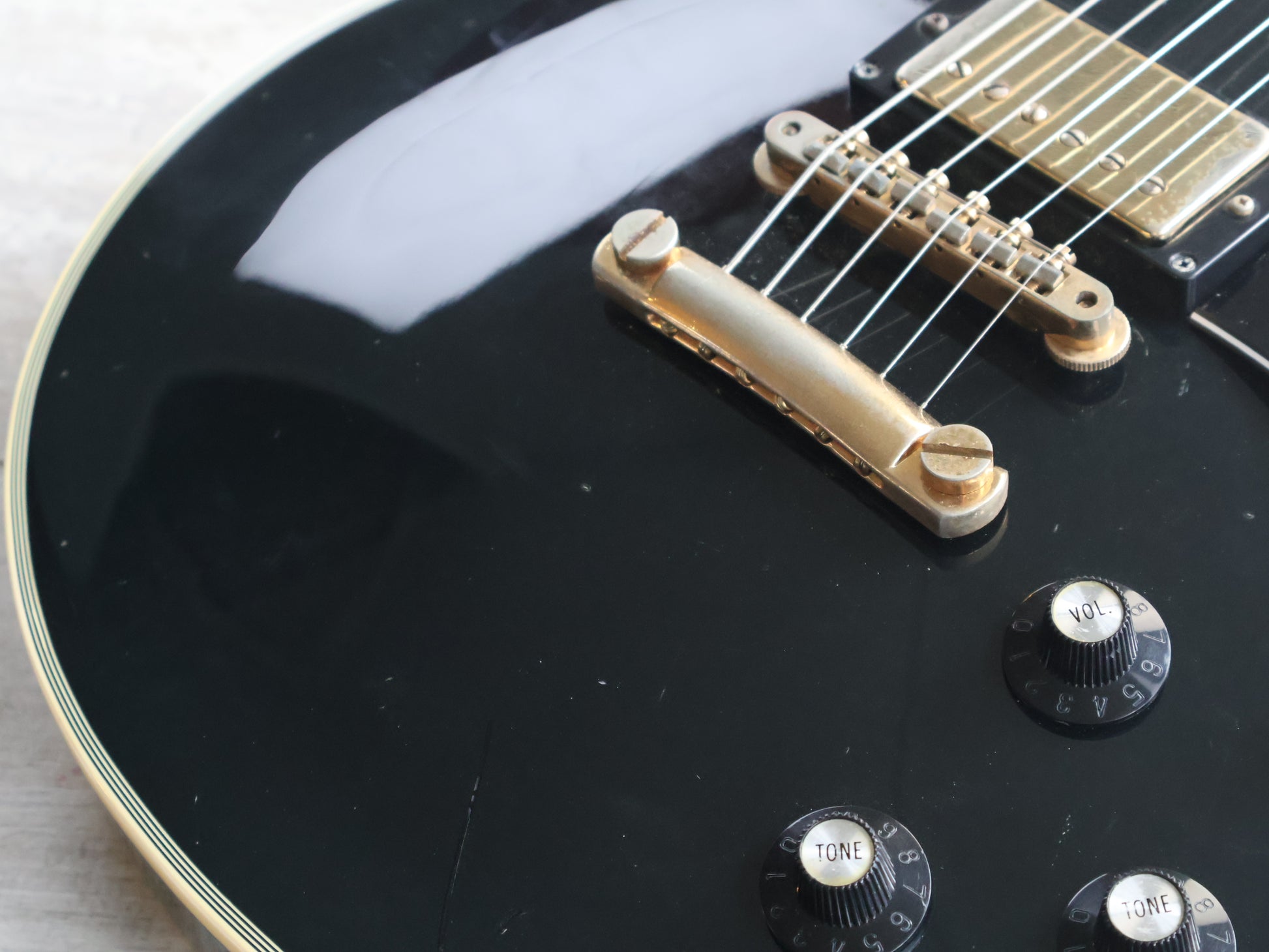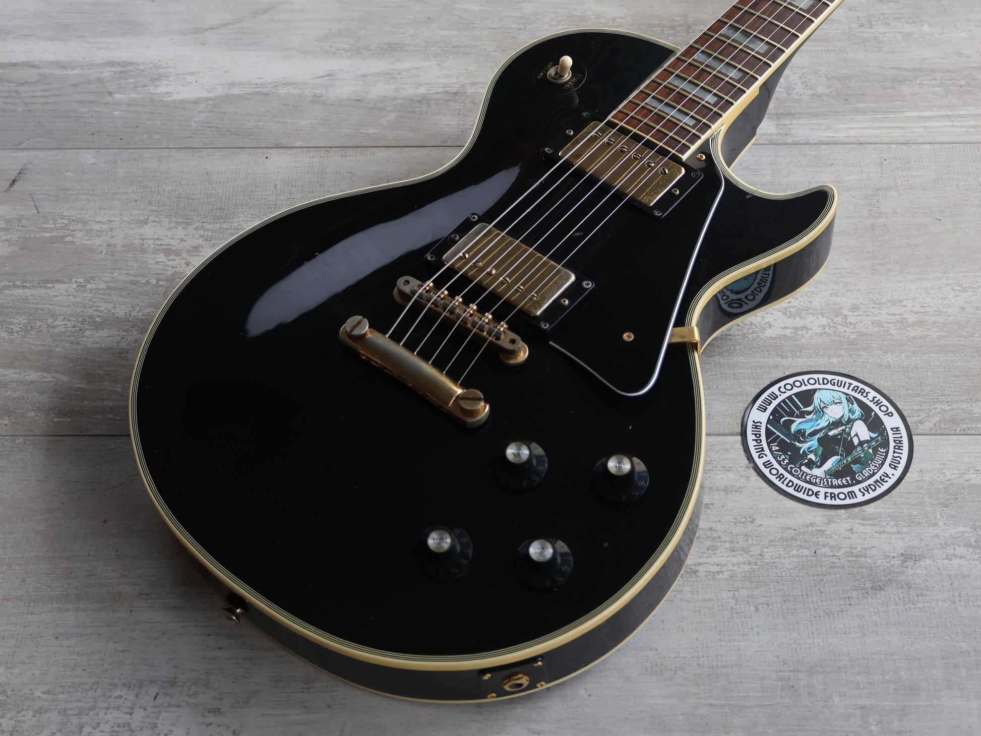 Made by the Fujigen factory in 1980, the Greco EG-500C was a mid-range guitar that was clearly a direct response to the '68 Gibson Les Paul Custom. Solid carved maple top with a solid mahogany body, slim 60's style mahogany neck with a bound 22 fret rosewood fingerboard (43mm nut width, 628mm scale length), it weighs a reasonable 4.2kg's.
