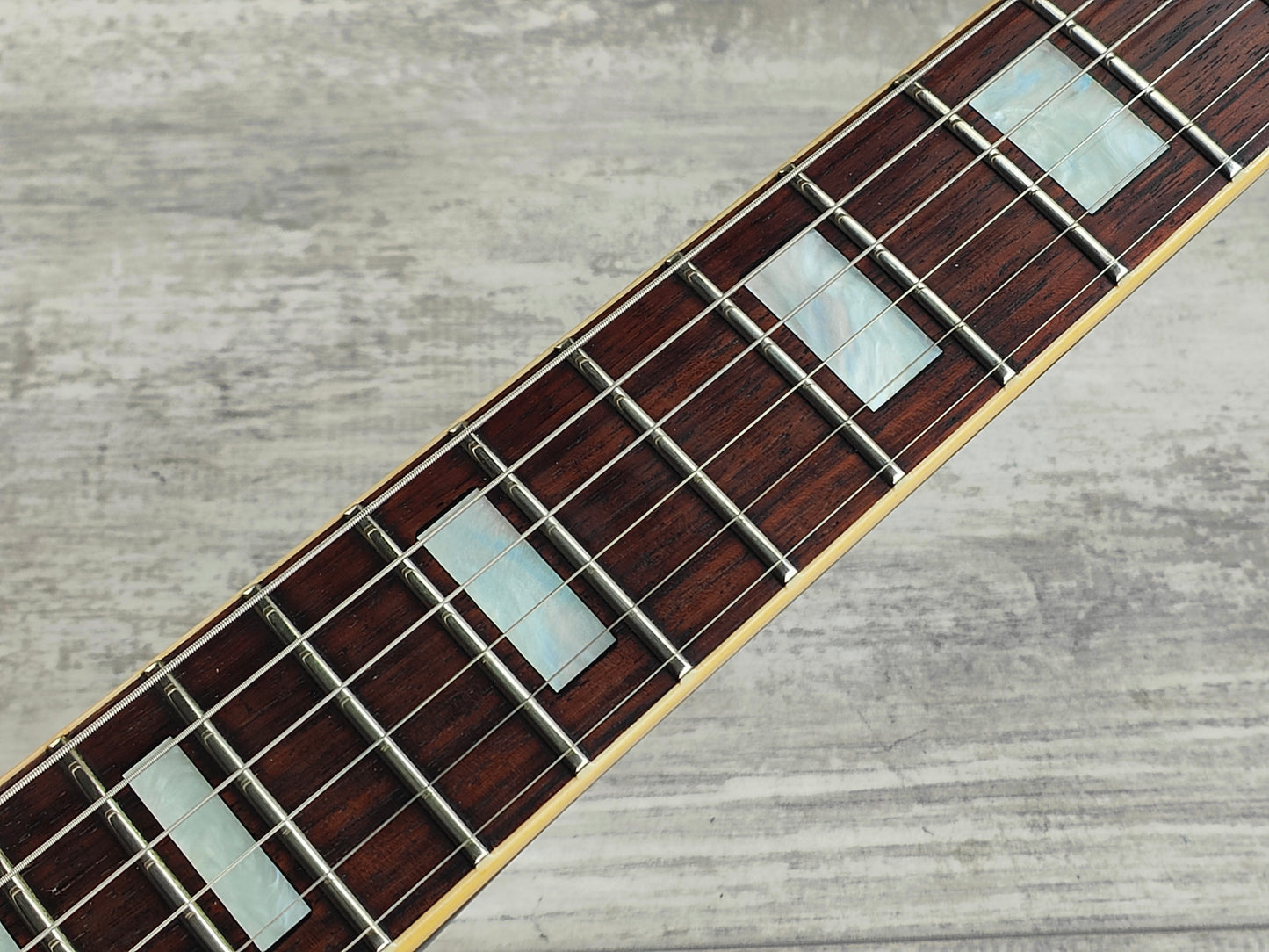 Made by the Fujigen factory in 1980, the EG-600P was an unofficial Peter Frampton model made by Greco. With Greco's "original" headstock design that was aimed at avoiding any kind of legal issues, it's built with a mahogany body, maple top, slim 60's neck profile, a bound rosewood fingerboard and weighs a beefy 4.5kg's. Loaded with three original Maxon branded humbuckers, unbranded replacement tuners and Japanese hardware along with the original pots and wiring.