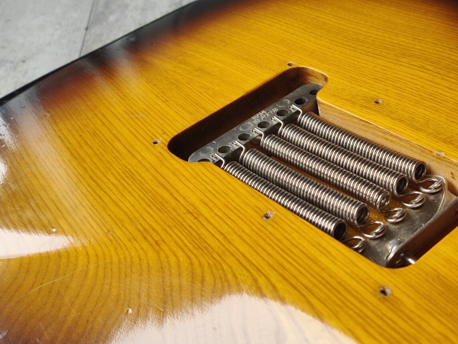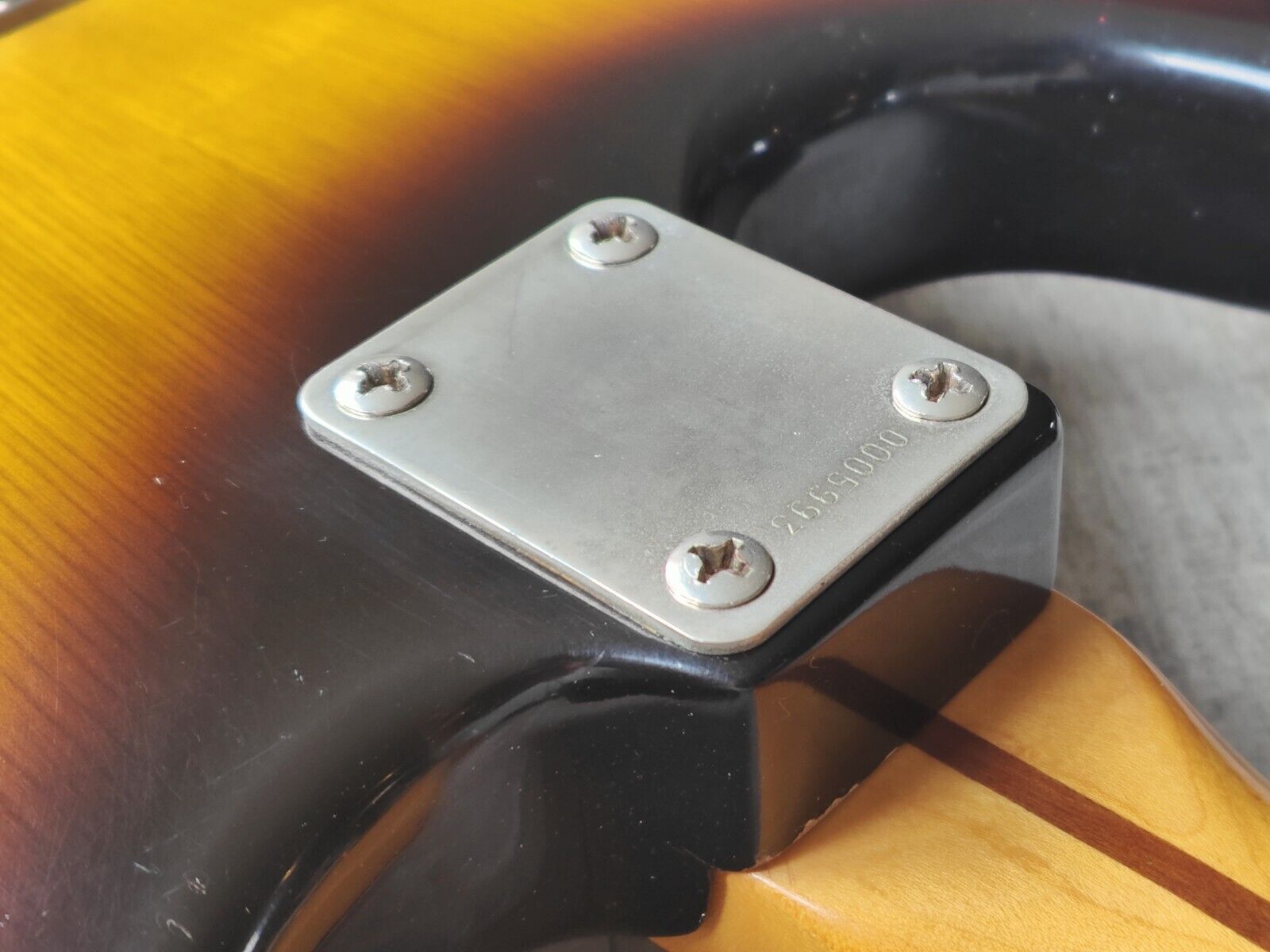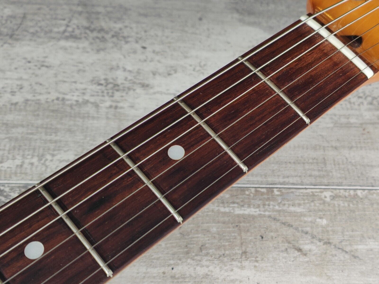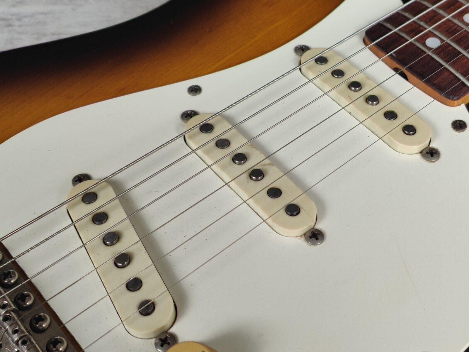 Made in Japan in 1980, this is one of the professional grade Springy Sound models made by Tokai. Two-piece Sen body with a lacquer brown sunburst finish bolted to a very rare* soft V maple neck with a thin veneer rosewood fingerboard (43mm nut width), it weighs 3.6kg's. Loaded with the original pots and wiring, the ST-Vintage alnico single coils have the "E" stamp on them and are controlled by the original three-way selector.