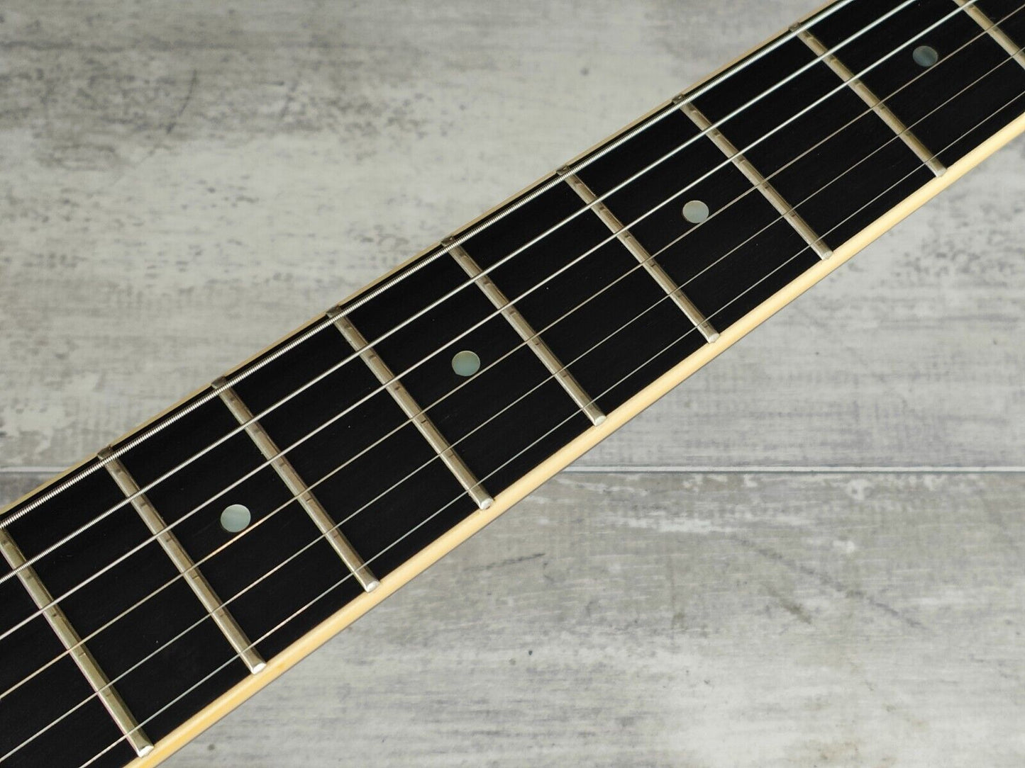 Japanese made in 1980, the SA-1000 was a higher end ES-335 sized model from Yamaha. Bound beech top/back with a maple/spruce centre block, slim C mahogany neck and a bound 22 fret ebony fingerboard (12" radius, 628mm scale length), it weighs a 4.2kg's. Loaded with the original electronics including Yamaha alnico humbuckers and the original Yamaha stamped tuners, it seems to be all original except for a replacement bone nut.