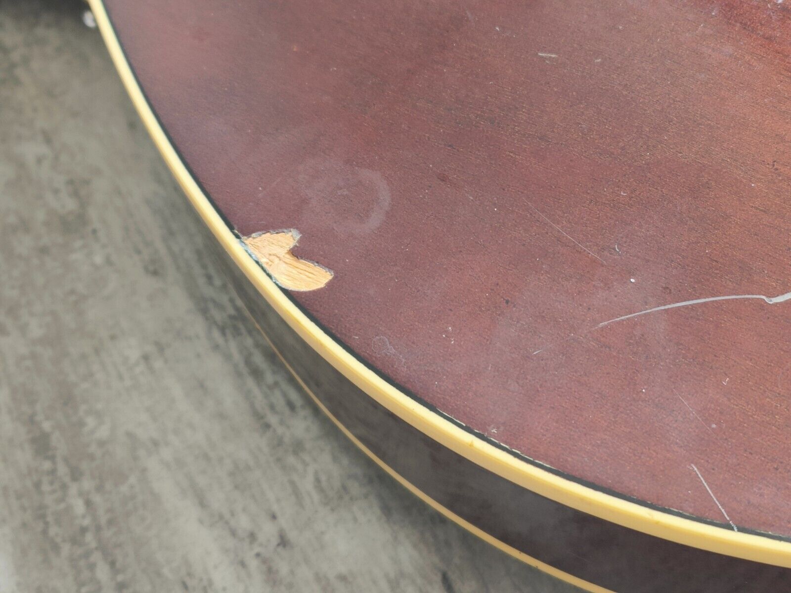 Received a full professional setup prior to listing including a headstock repair as pictured. The previous owner botched the job by installing screws that we removed and plugged prior to the area being clamped/glued so it's rock solid. The whole are around the repair was then buffed, sanded and polished so it's undetectable to the touch. Plays and sounds great with a reasonable amount of life in the frets and a straight neck with an adjustable truss.