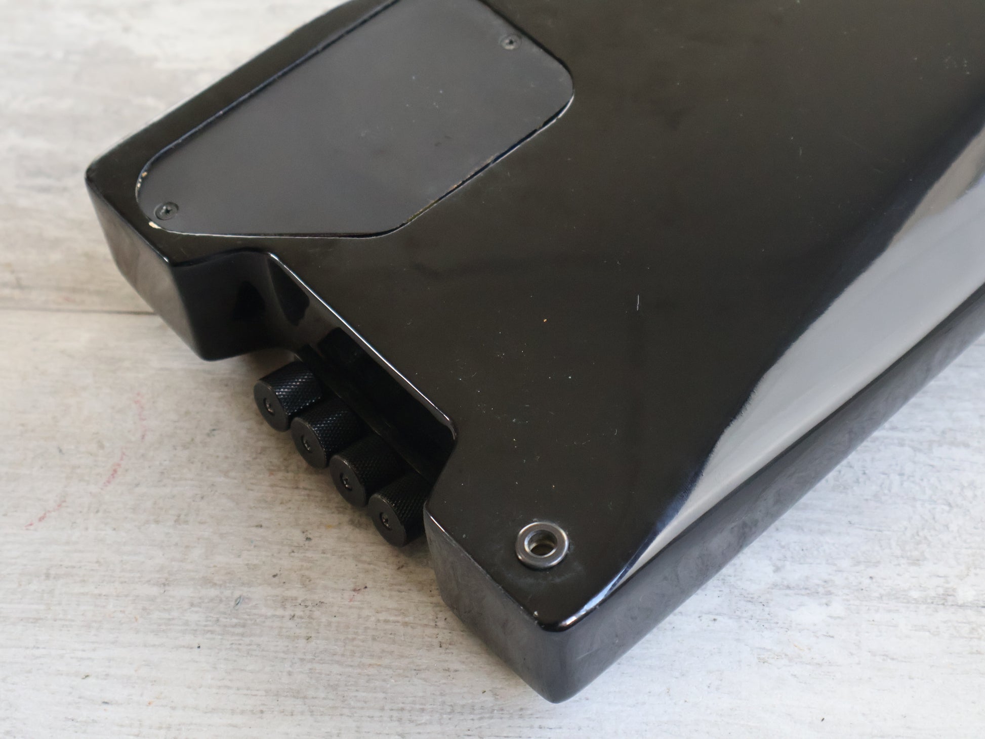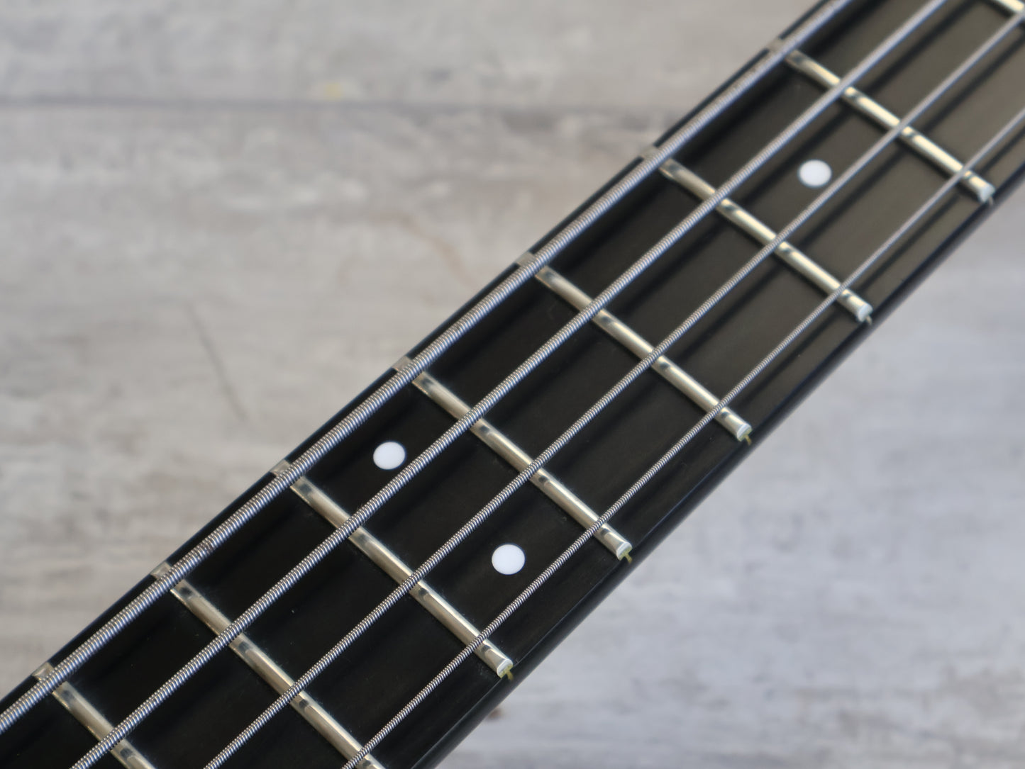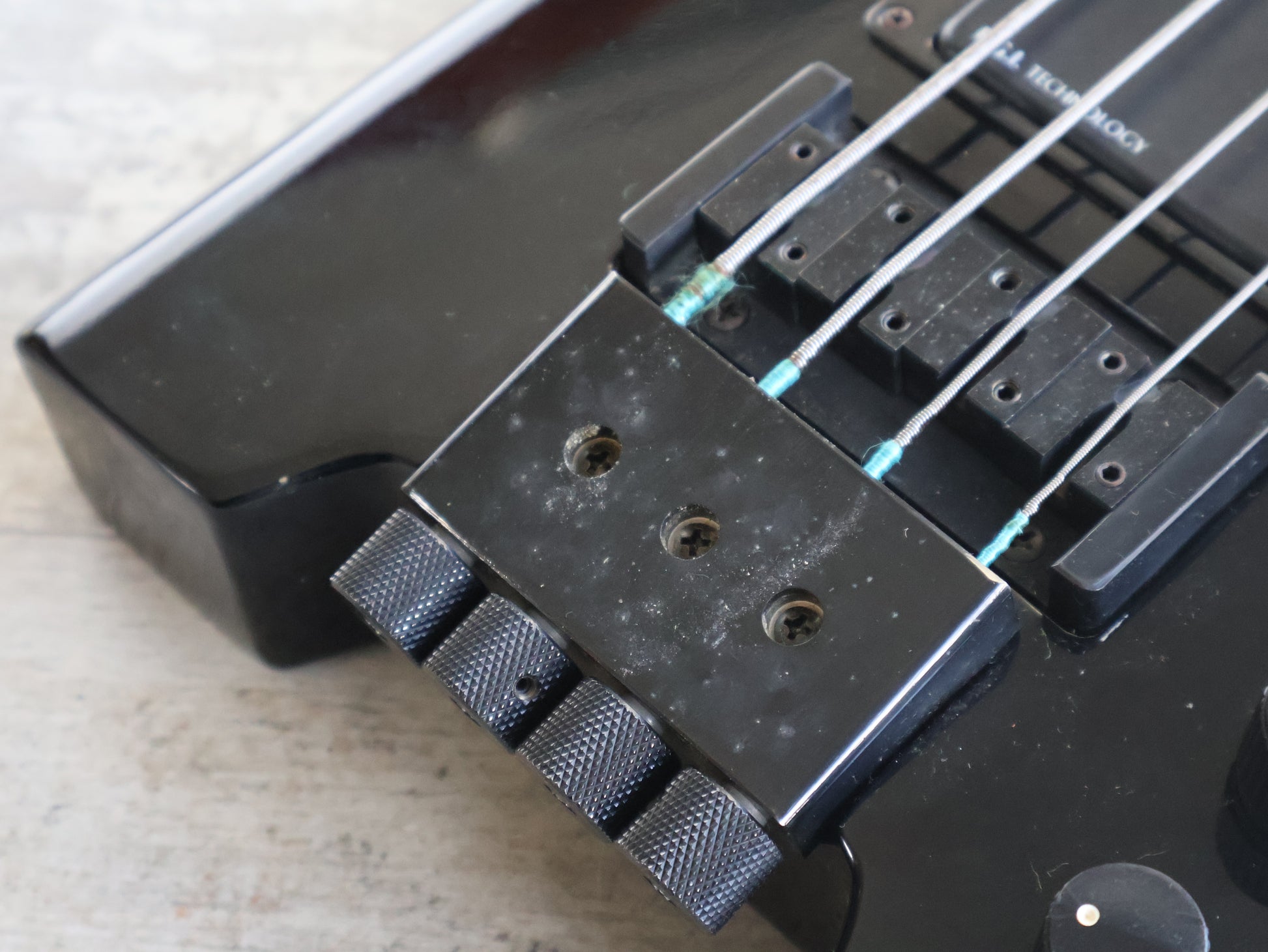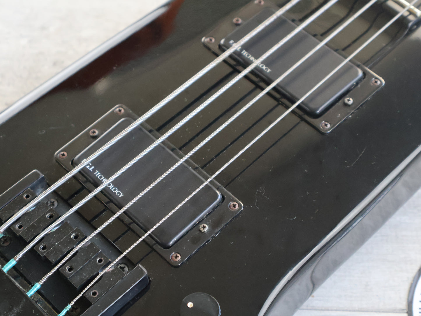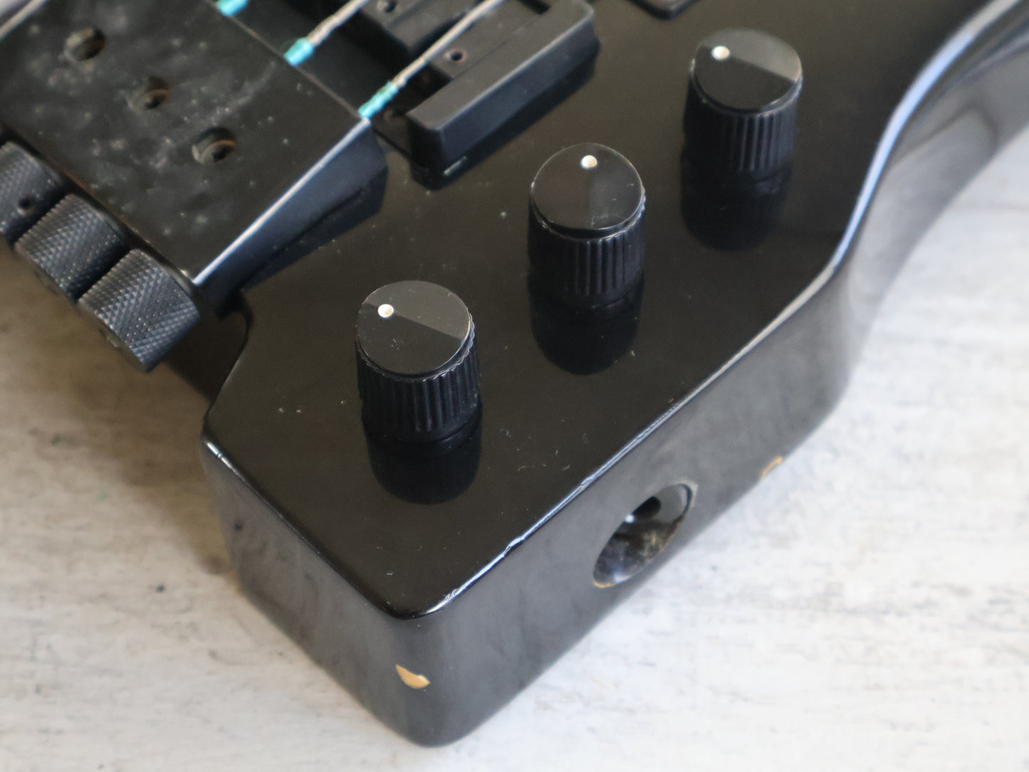 Made in Japan in the late 1980's (but you could have guessed that just looking at it), the THB-115 was a the high end headless model bass from Fernandes. Glossy black finish on a slim alder body with a graphite neck and a 24 fret black phenolic fingerboard (34" scale length), it weighs 3.2kg's. Loaded with the original active FGI Technology humbucker style pickups (bridge pickup not working but it's a standard humbucker size so it's easily replaced) controlled by independent volumes and a master tone knob.