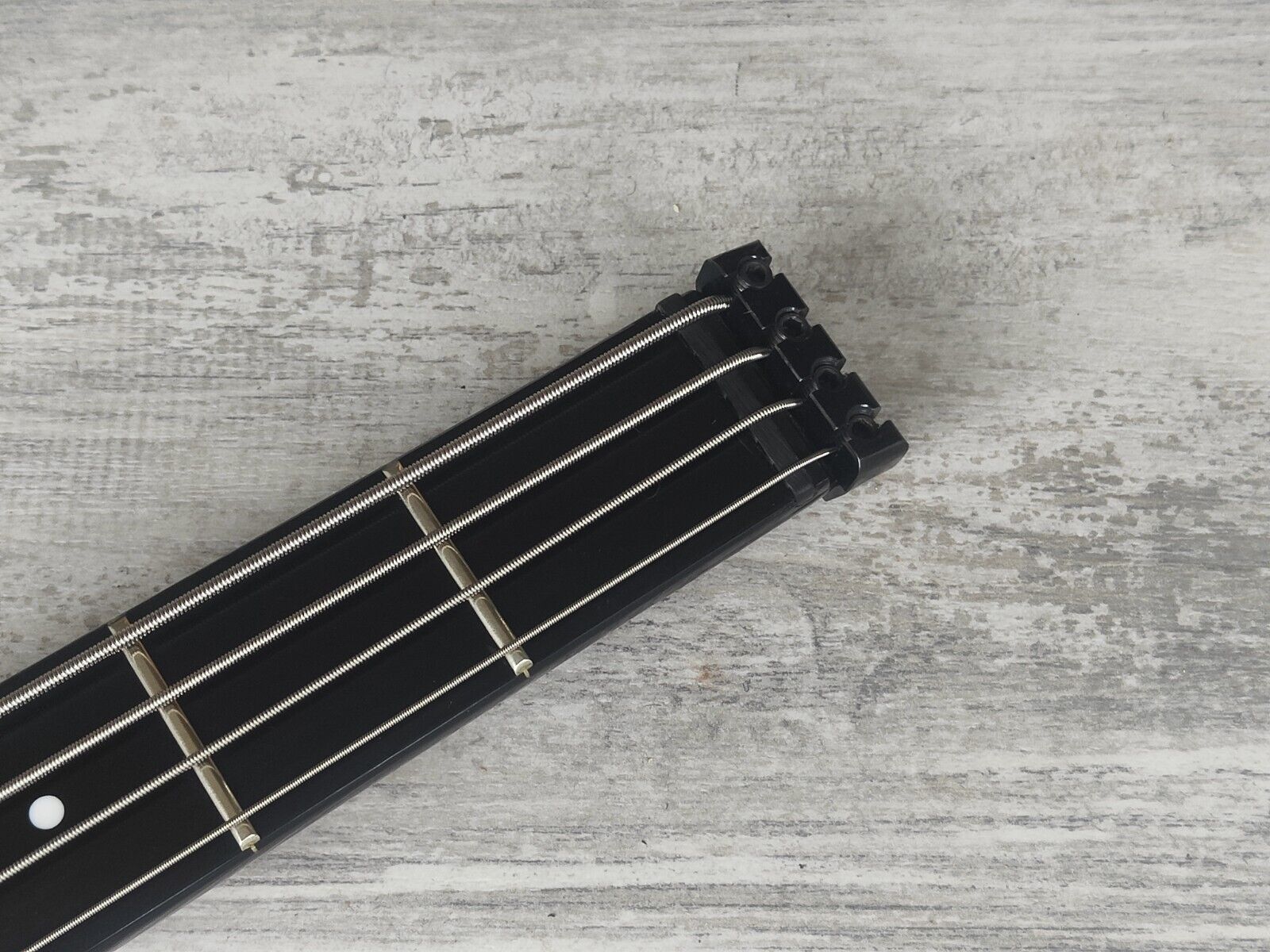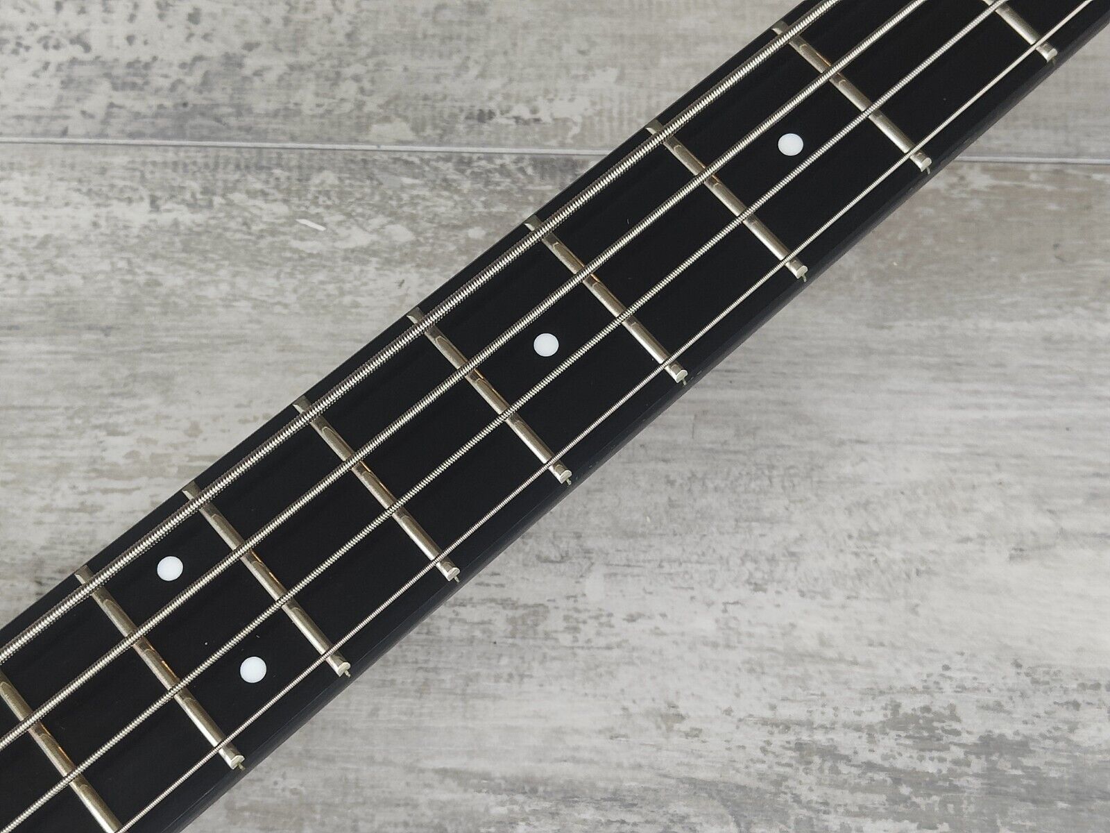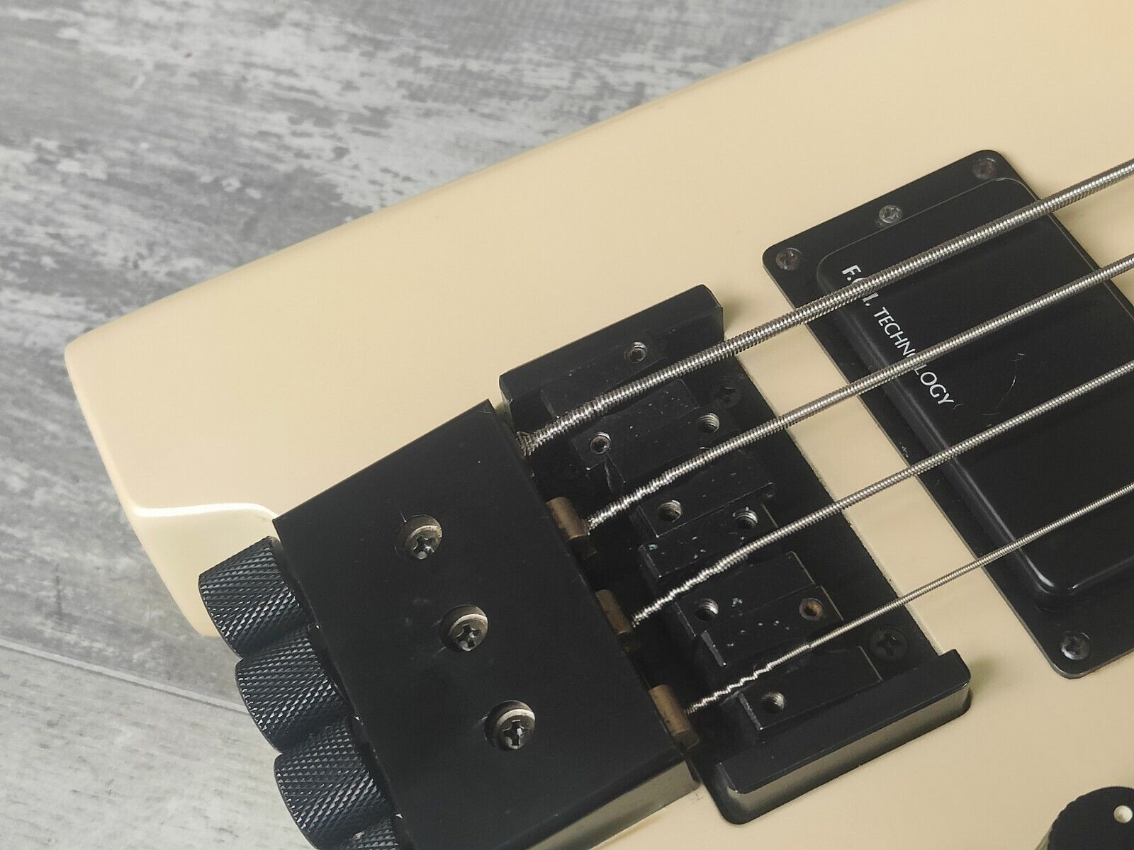 Made in Japan in the late 1980's (but you could have guessed that just looking at it), the THB-115 was a the high end headless model bass from Fernandes. Pearl white finish on a slim alder body with a graphite neck and a 24 fret black phenolic fingerboard (34" scale length), it weighs 3.2kg's. Loaded with the original active FGI Technology humbucker style pickups controlled by independent volumes and a master tone knob.